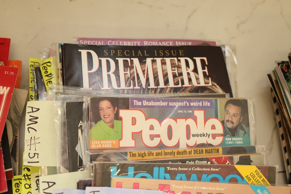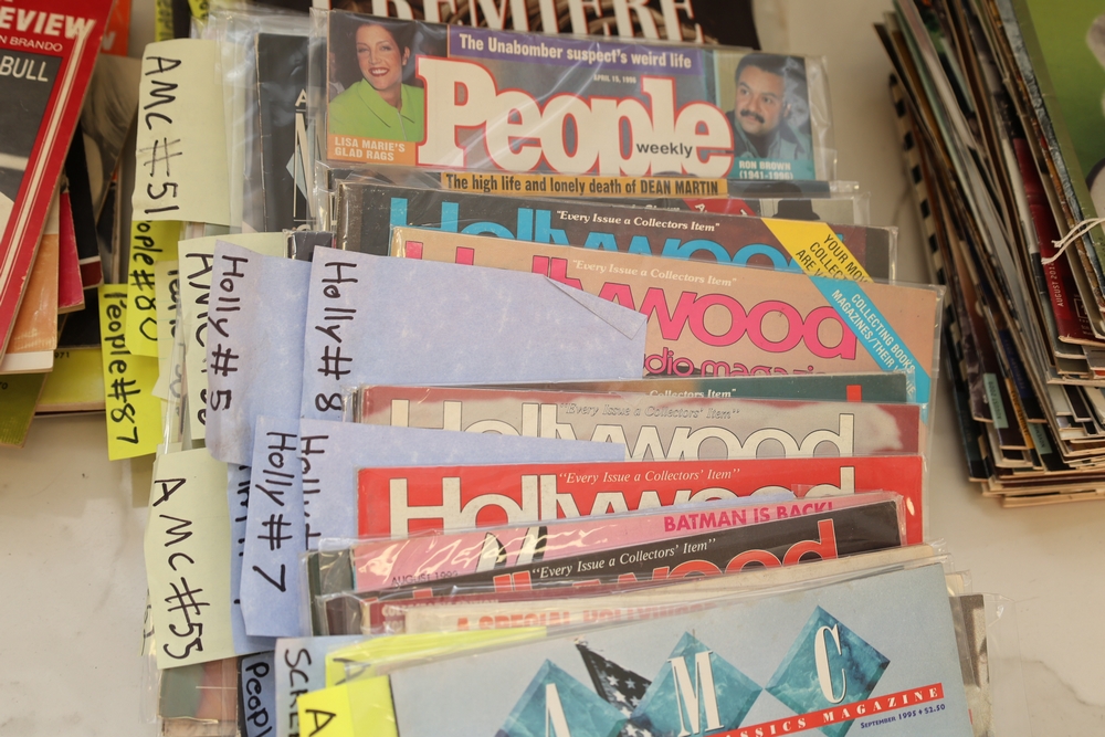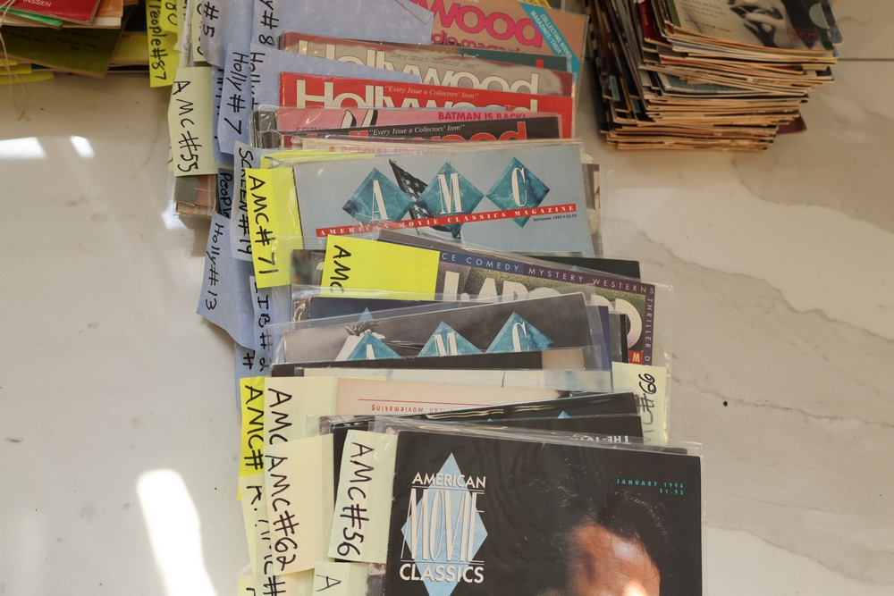 Group of approx 55 film and entertainment magazines including American Movie Classics Magazine, Hollywood Studio Magazine, People Weekly, and Premiere Special Issue, with visible covers including American Movie Classics January 1994 featuring Gregory Peck in The Snows of Kilimanjaro and People Weekly April 15, 1996 referencing Dean Martin and the Unabomber suspect story.