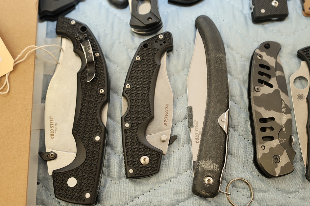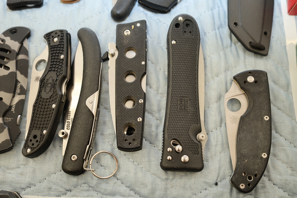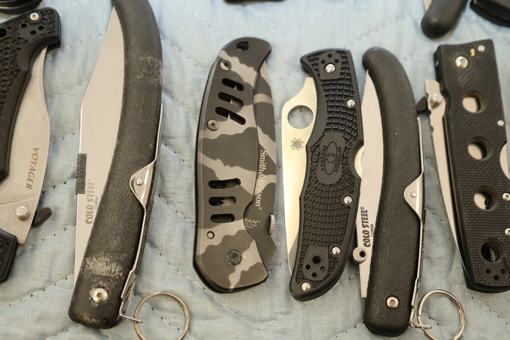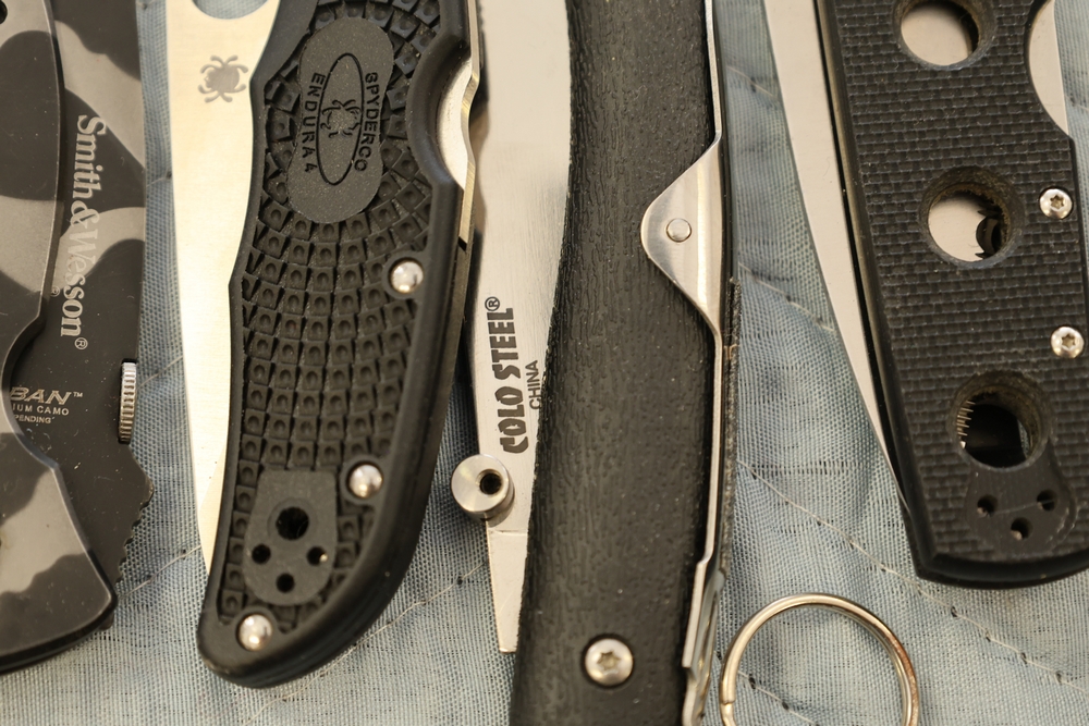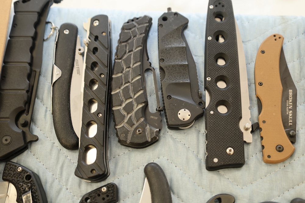 Group of folding knives including examples marked Cold Steel Voyager, Cold Steel Rajah II, Smith and Wesson Extreme Ops, Spyderco Endura, Boker Plus Jim Wagner Reality Based Blade, Willumsen Urban Tactical, and knife marked Eland, together with additional folding knives and a fixed blade knife in black sheath marked Cold Steel.
