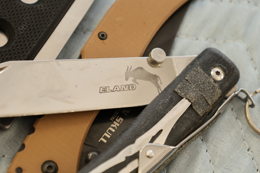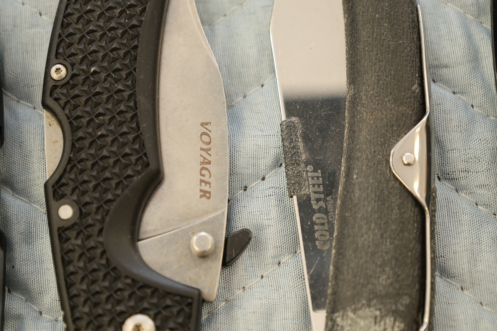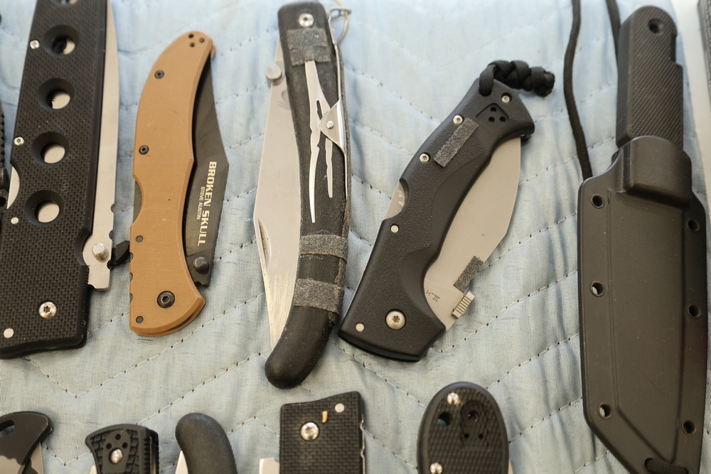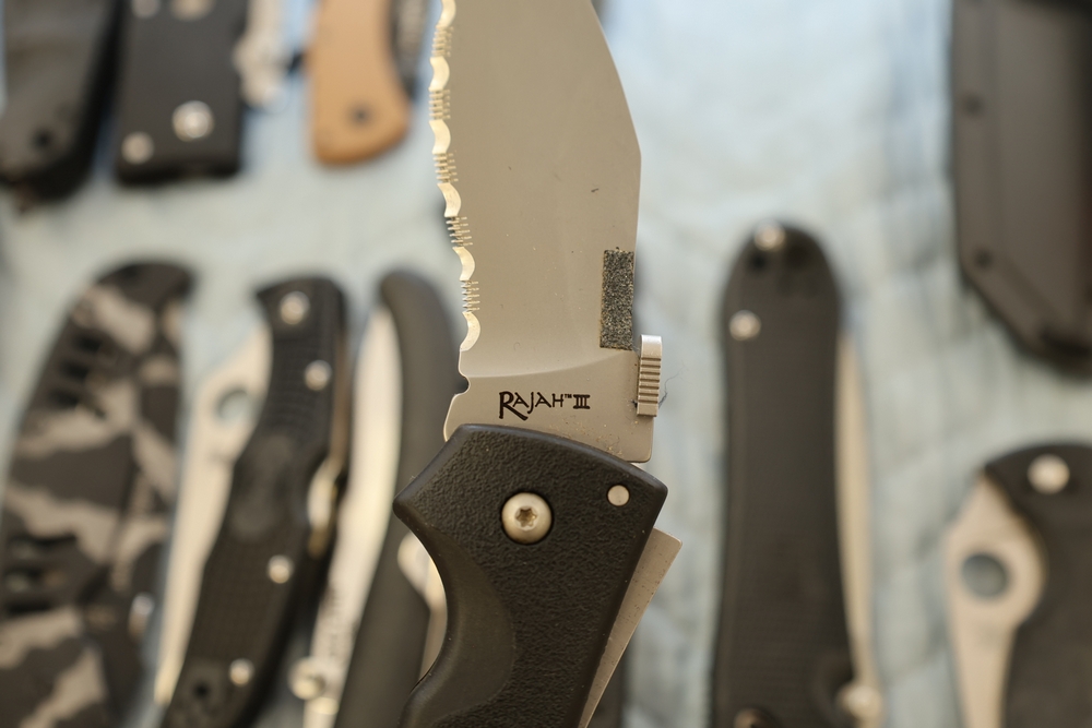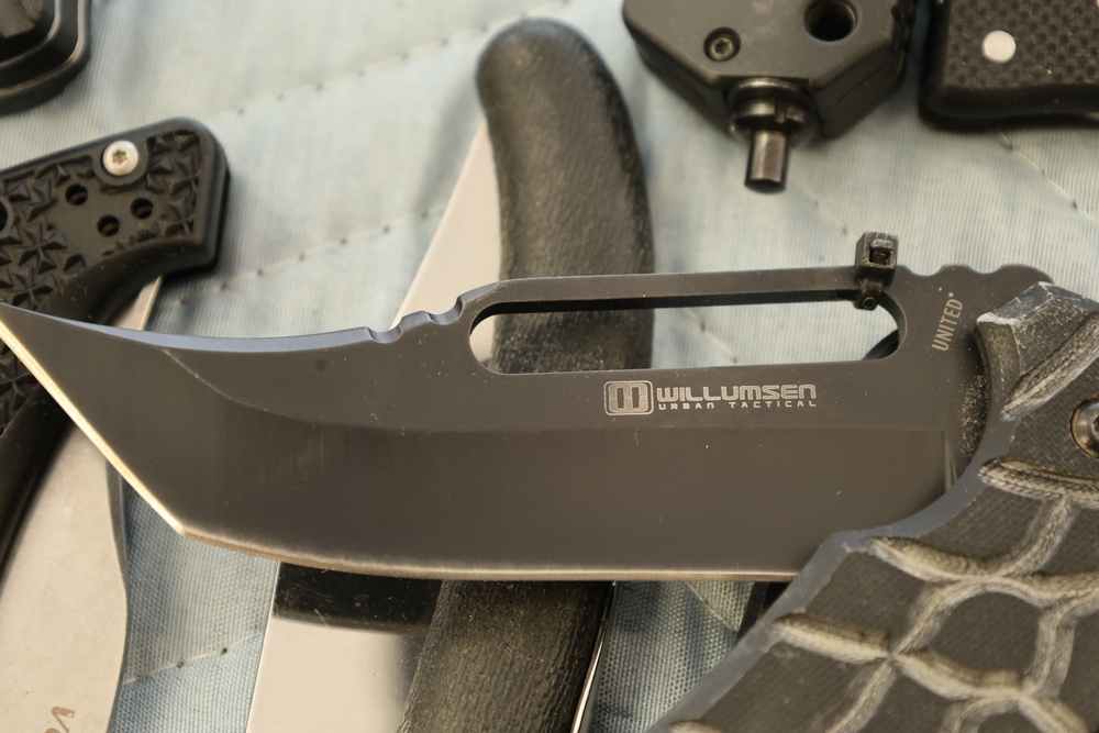 Group of folding knives including examples marked Cold Steel Voyager, Cold Steel Rajah II, Smith and Wesson Extreme Ops, Spyderco Endura, Boker Plus Jim Wagner Reality Based Blade, Willumsen Urban Tactical, and knife marked Eland, together with additional folding knives and a fixed blade knife in black sheath marked Cold Steel.