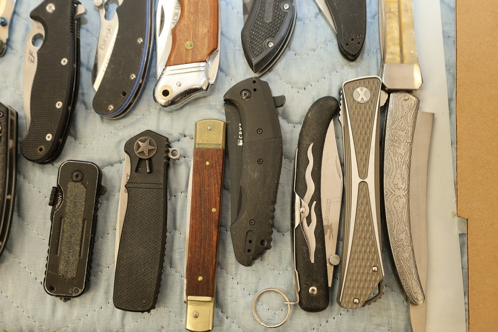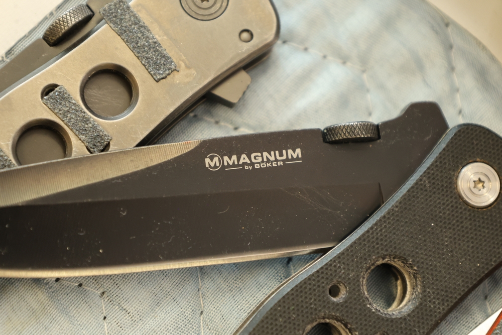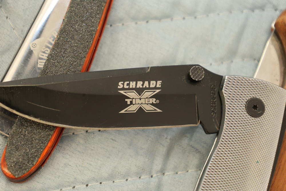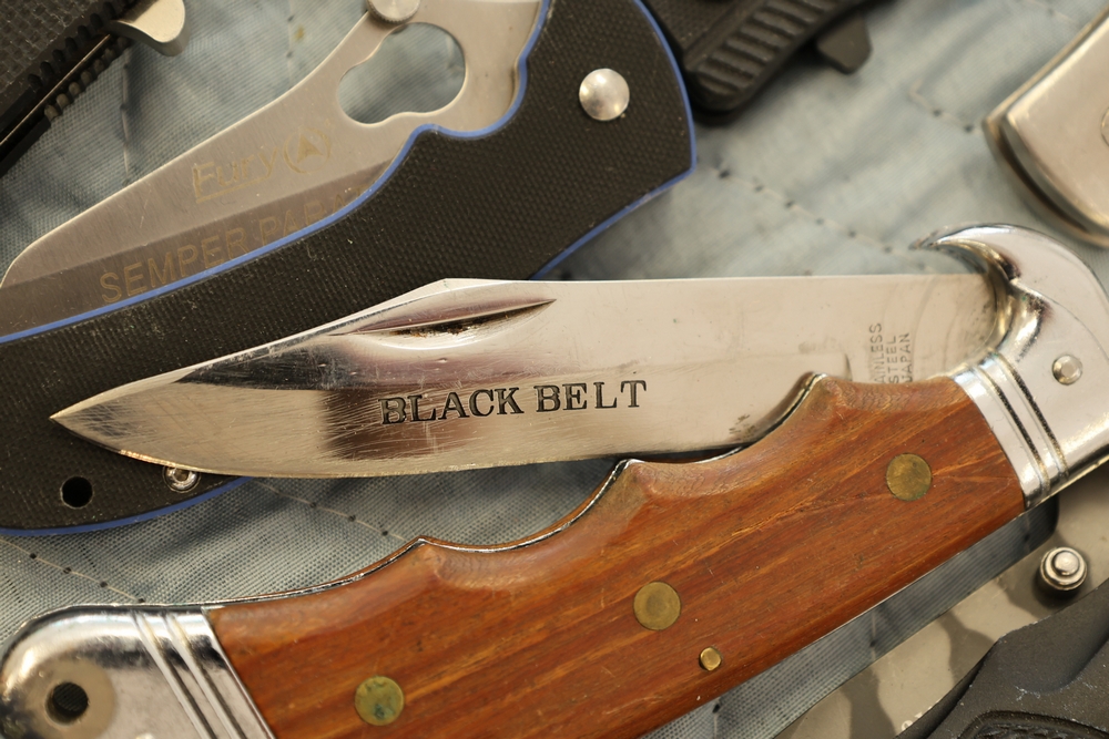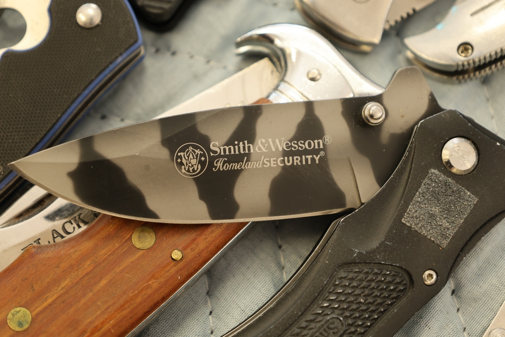 Group of folding knives including examples marked Schrade Timer, Magnum by Boker, Fury Semper Paratus, Smith and Wesson Homeland Security, and knife marked Black Belt Stainless Steel Japan, together with additional folding knives including examples with wood handles, textured metal handles, and patterned metal handles.