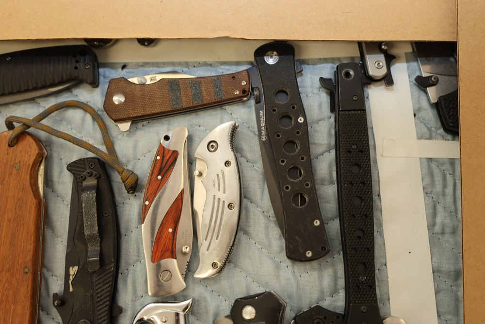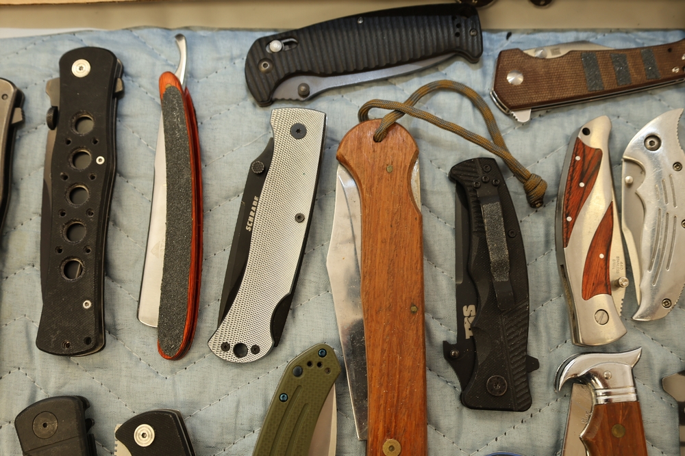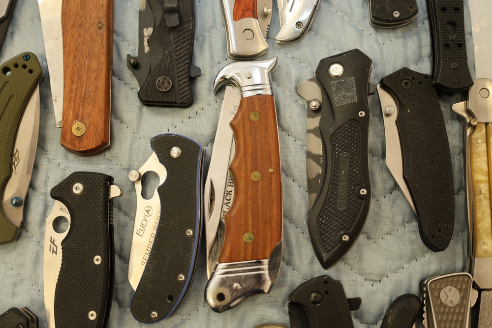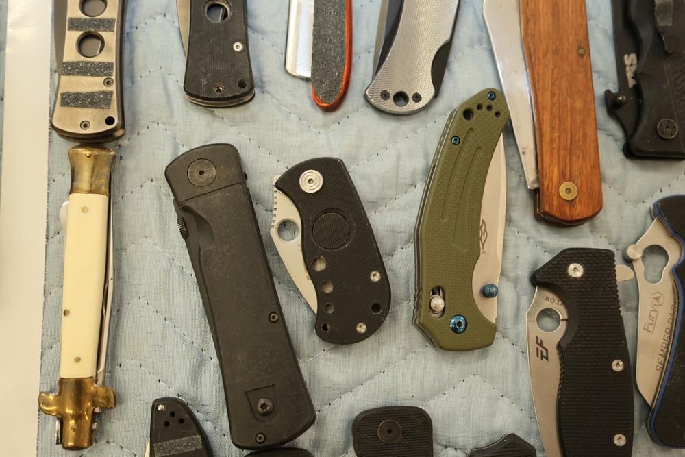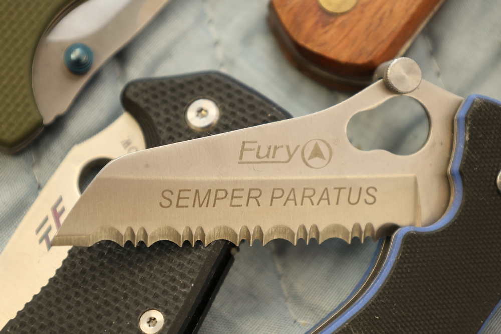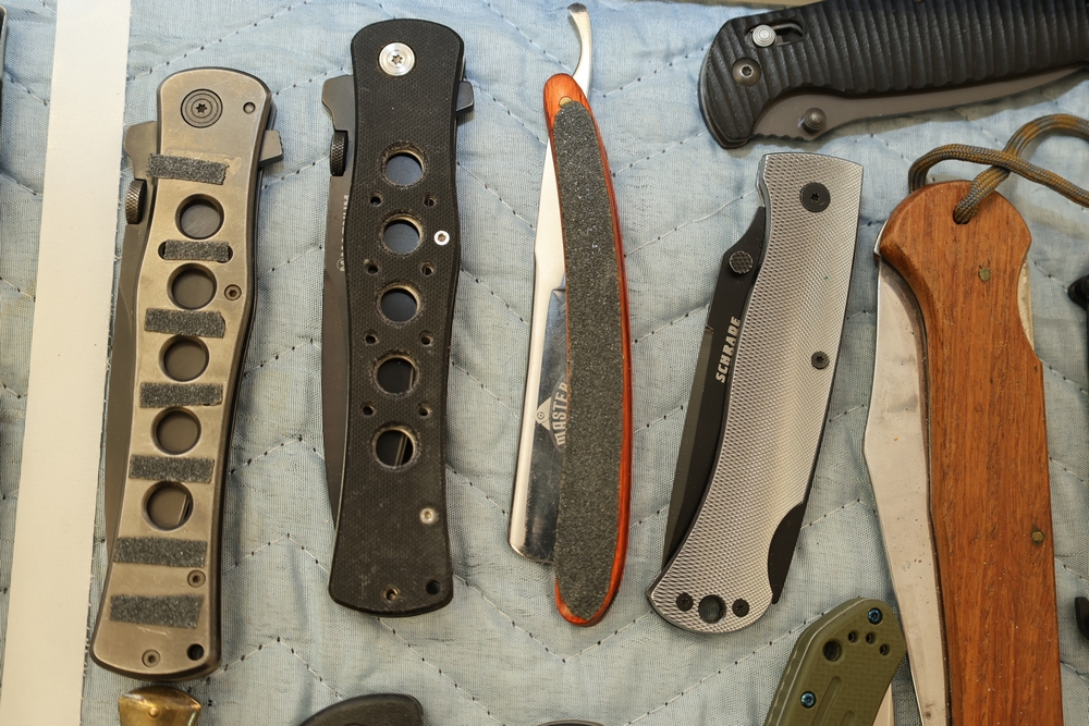 Group of folding knives including examples marked Schrade Timer, Magnum by Boker, Fury Semper Paratus, Smith and Wesson Homeland Security, and knife marked Black Belt Stainless Steel Japan, together with additional folding knives including examples with wood handles, textured metal handles, and patterned metal handles.