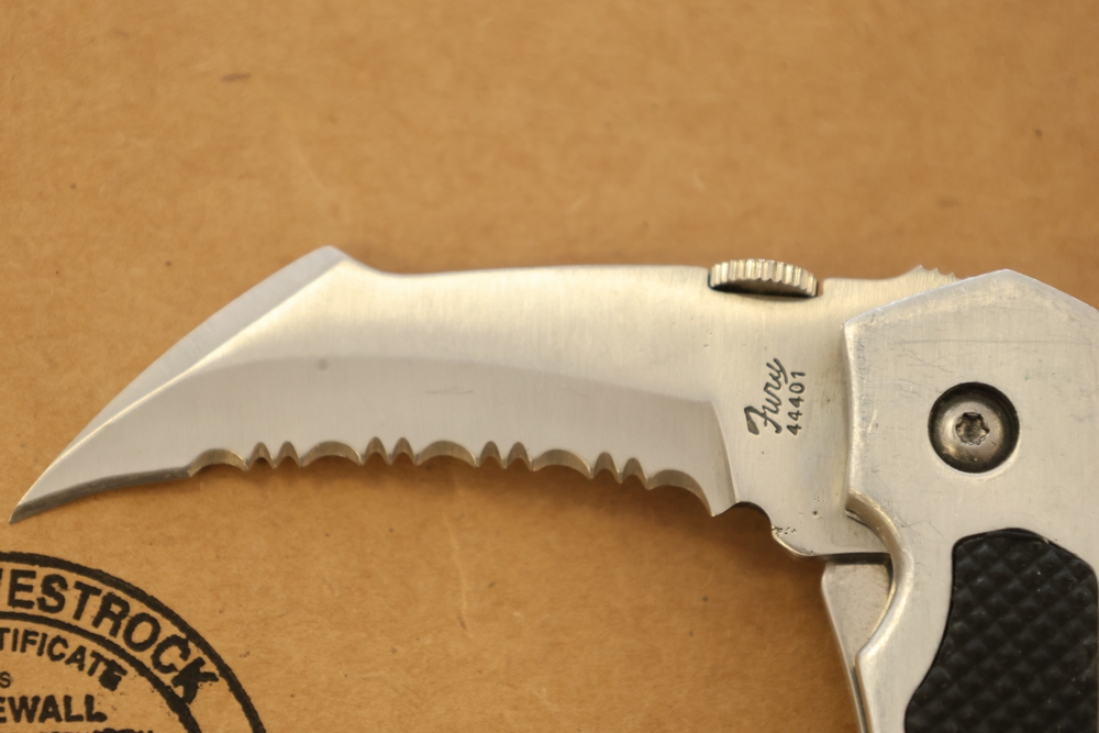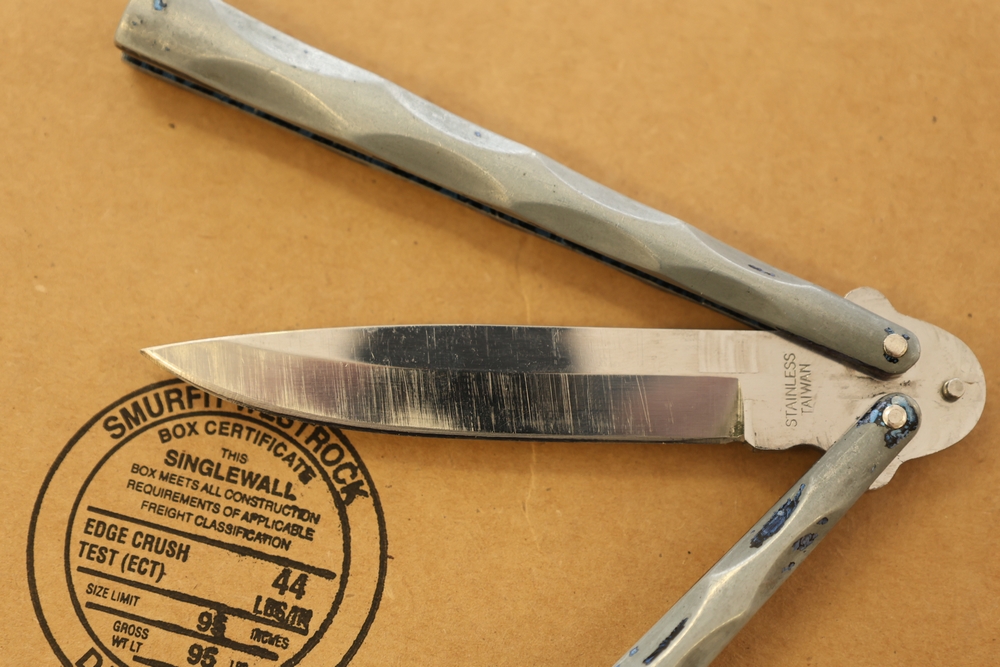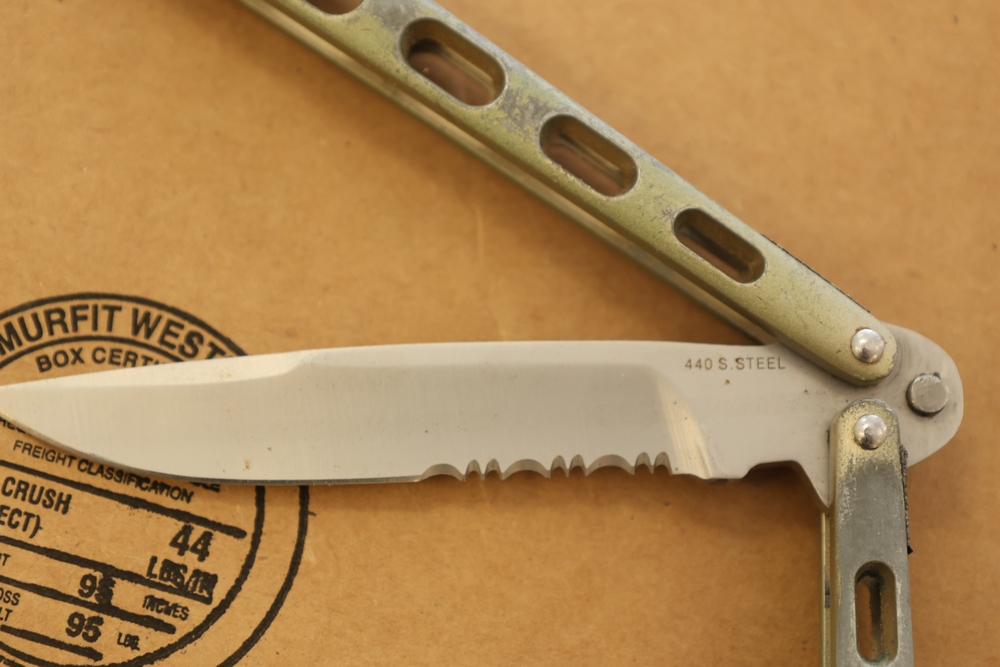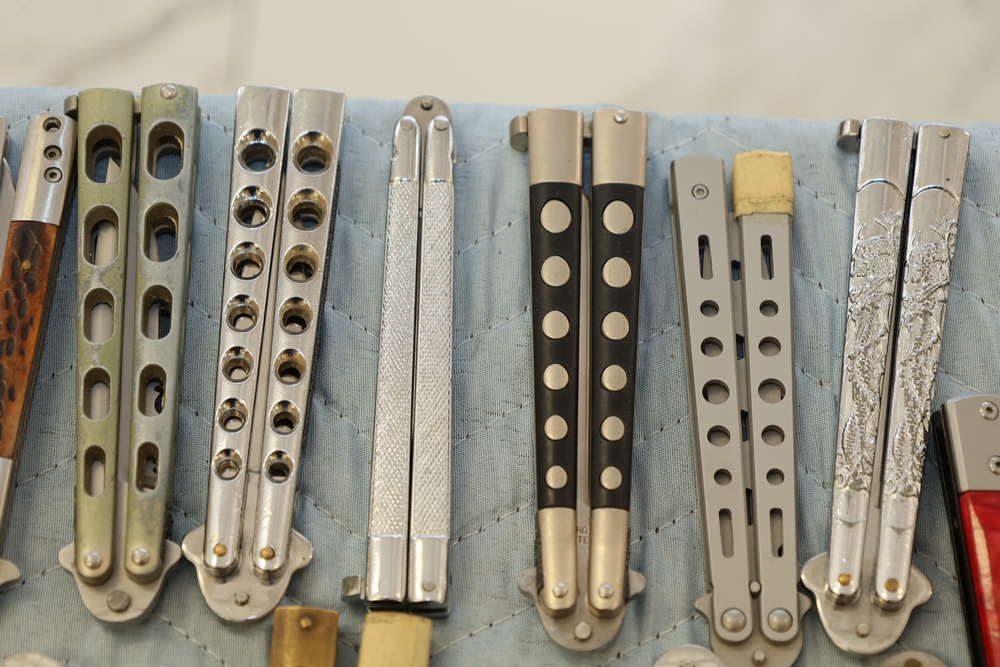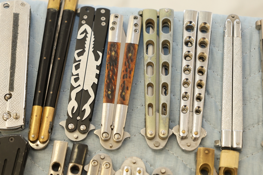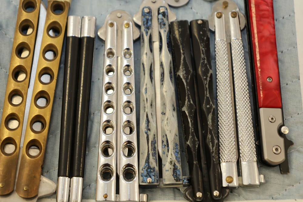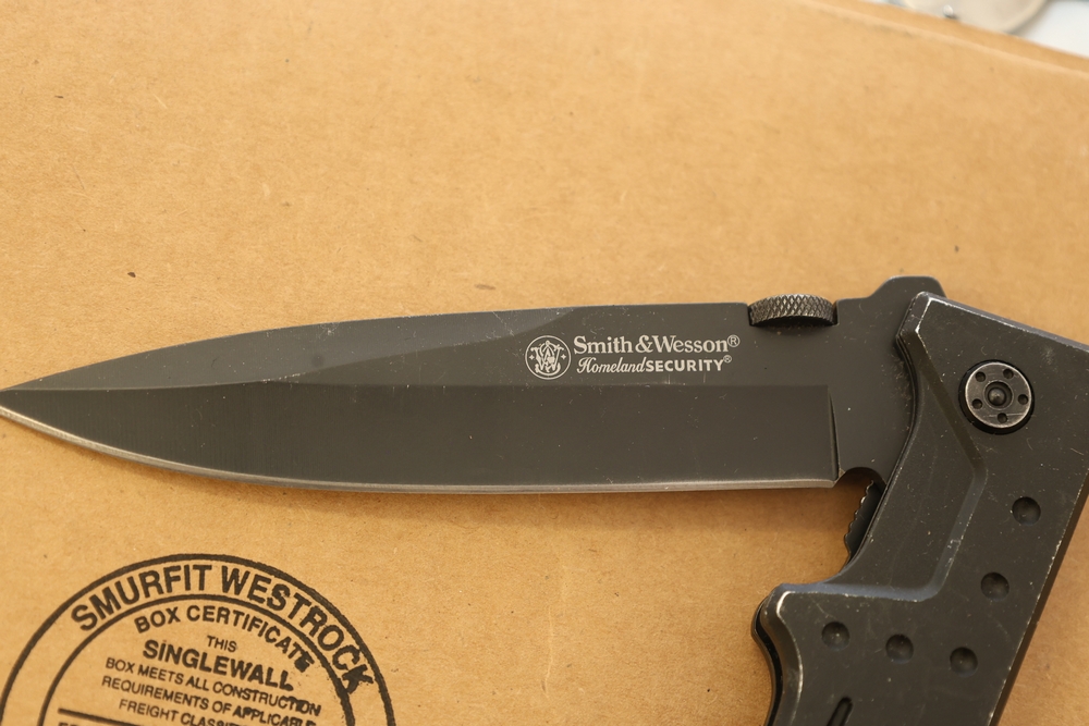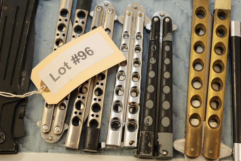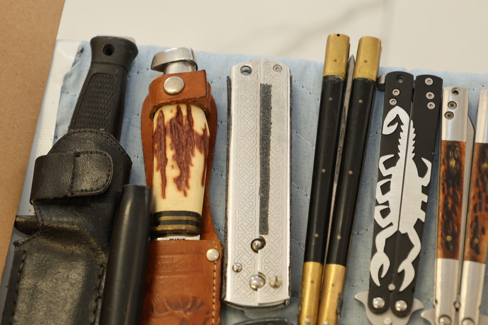 Group of knives including Smith and Wesson Homeland Security folding knife, Fury folding knife marked Semper Paratus, folding knife marked Black Belt Stainless Steel Japan, Schrade Timer folding knife, Magnum by Boker folding knife, additional folding knives with wood and textured metal handles, fixed blade knife in leather sheath with antler style handle, multiple butterfly style knives with metal handles in various finishes, baton style sticks, and knife sheaths.