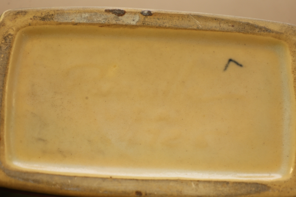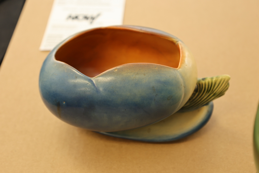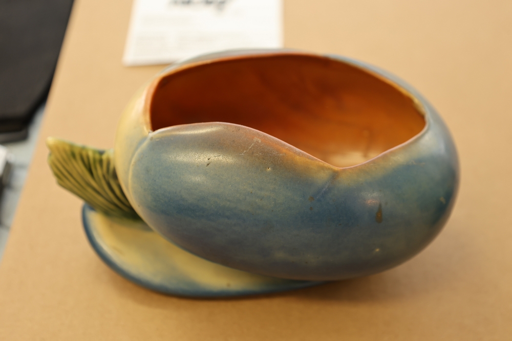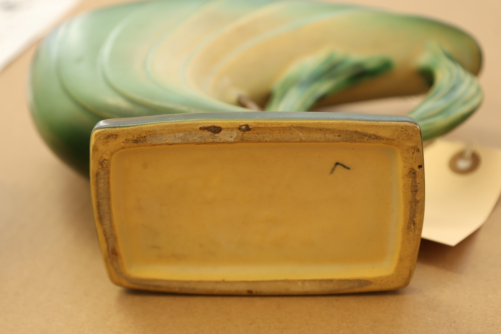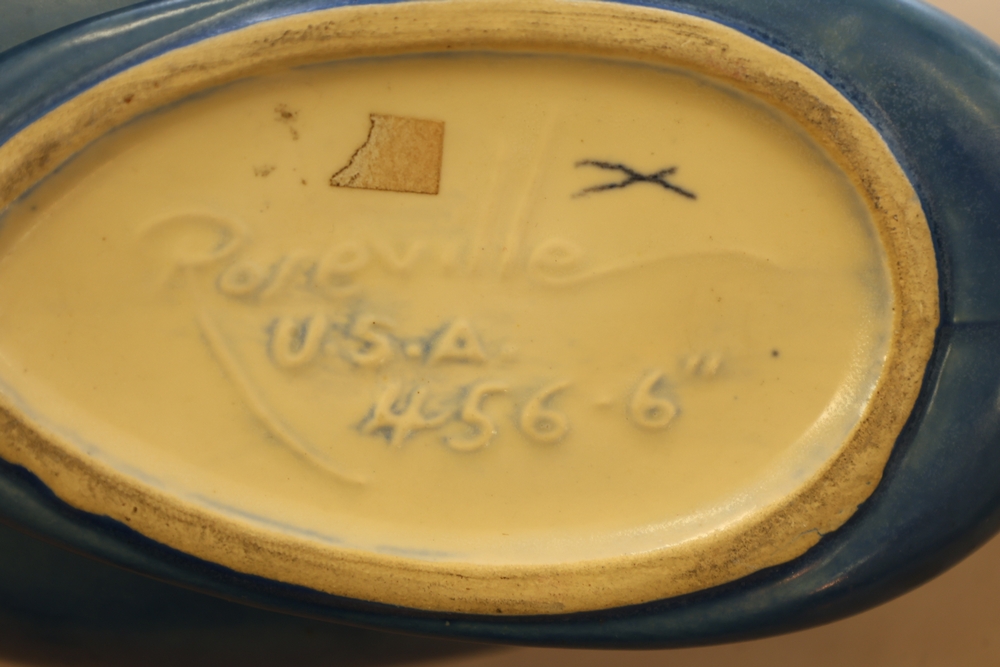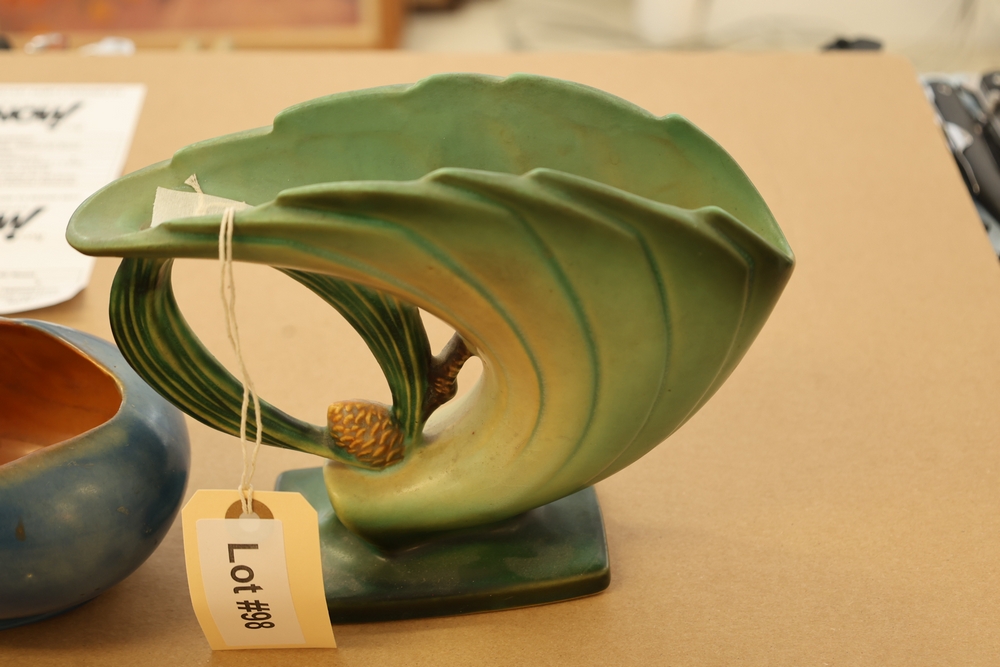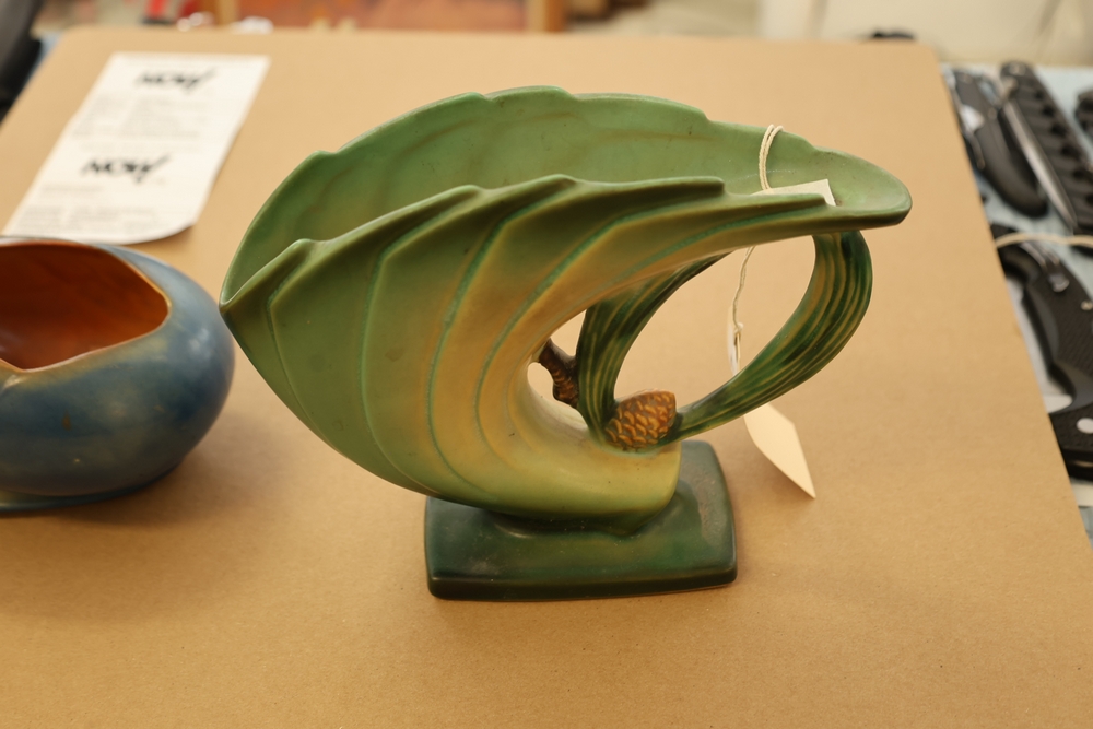 Two Roseville Pottery pieces including a blue and green bowl with leaf form base marked Roseville USA 456-6 on underside and a green cornucopia form vase with leaf handle and acorn detail on base.
