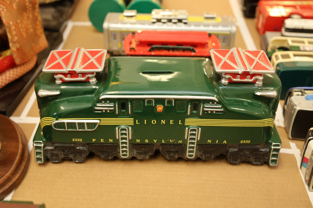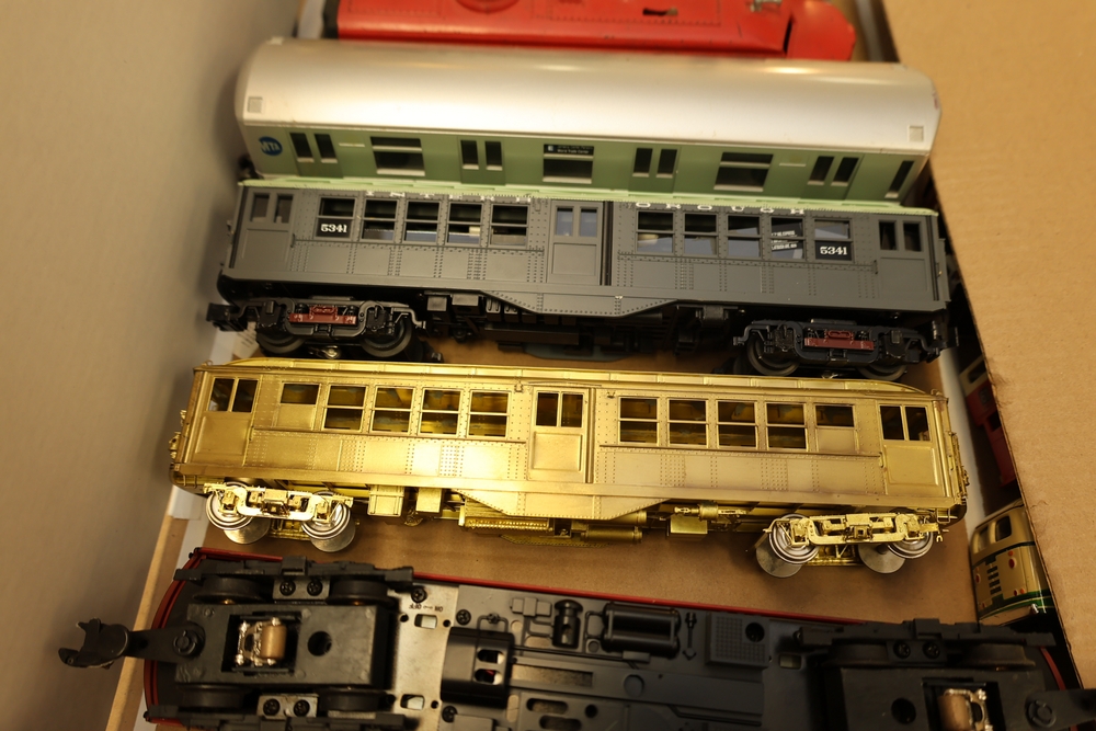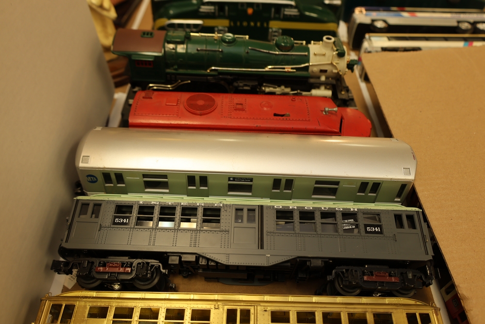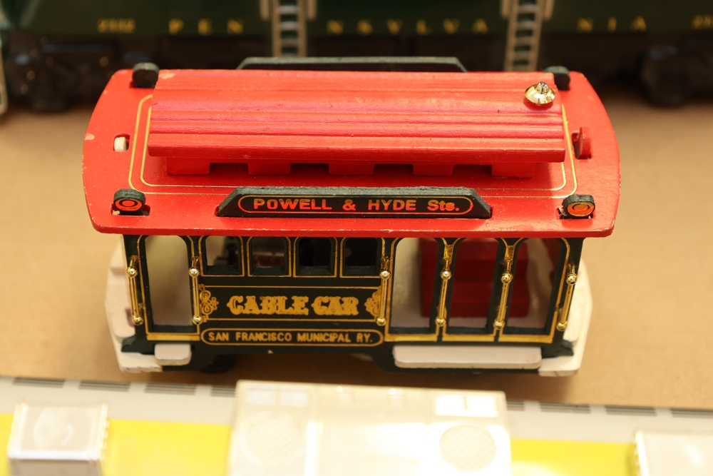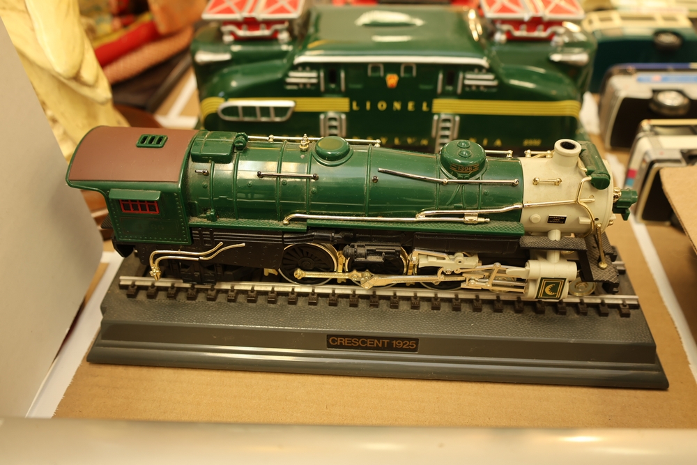 Group of model railroad and train related items including San Francisco cable car model marked Powell and Hyde Sts and San Francisco Municipal Ry, Lionel Diesel Switcher O scale motor unit, LO V Subway Car B marked 6341 New York City Transit subway car models including example marked Local 6749, brass subway style car body, Crescent 1925 locomotive display model on base, New York Central steam locomotive and tender, additional small steam locomotive and tender, and locomotive form telephone marked Telemania Model Locomotive Phone.