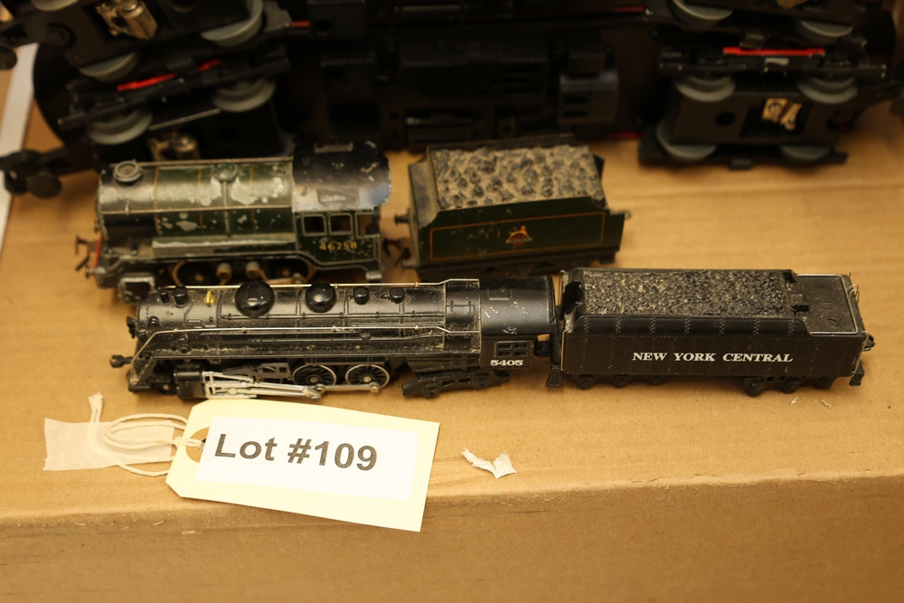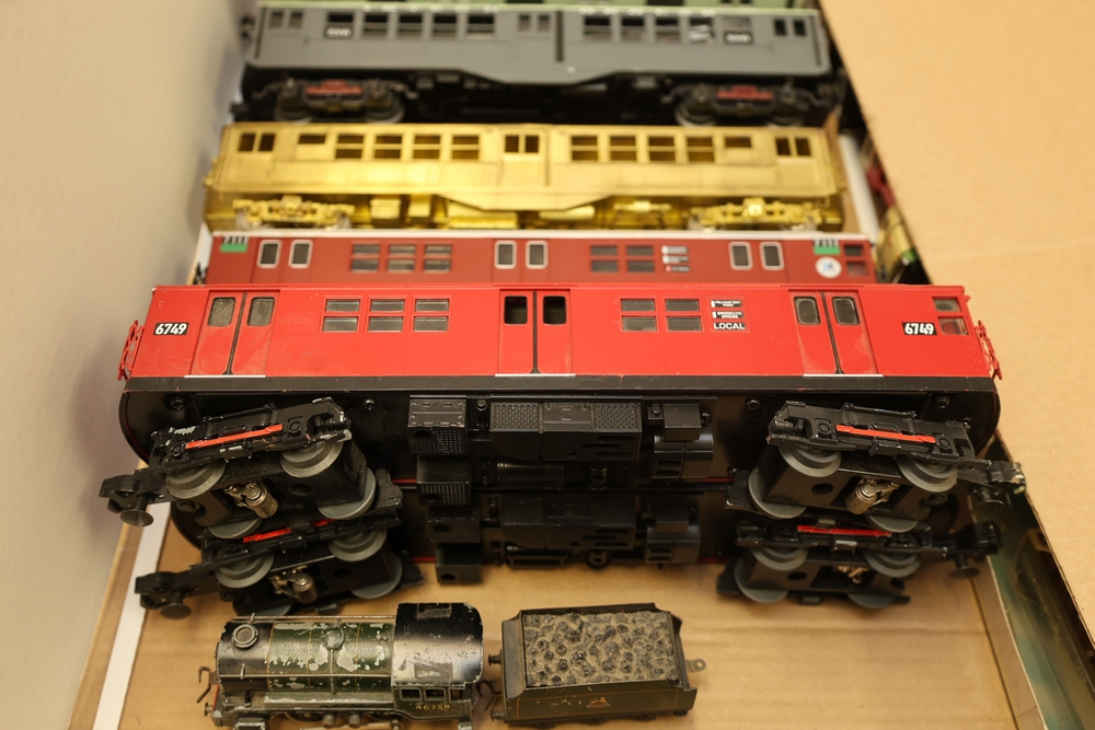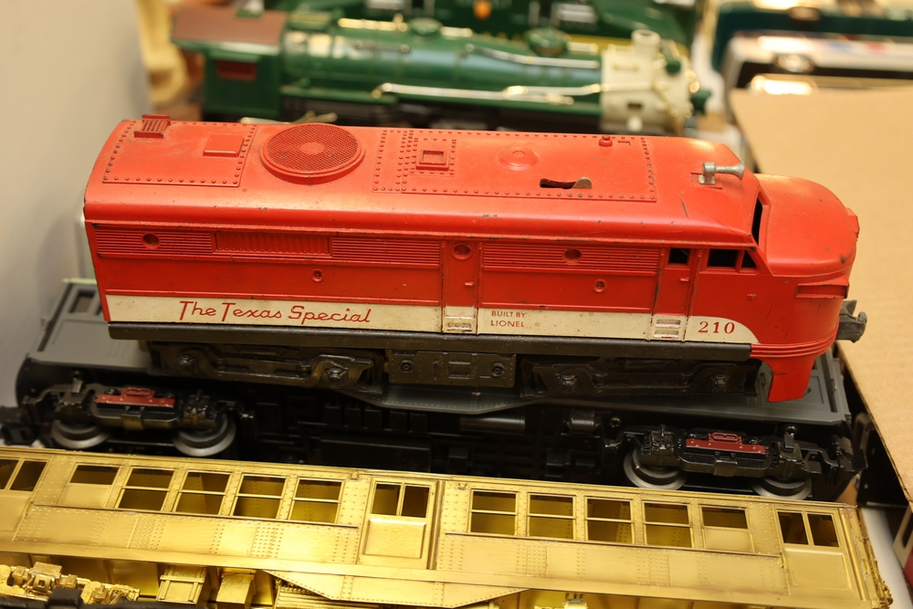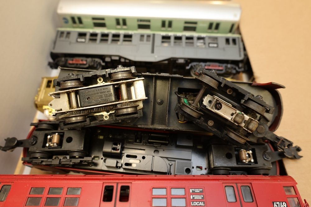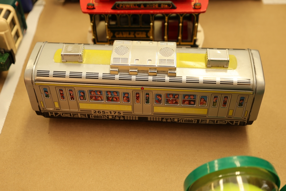 Group of model railroad and train related items including San Francisco cable car model marked Powell and Hyde Sts and San Francisco Municipal Ry, Lionel Diesel Switcher O scale motor unit, LO V Subway Car B marked 6341 New York City Transit subway car models including example marked Local 6749, brass subway style car body, Crescent 1925 locomotive display model on base, New York Central steam locomotive and tender, additional small steam locomotive and tender, and locomotive form telephone marked Telemania Model Locomotive Phone.