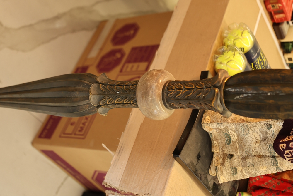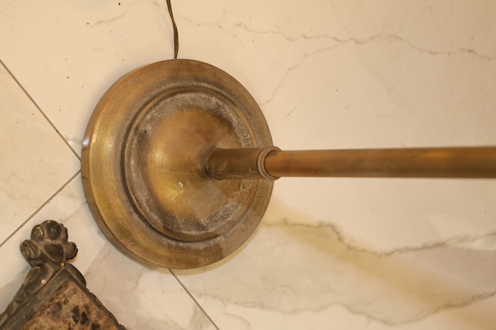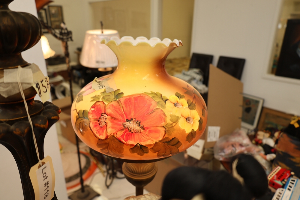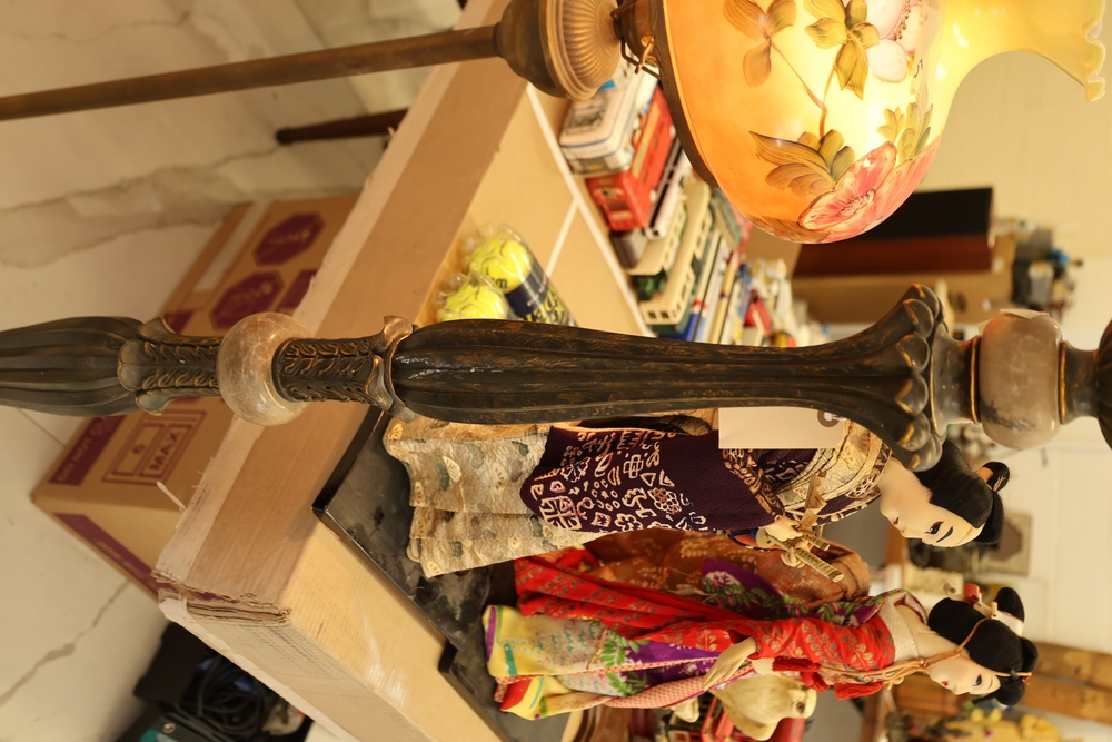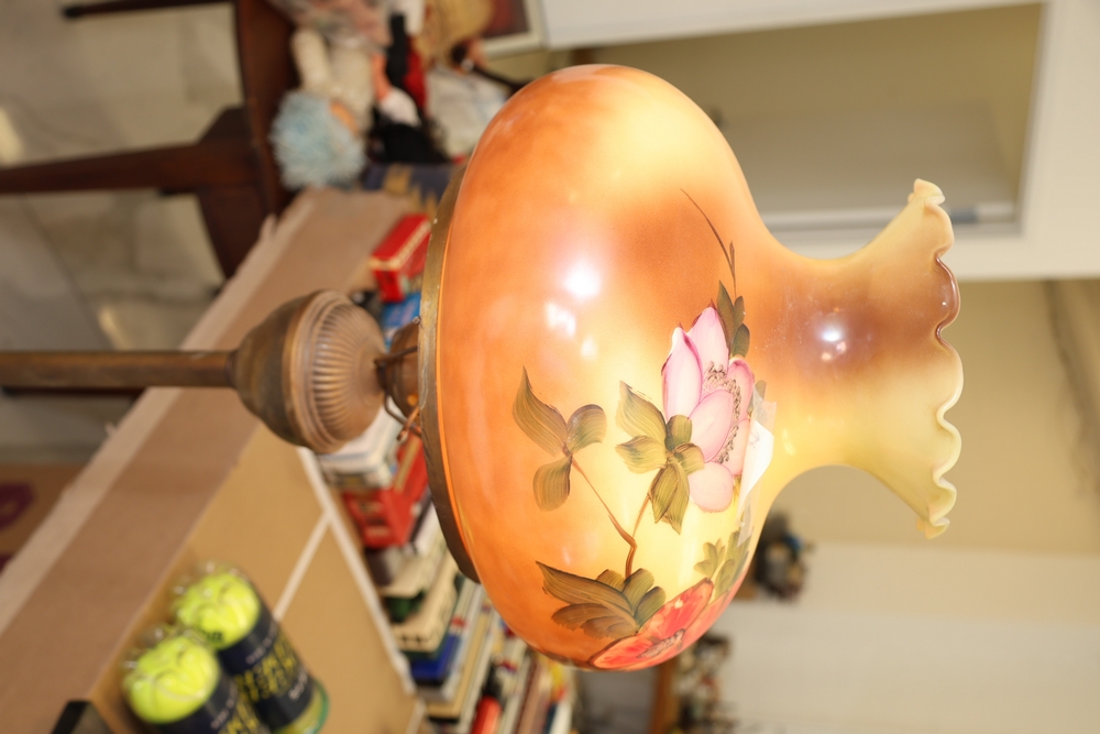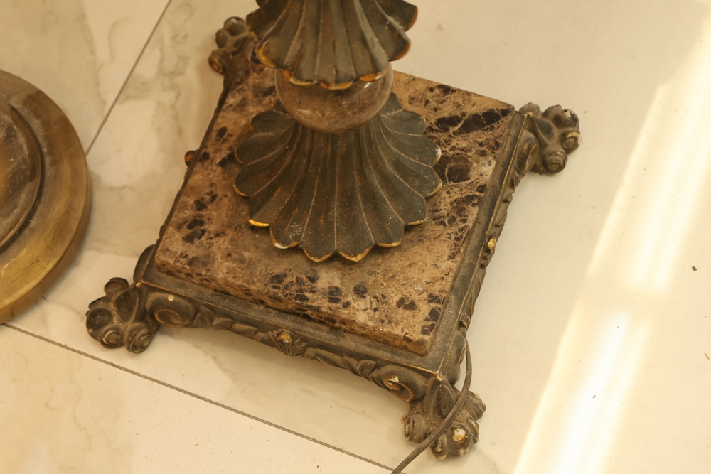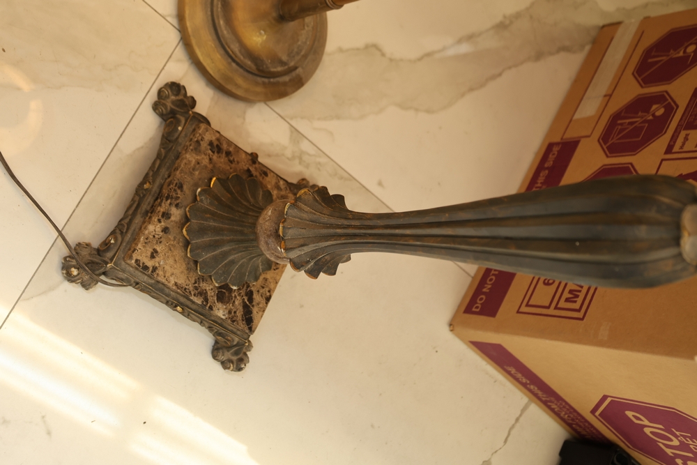 Lot of two floor lamps including metal torchiere floor lamp with marble base and amber glass shade floor lamp with hand painted floral decoration.