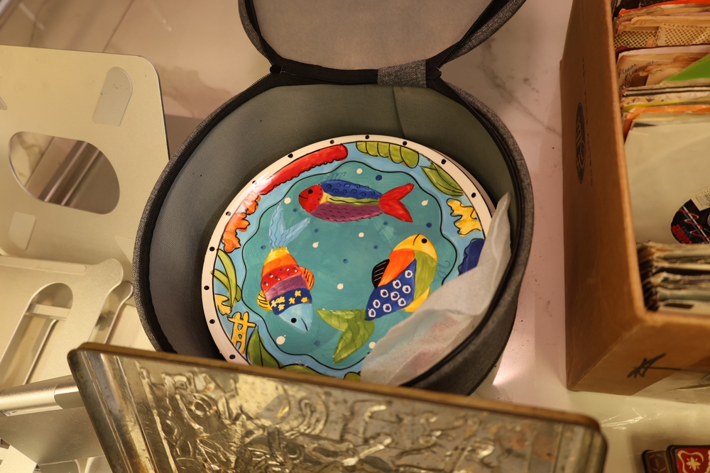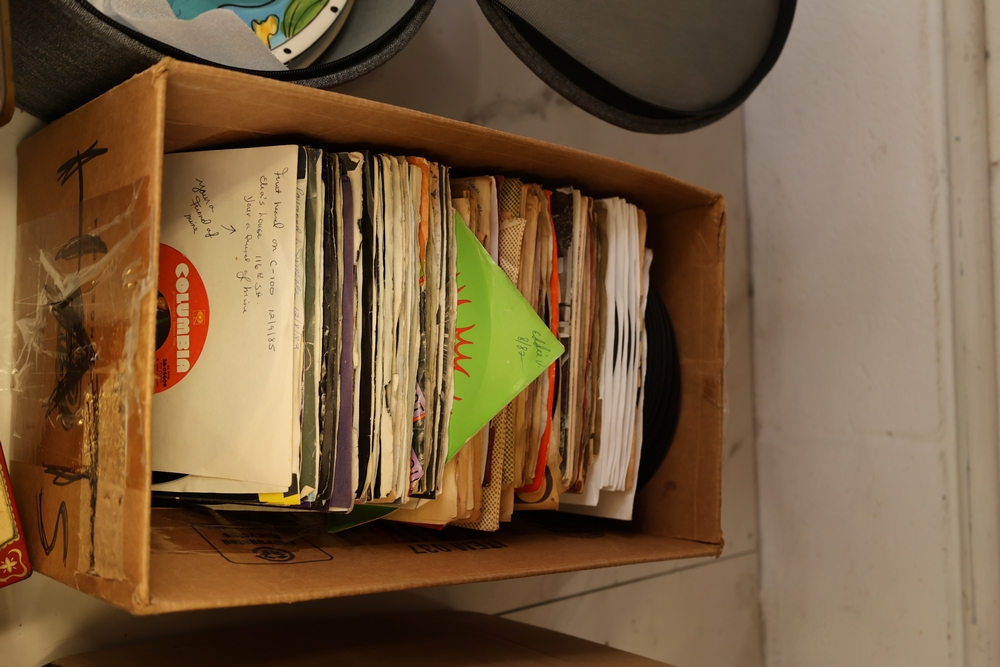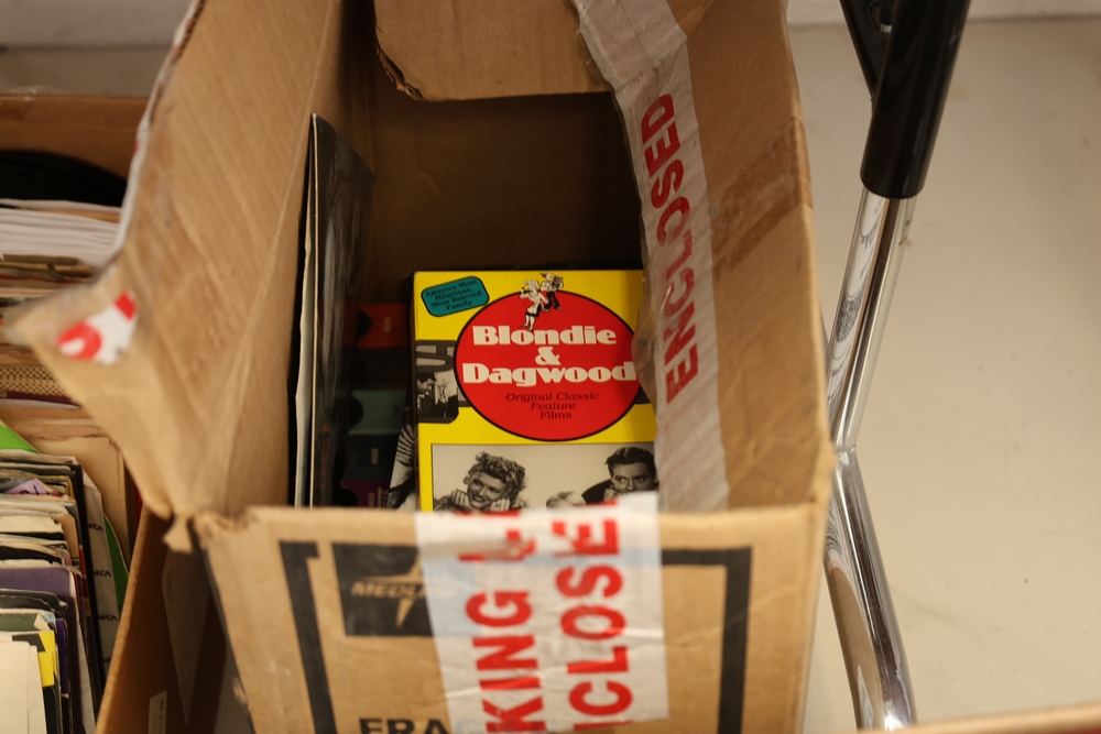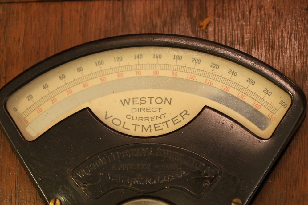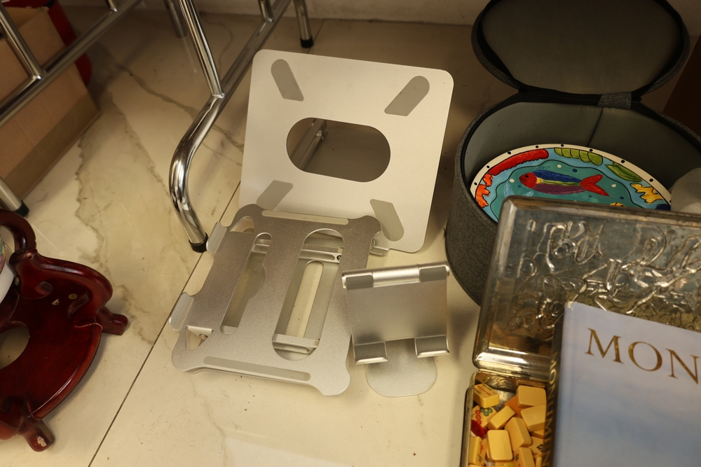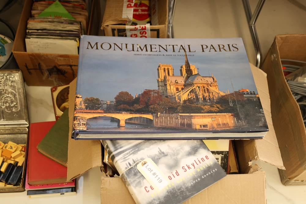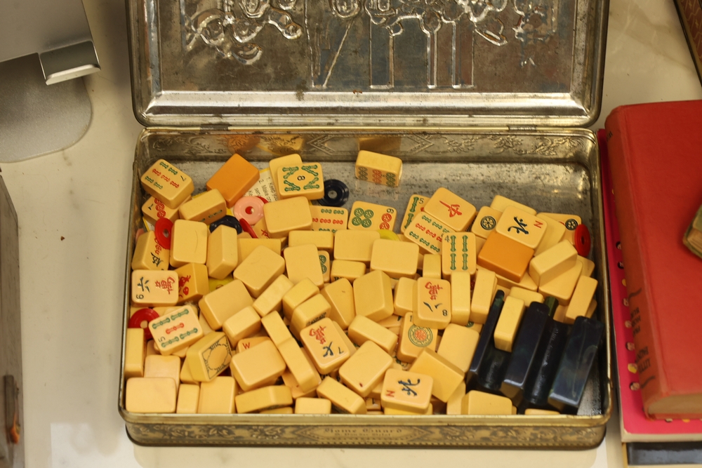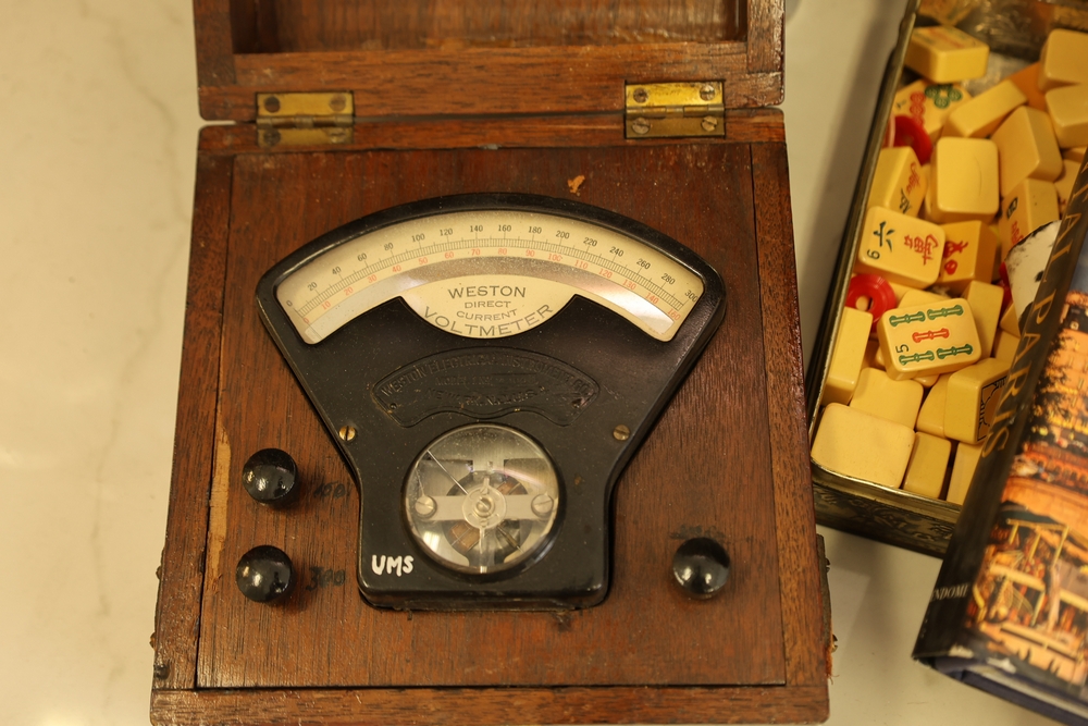 Lot of assorted items including Weston direct current voltmeter in wood case, mahjong tiles in metal tin, box of 45 rpm records with paper sleeves, assorted hardcover and paperback books, hand painted fish plate in case, and metal adjustable stands.