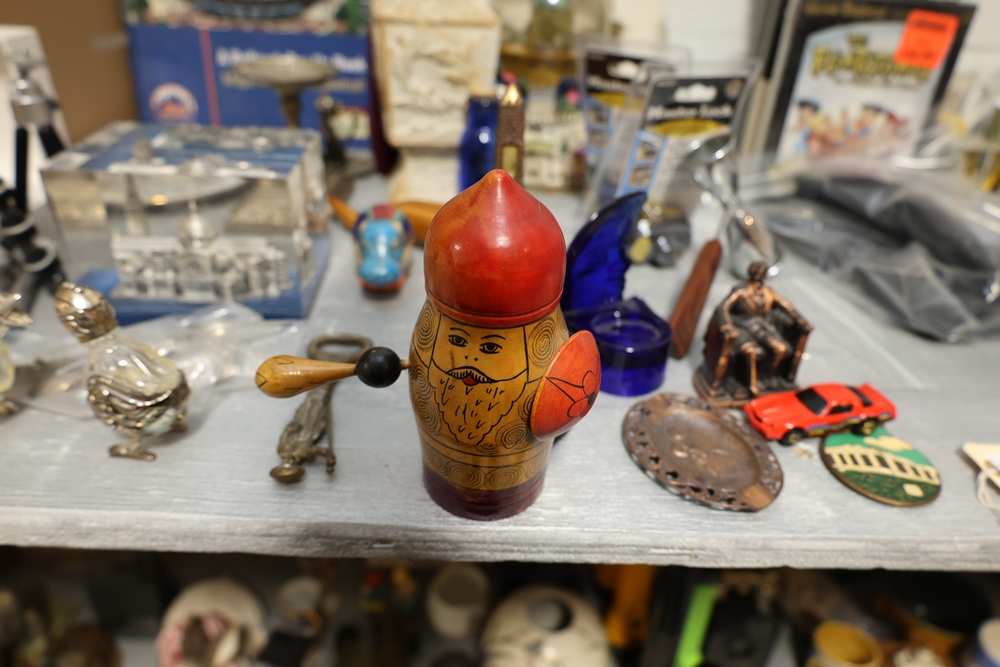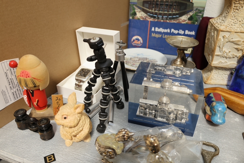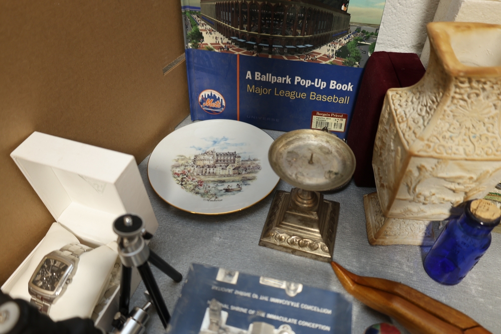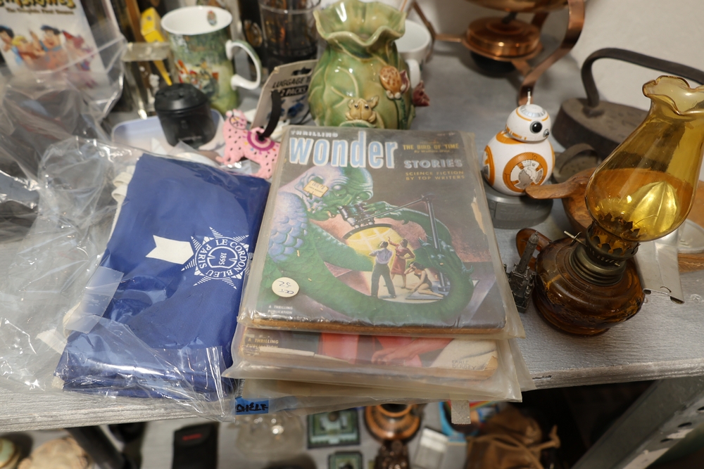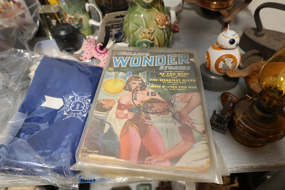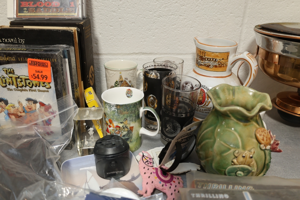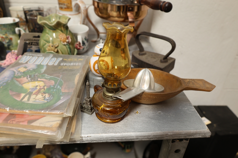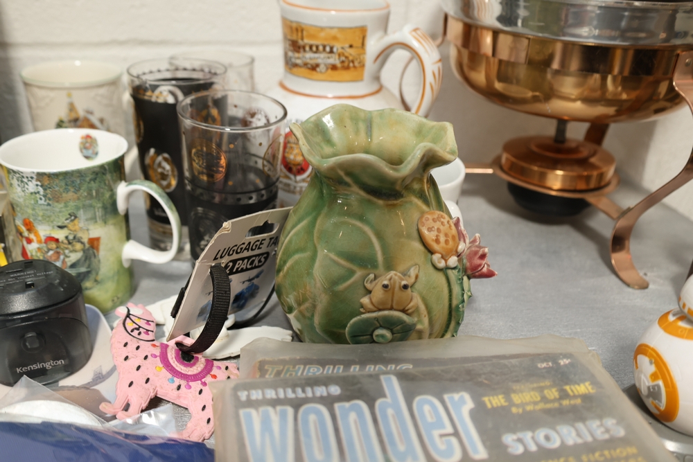 Assorted household items including copper fondue pot with stand, cast iron flat iron, small amber glass oil lamp, wooden citrus reamer with metal juicer insert, ceramic frog motif vase, ceramic pitcher with scenic decoration, assorted drinking glasses and decorative mugs, stack of Wonder Stories magazines, Flintstones television series CD set, several hardcover books, snow globe, Citi Field Mets ballpark book, small tripod, miniature binoculars, carved rabbit figure, wooden nutcracker style figure, toy car, glass architectural paperweight, metal and glass bird form pieces, and additional small decorative items.