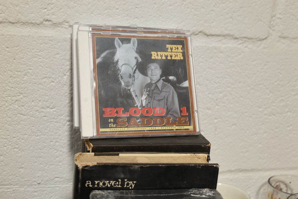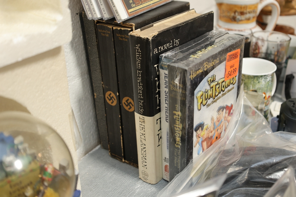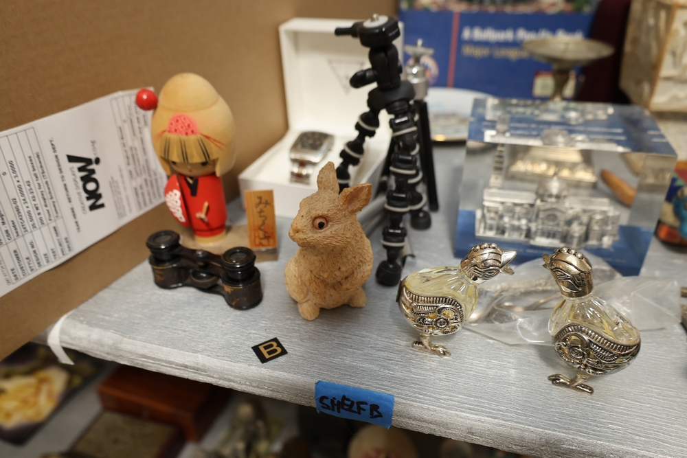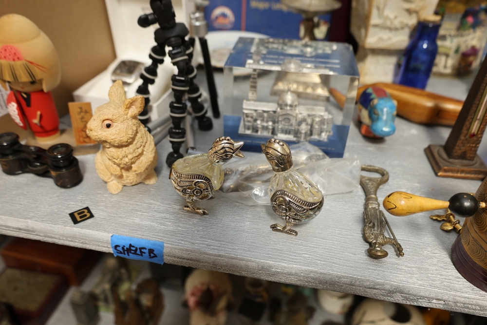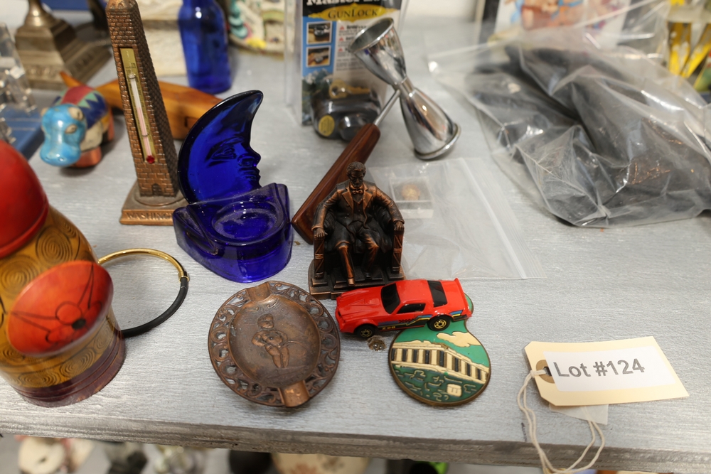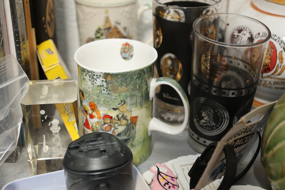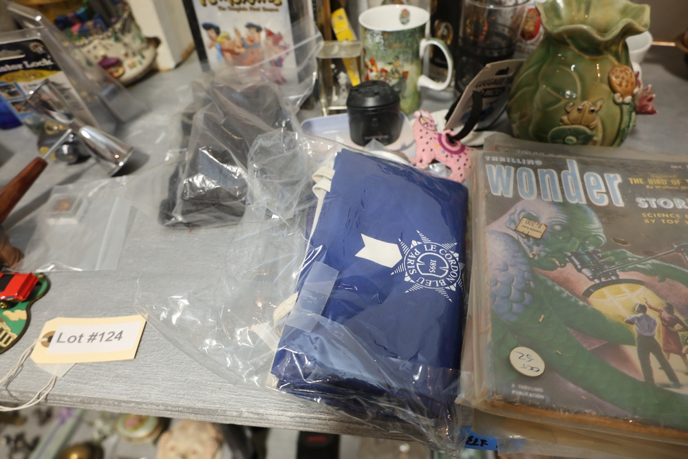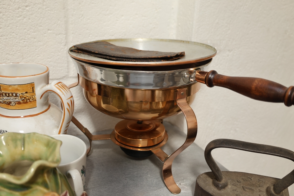 Assorted household items including copper fondue pot with stand, cast iron flat iron, small amber glass oil lamp, wooden citrus reamer with metal juicer insert, ceramic frog motif vase, ceramic pitcher with scenic decoration, assorted drinking glasses and decorative mugs, stack of Wonder Stories magazines, Flintstones television series CD set, several hardcover books, snow globe, Citi Field Mets ballpark book, small tripod, miniature binoculars, carved rabbit figure, wooden nutcracker style figure, toy car, glass architectural paperweight, metal and glass bird form pieces, and additional small decorative items.