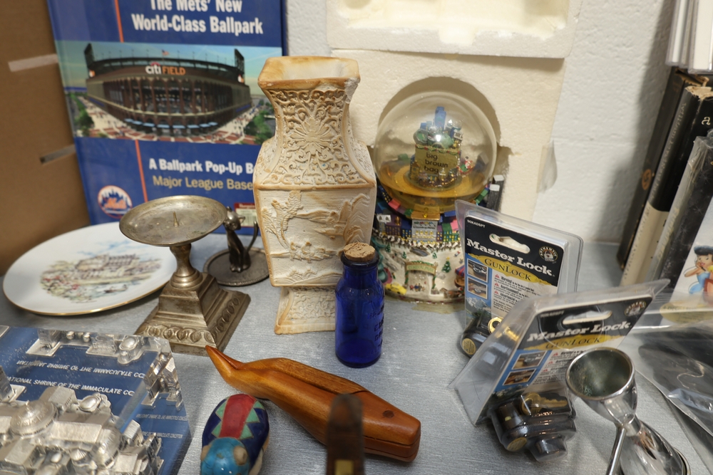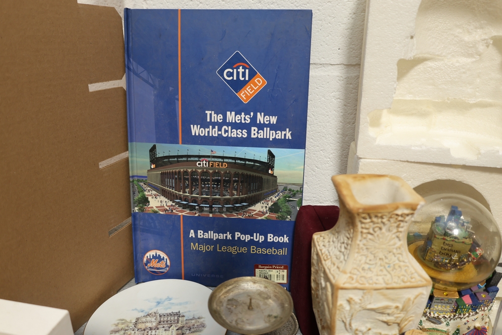Items include Framed Robert Fleisher "Proof" print depicting urban street scene; Roseville pottery; Denoyer-Geppert human anatomy torso; Bose AV3-2-1 III Media Center; Polk Audio bookshelf speakers; decorative collector's plates; Superman, Disney characters & Mickey Mouse collectibles; framed Star Wars displays; large amount of wall art; Playboy magazines; Films in Review magazines; camera equipment, binoculars & optics; Danbury Mint architectural building models; Kershaw SpeedSafe knife; Murano style large circular art glass platter; NJ Transit buses, & other company's model buses; costume jewelry; large Limoges France porcelain covered urn; Lionel Grand Central Terminal architectural model; brass beverage tap assemblies; large collection of baseball trading cards; vintage newspapers/magazines; vintage table lamp & more. Items are located in New York, NY.