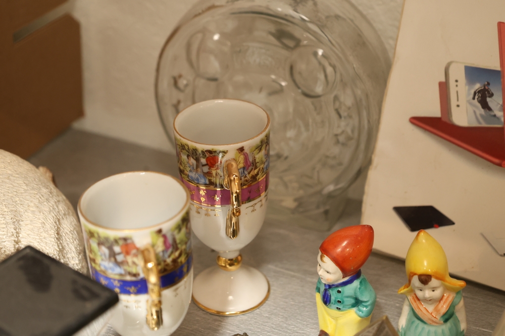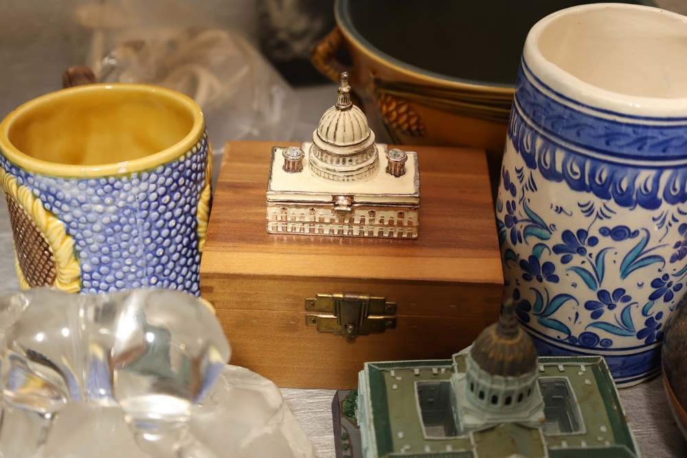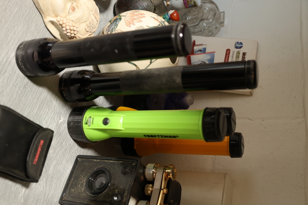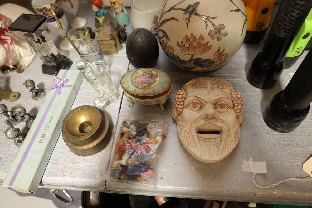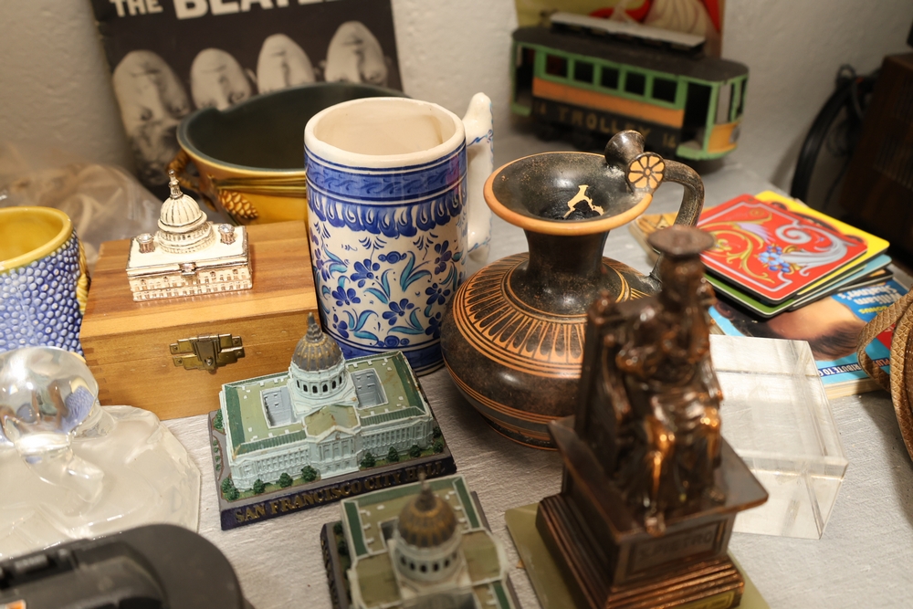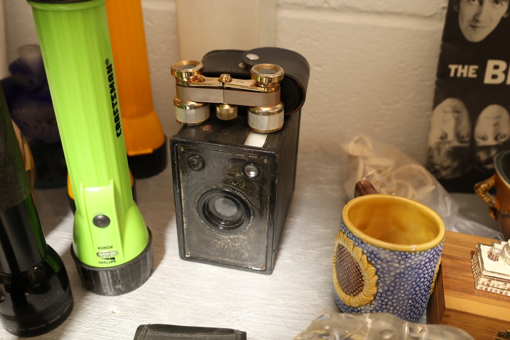 Assorted decorative and household items including flashlights, Kodak box camera, small binoculars, Beatles booklet, model trolley car, miniature building souvenirs including San Francisco City Hall, seated figure souvenir marked Roma A.D. 2000, ceramic steins and cups, pottery vessel, rabbit figure, small glassware, miniature figures, carved mask coin bank, trinket boxes, and small brass and metal items.