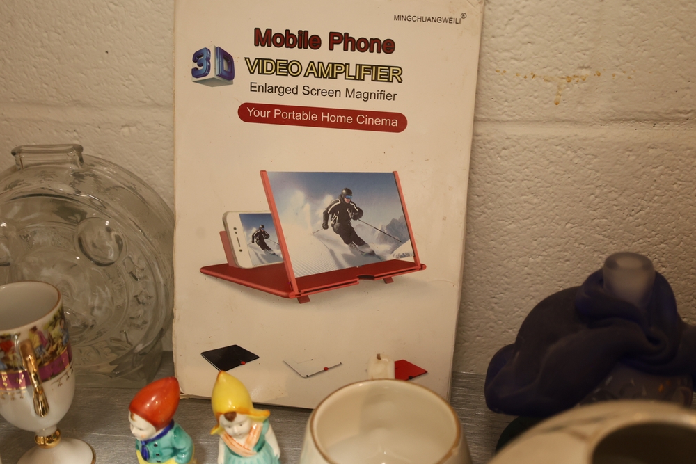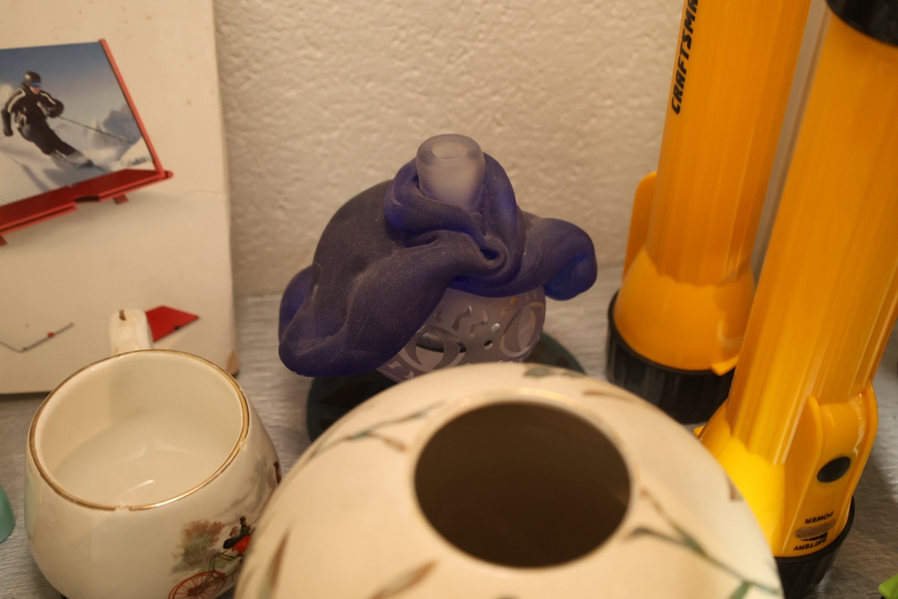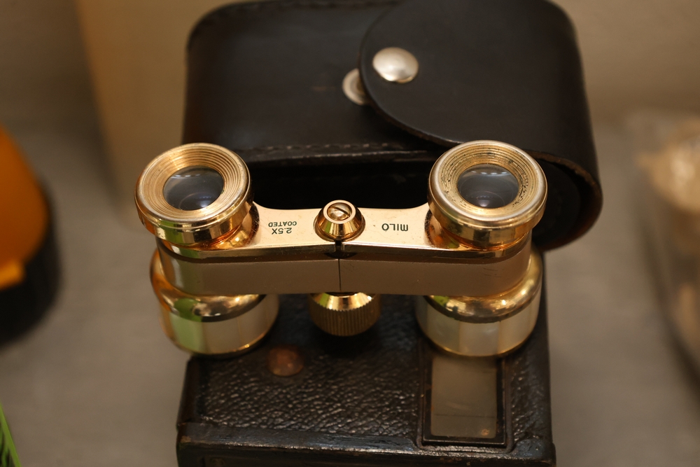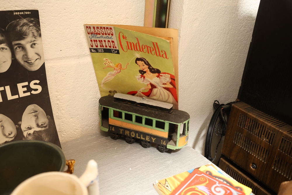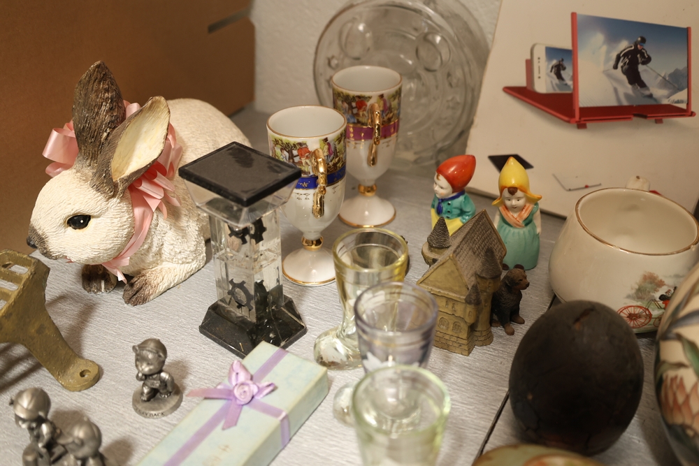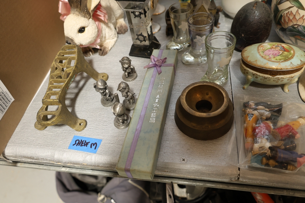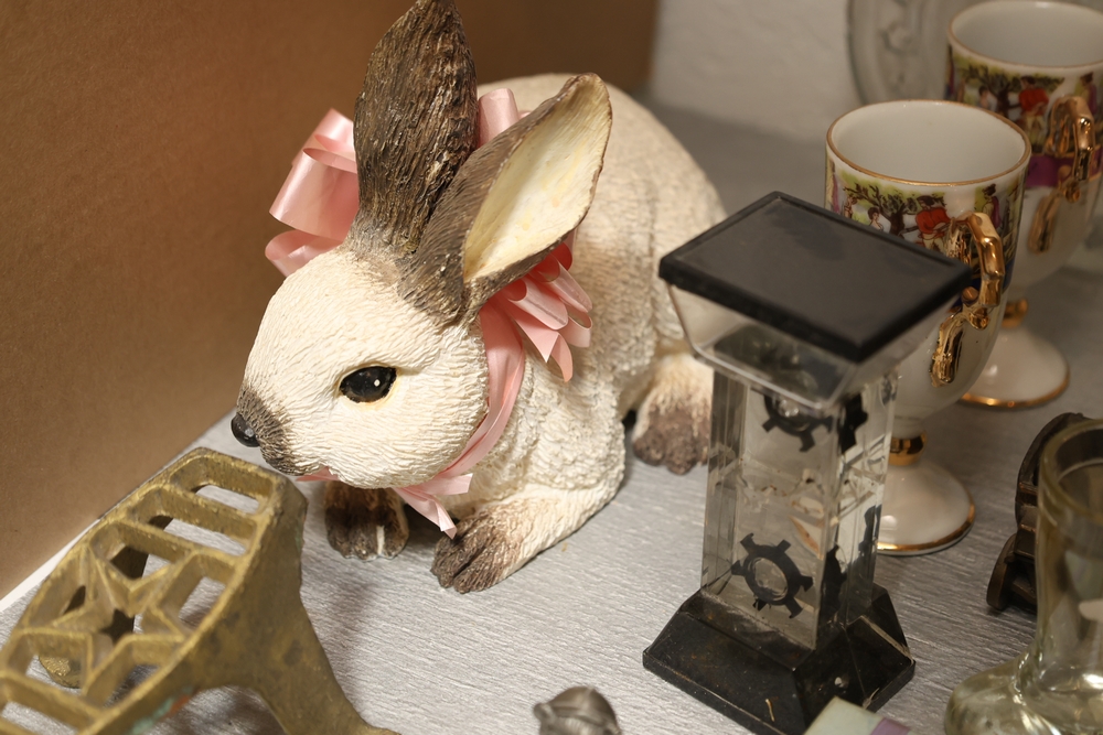 Assorted decorative and household items including flashlights, Kodak box camera, small binoculars, Beatles booklet, model trolley car, miniature building souvenirs including San Francisco City Hall, seated figure souvenir marked Roma A.D. 2000, ceramic steins and cups, pottery vessel, rabbit figure, small glassware, miniature figures, carved mask coin bank, trinket boxes, and small brass and metal items.