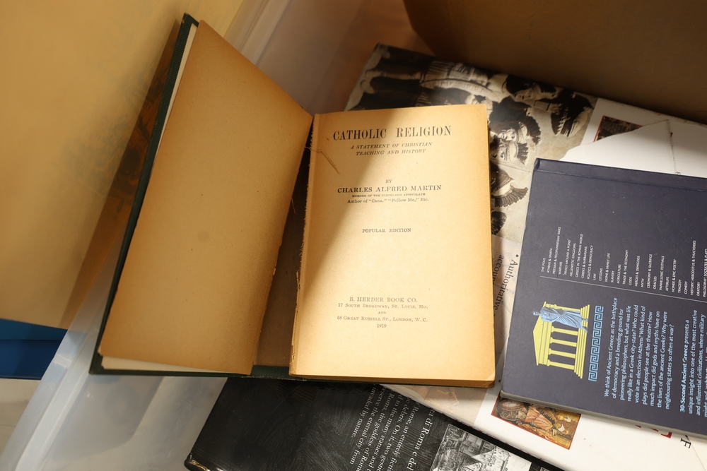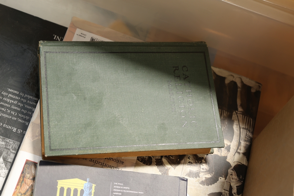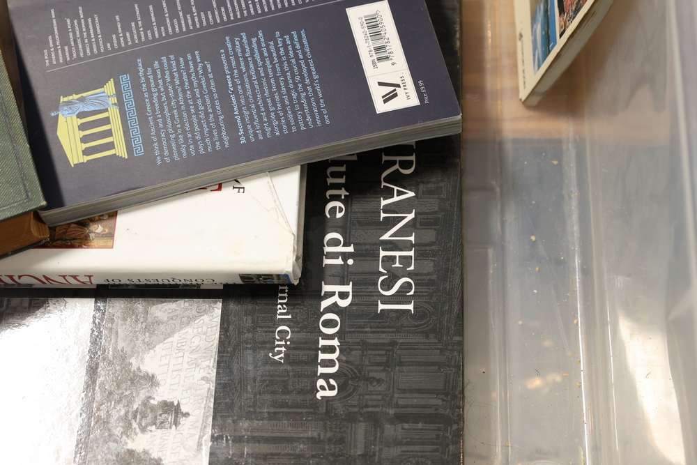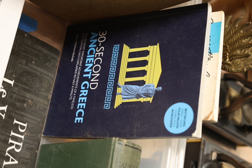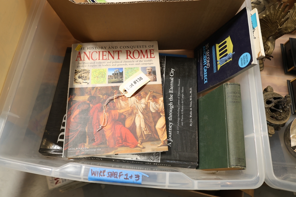 Books including The History and Conquests of Ancient Rome, Piranesi Le Vedute di Roma A Journey through the Eternal City, 30-Second Ancient Greece, Conversational French in 7 Days, and Catholic Religion by Charles Alfred Martin, together with decorative plates, oval serving platter, glass tumblers, small tray, and I Love NY mug.