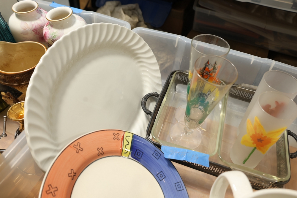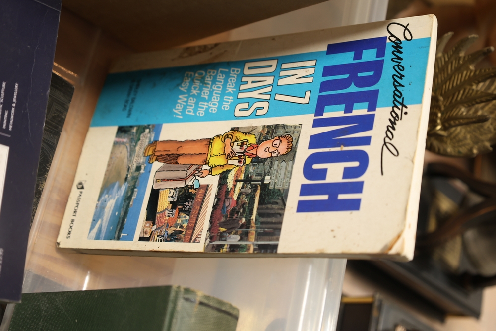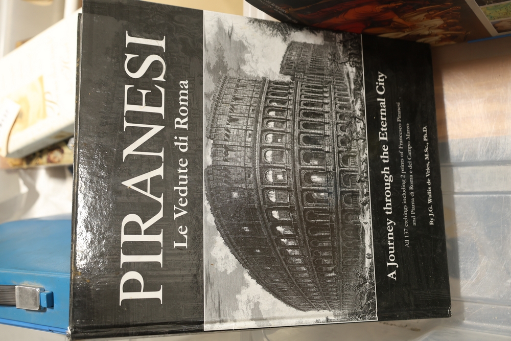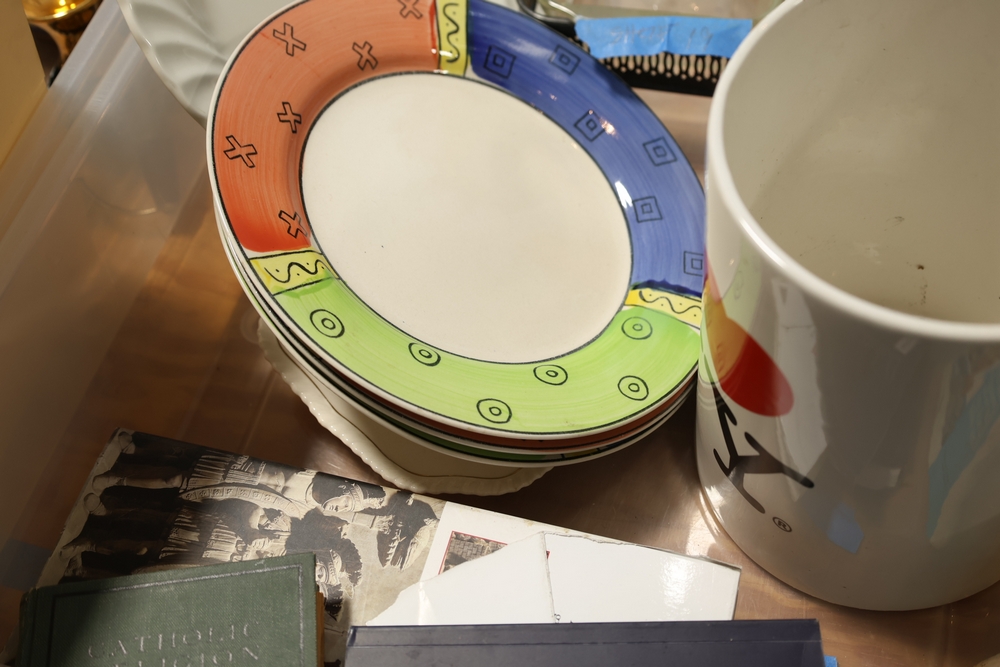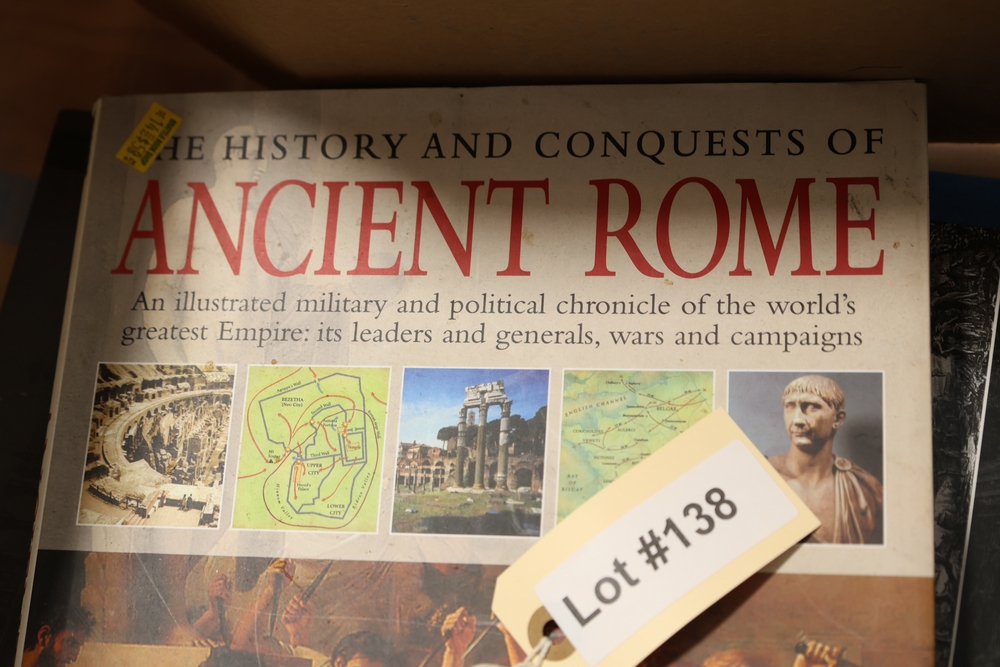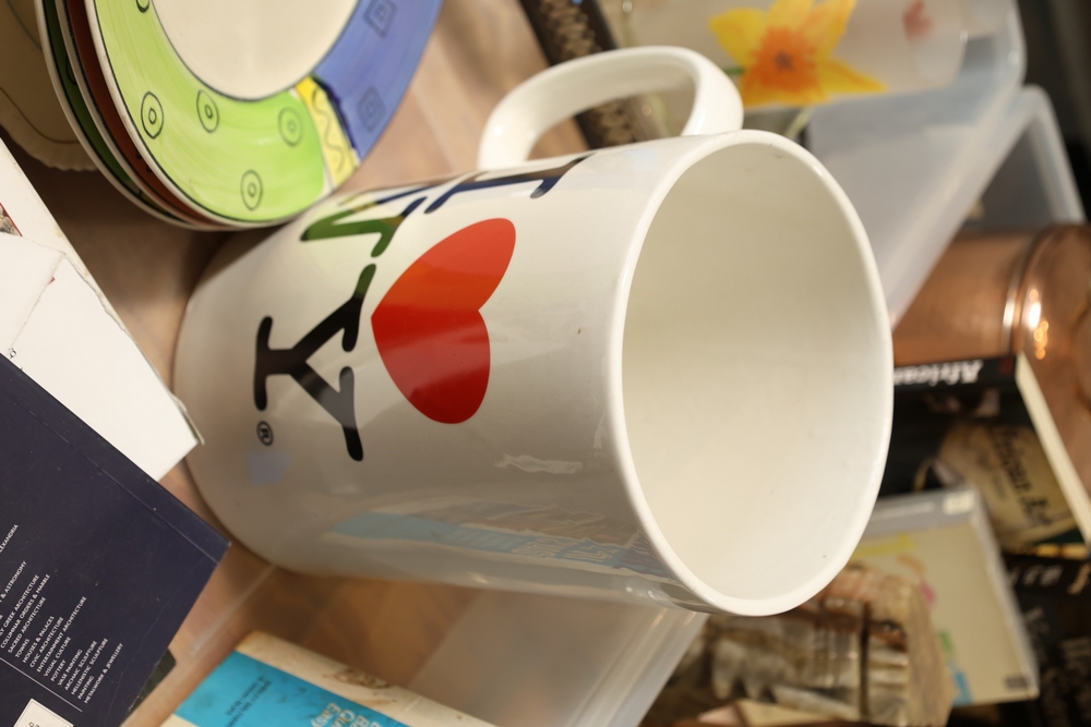 Books including The History and Conquests of Ancient Rome, Piranesi Le Vedute di Roma A Journey through the Eternal City, 30-Second Ancient Greece, Conversational French in 7 Days, and Catholic Religion by Charles Alfred Martin, together with decorative plates, oval serving platter, glass tumblers, small tray, and I Love NY mug.