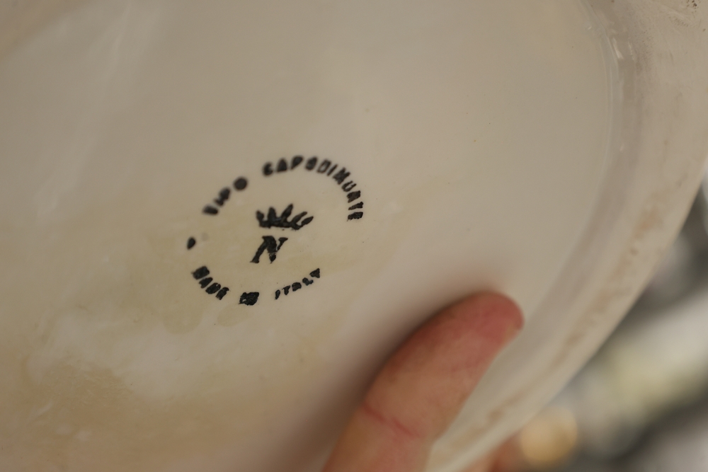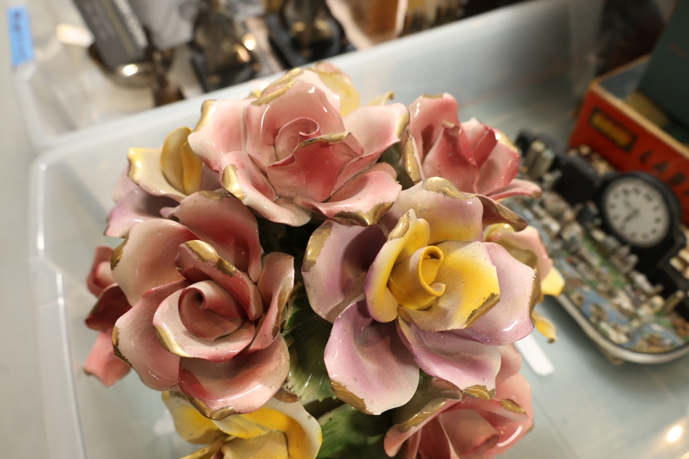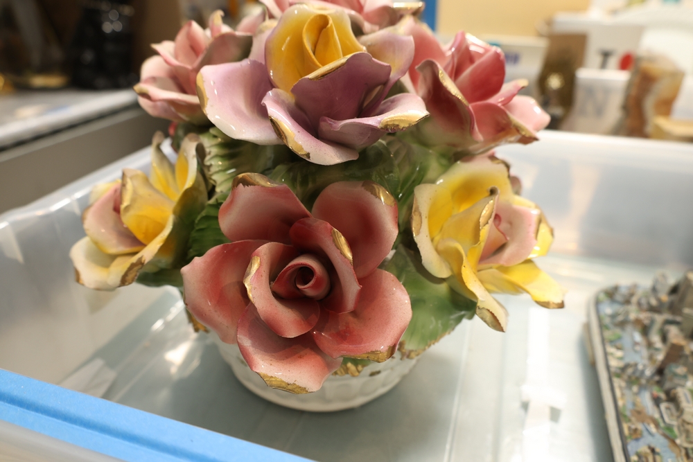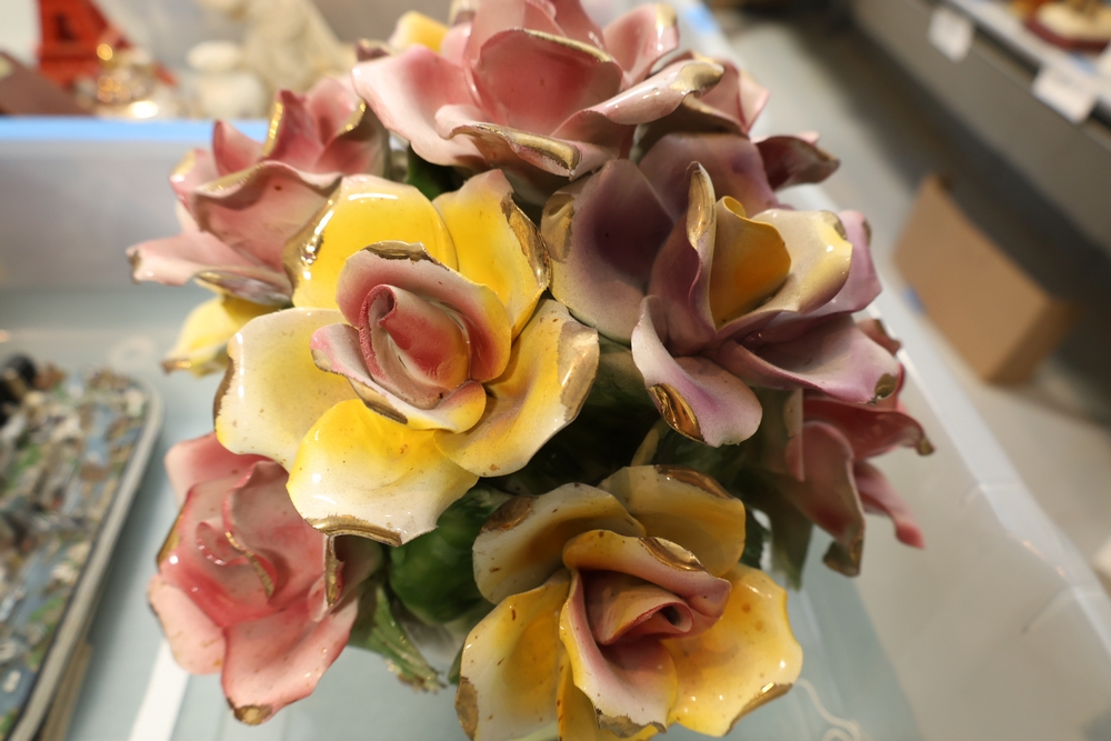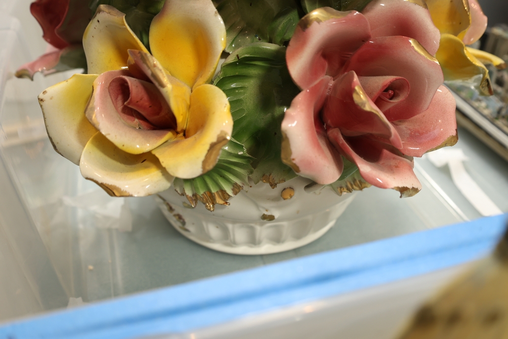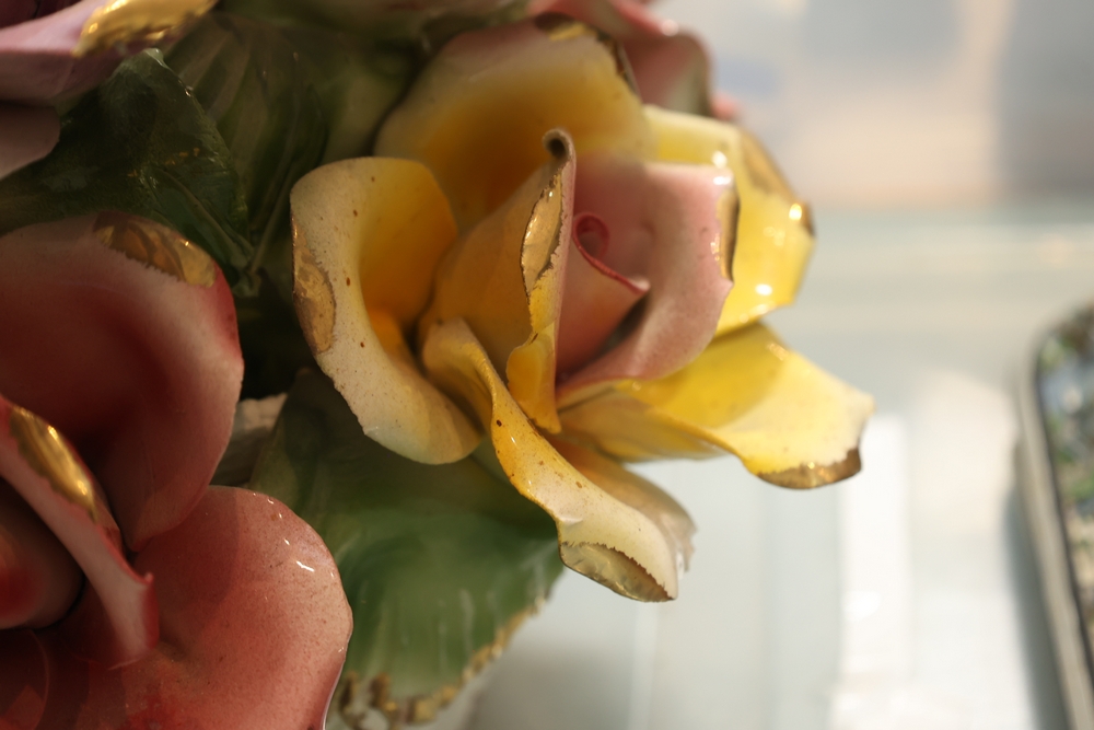 Capodimonte porcelain floral centerpiece with roses and calla lilies in a basket form vase.