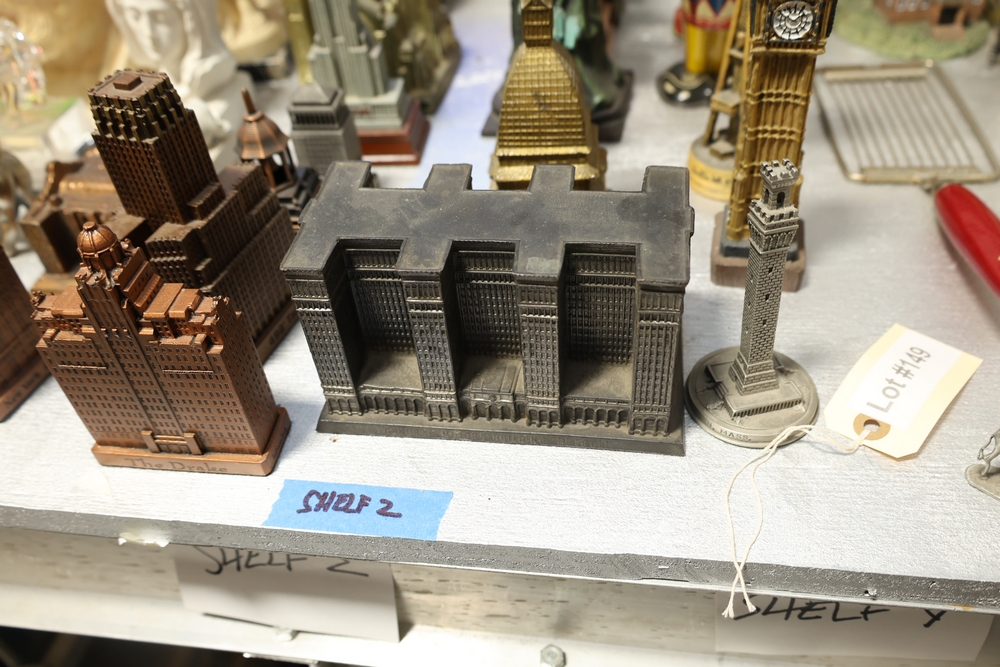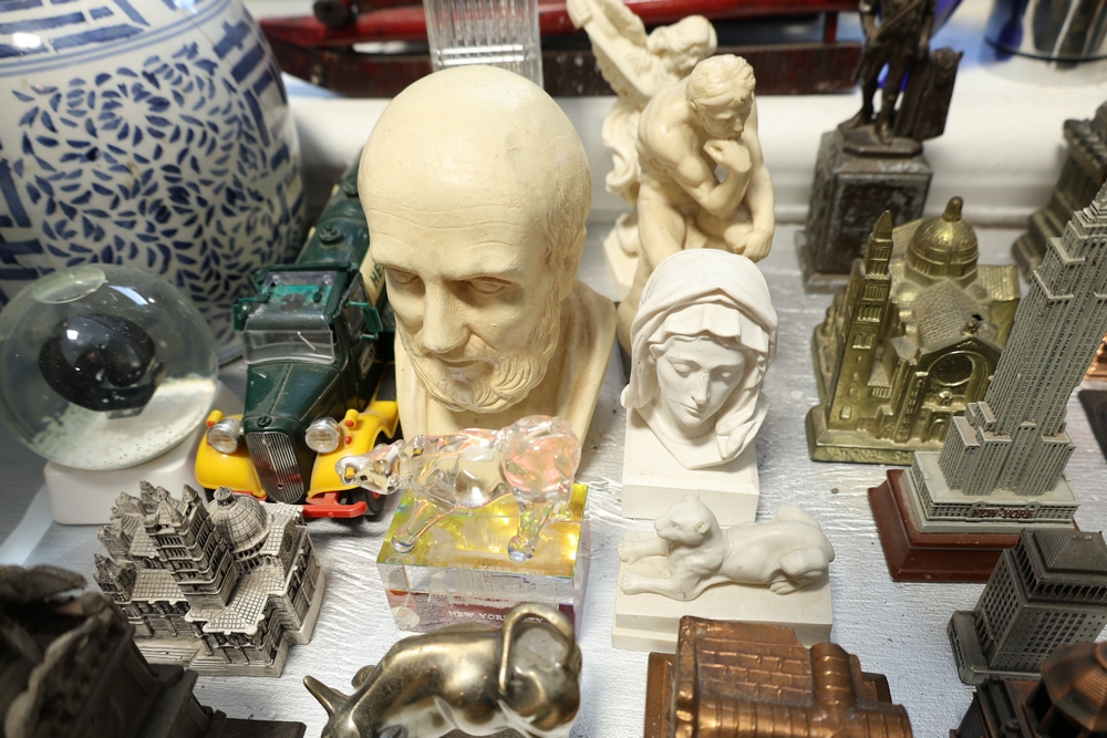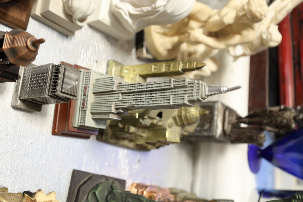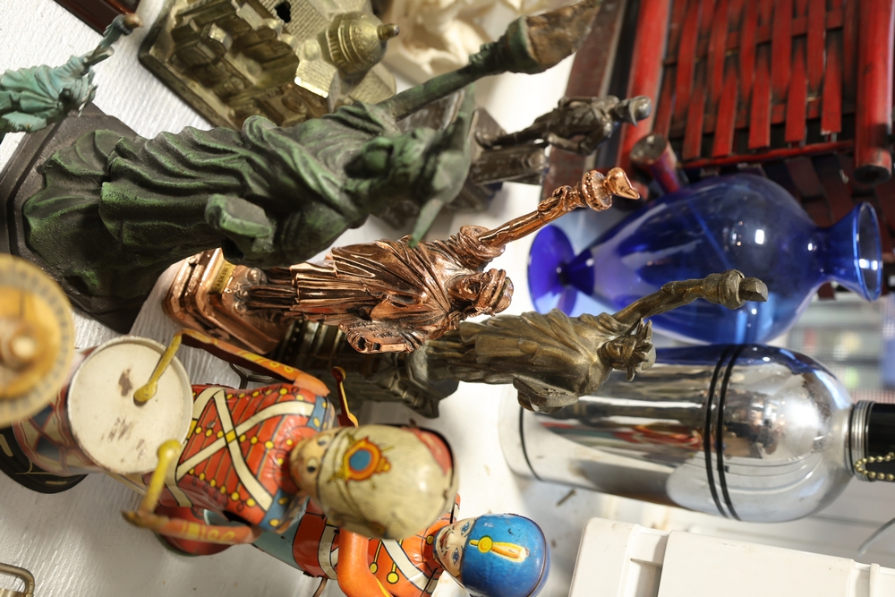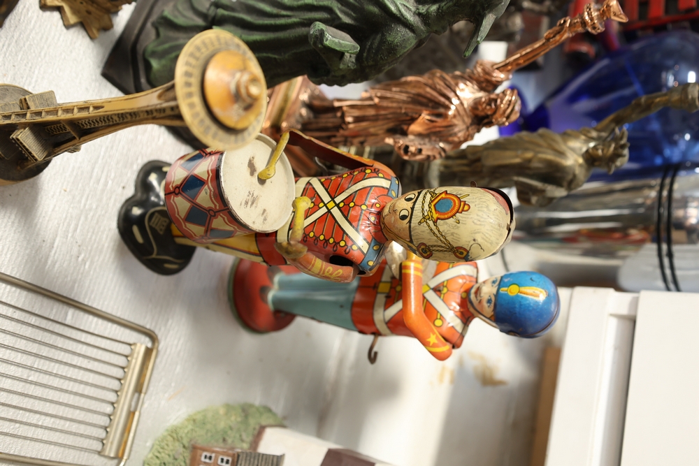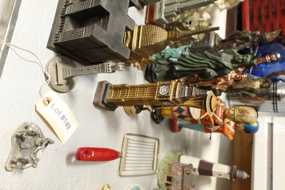 Group of souvenir building and monument models including Statue of Liberty, Big Ben, Empire State Building, lighthouses, and other architectural miniatures, together with two tin toy drummers and assorted small decorative items.