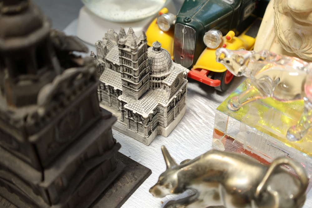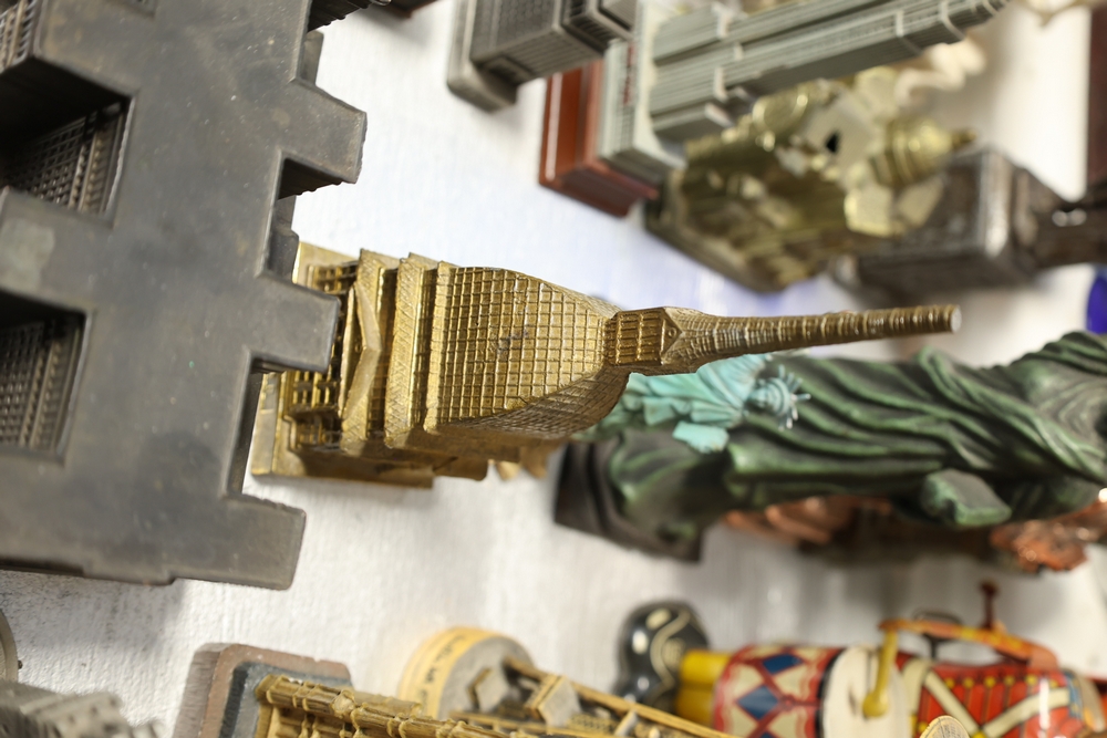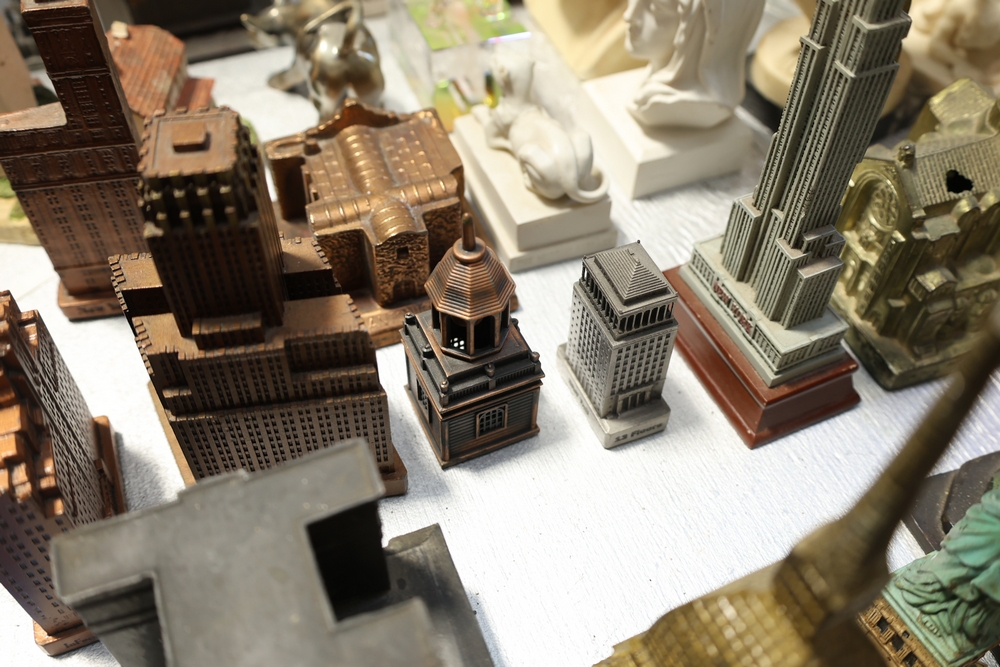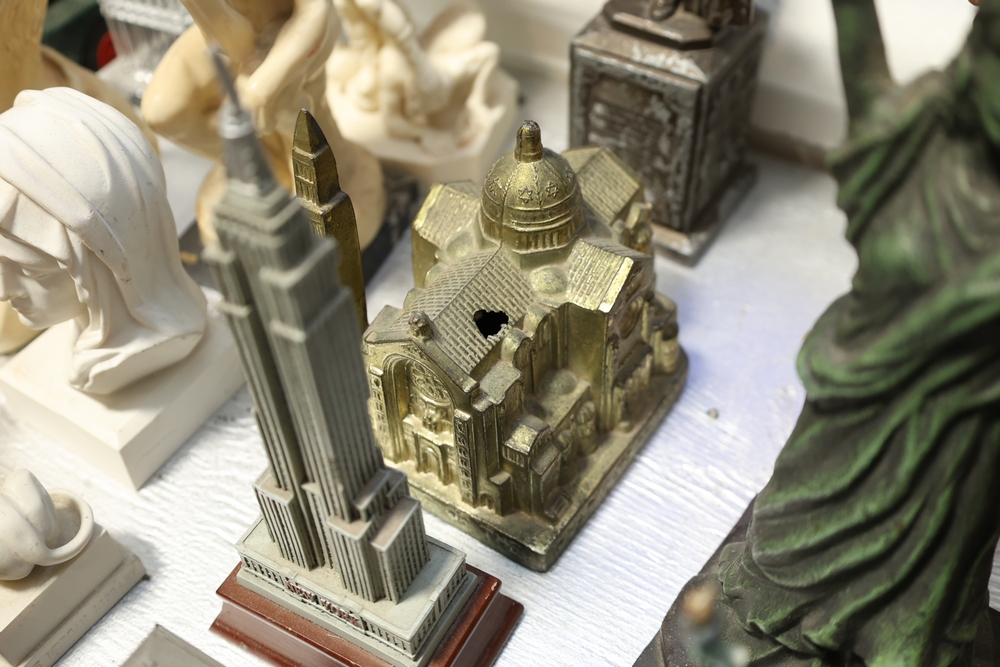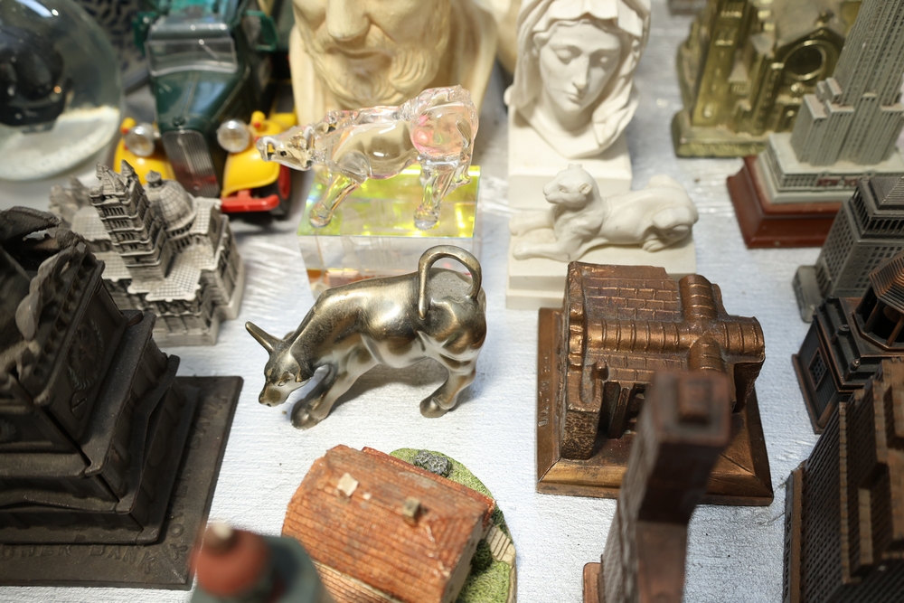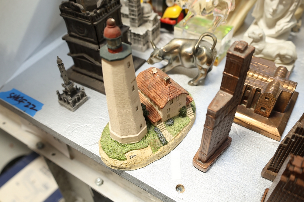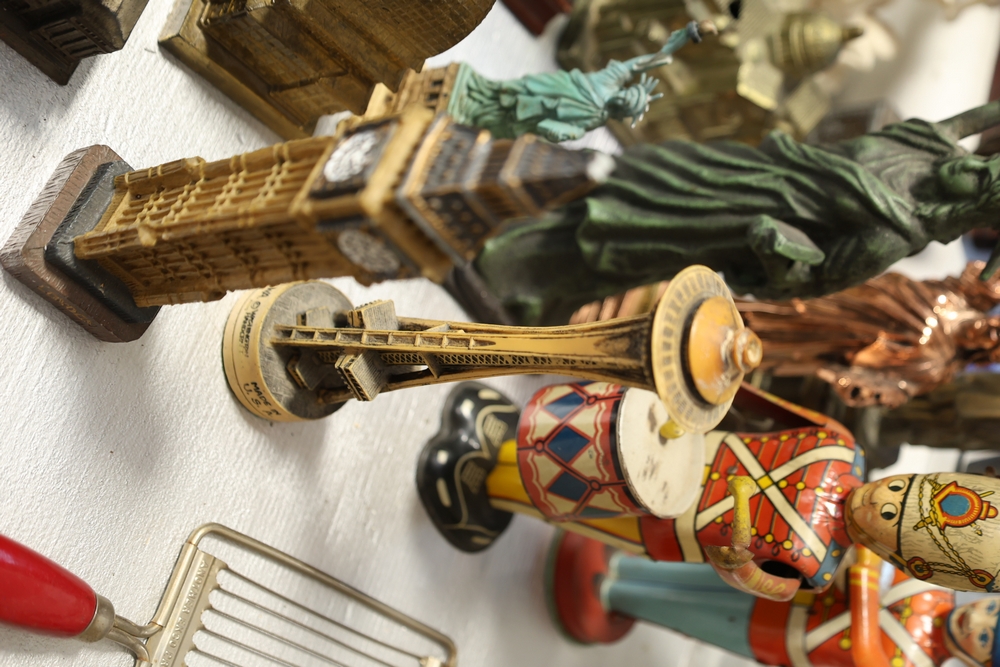 Group of souvenir building and monument models including Statue of Liberty, Big Ben, Empire State Building, lighthouses, and other architectural miniatures, together with two tin toy drummers and assorted small decorative items.