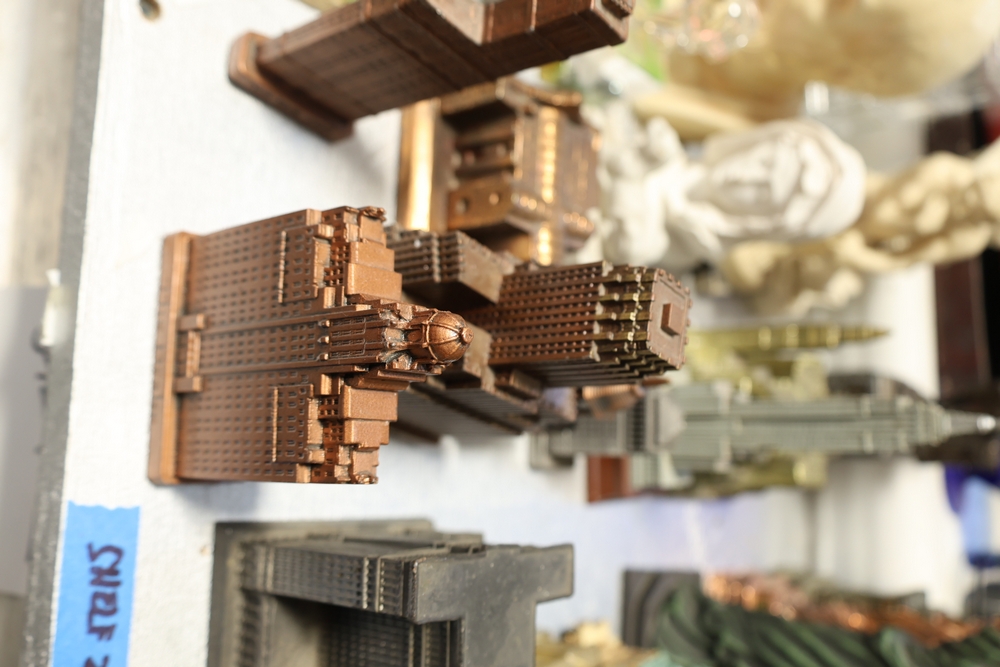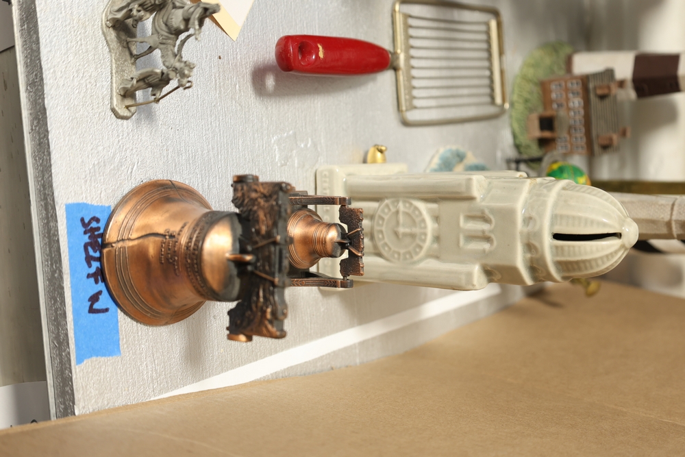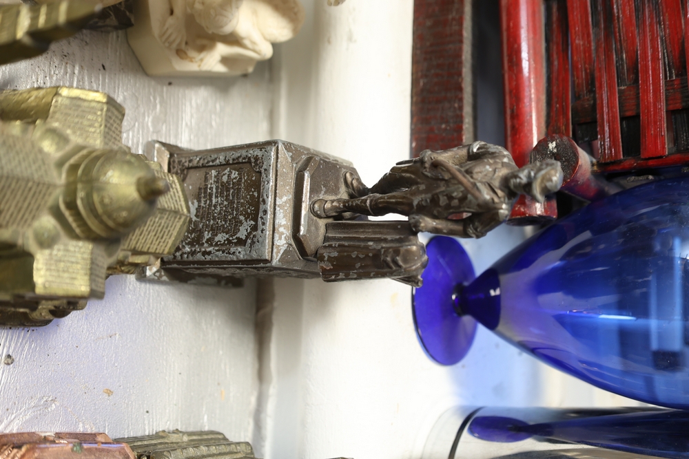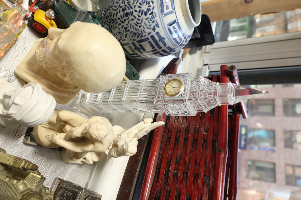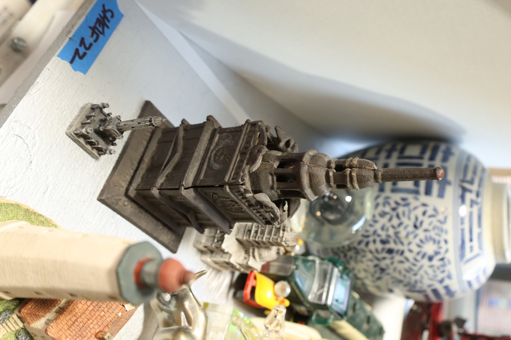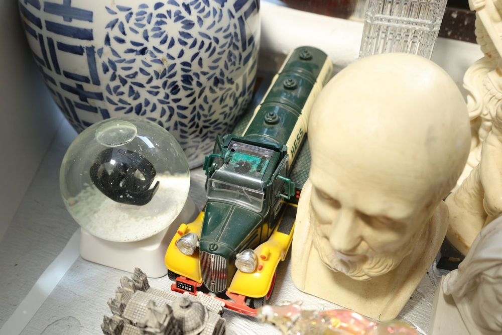 Group of souvenir building and monument models including Statue of Liberty, Big Ben, Empire State Building, lighthouses, and other architectural miniatures, together with two tin toy drummers and assorted small decorative items.