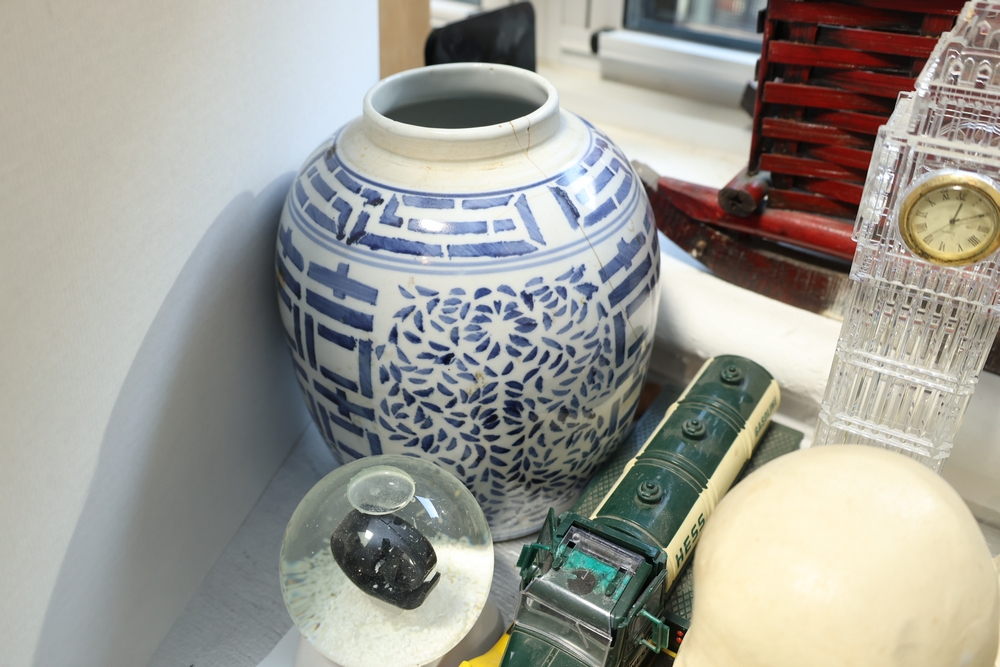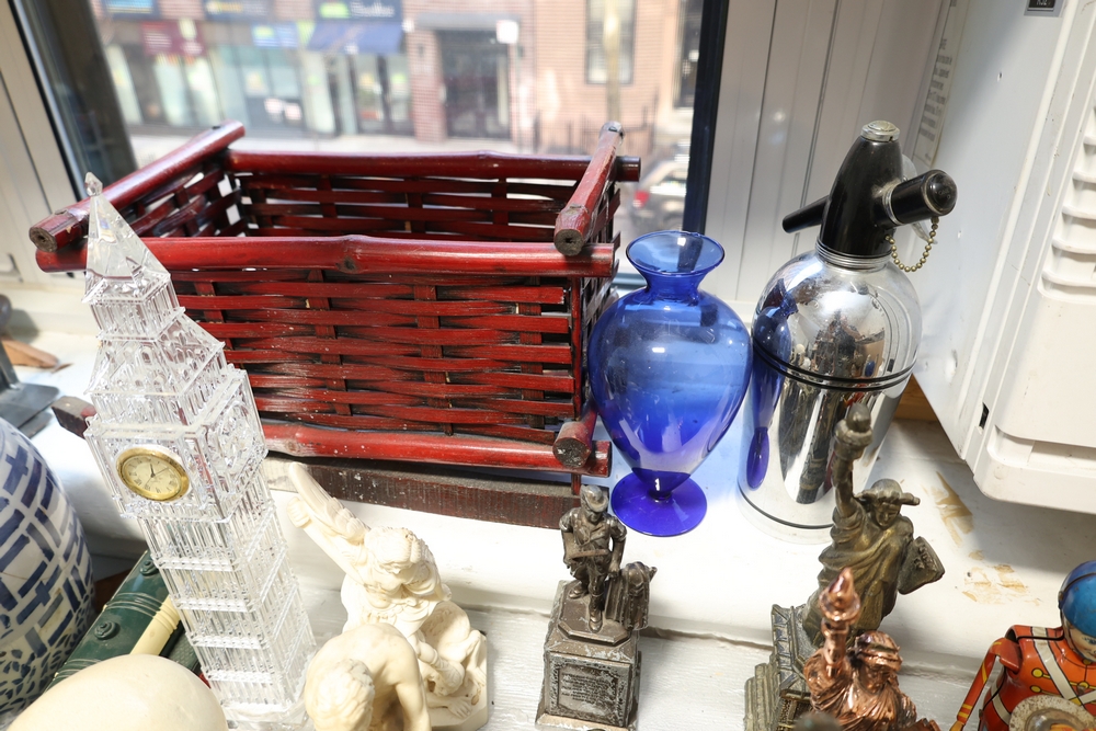 Items include Framed Robert Fleisher "Proof" print depicting urban street scene; Roseville pottery; Denoyer-Geppert human anatomy torso; Bose AV3-2-1 III Media Center; Polk Audio bookshelf speakers; decorative collector's plates; Superman, Disney characters & Mickey Mouse collectibles; framed Star Wars displays; large amount of wall art; Playboy magazines; Films in Review magazines; camera equipment, binoculars & optics; Danbury Mint architectural building models; Kershaw SpeedSafe knife; Murano style large circular art glass platter; NJ Transit buses, & other company's model buses; costume jewelry; large Limoges France porcelain covered urn; Lionel Grand Central Terminal architectural model; brass beverage tap assemblies; large collection of baseball trading cards; vintage newspapers/magazines; vintage table lamp & more. Items are located in New York, NY.