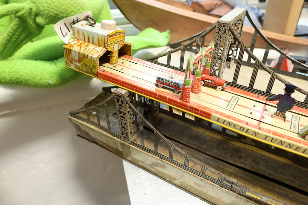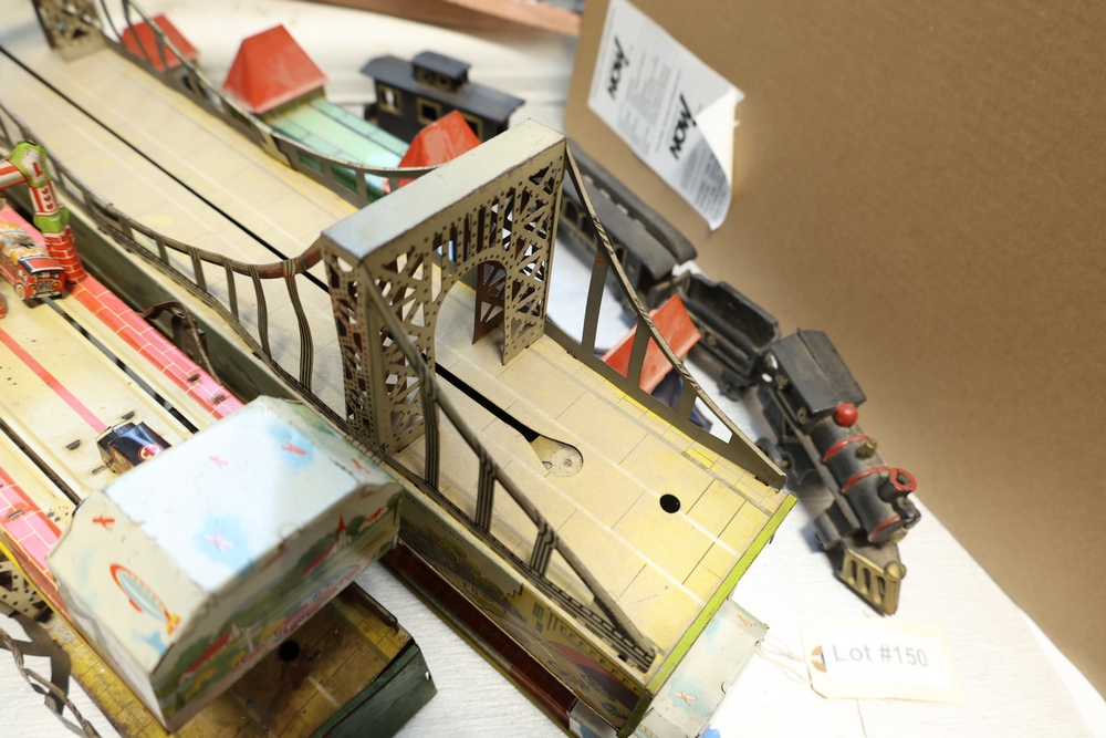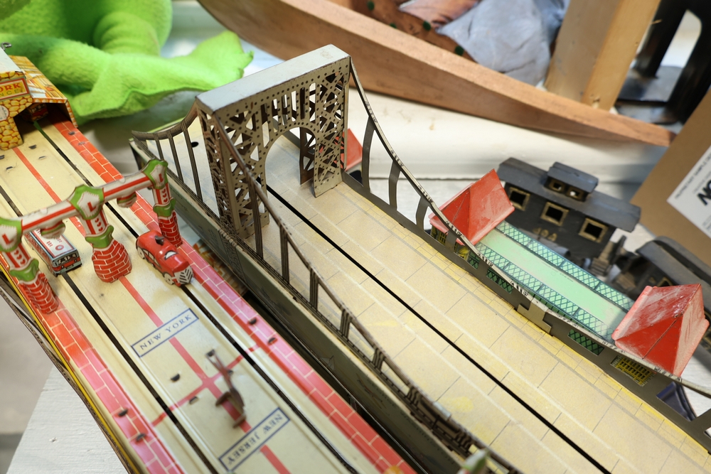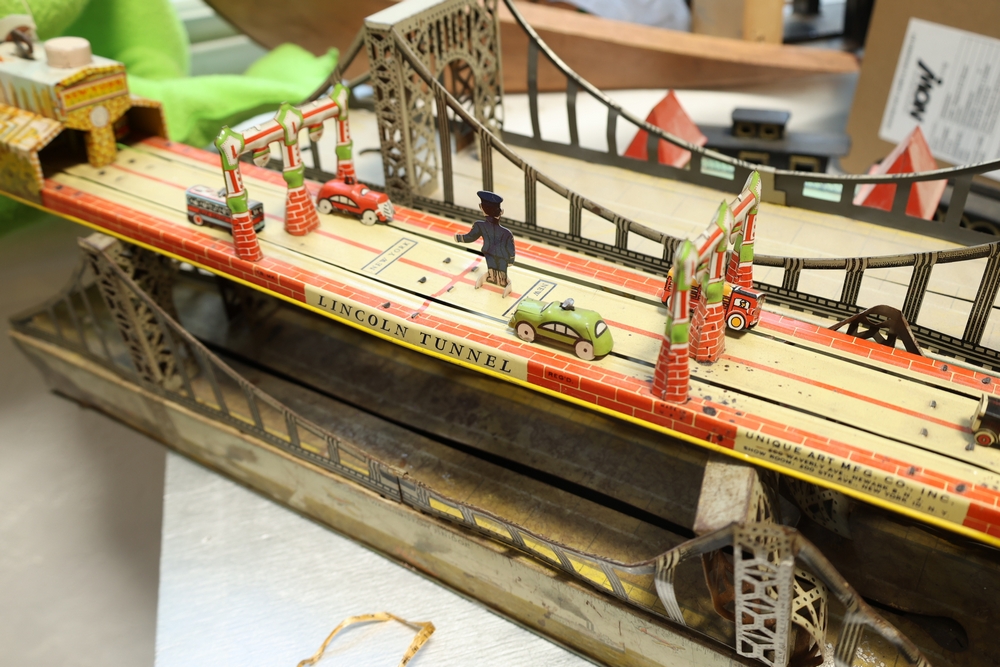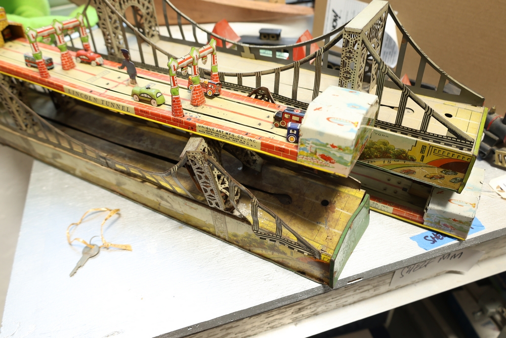 Unique Art Mfg. Co. Lincoln Tunnel tin litho toy roadway with cars, bus, and traffic officer figure, together with tin litho bridge section marked Made in U.S. Zone Germany and small cast metal toy train with locomotive, tender, and cars.