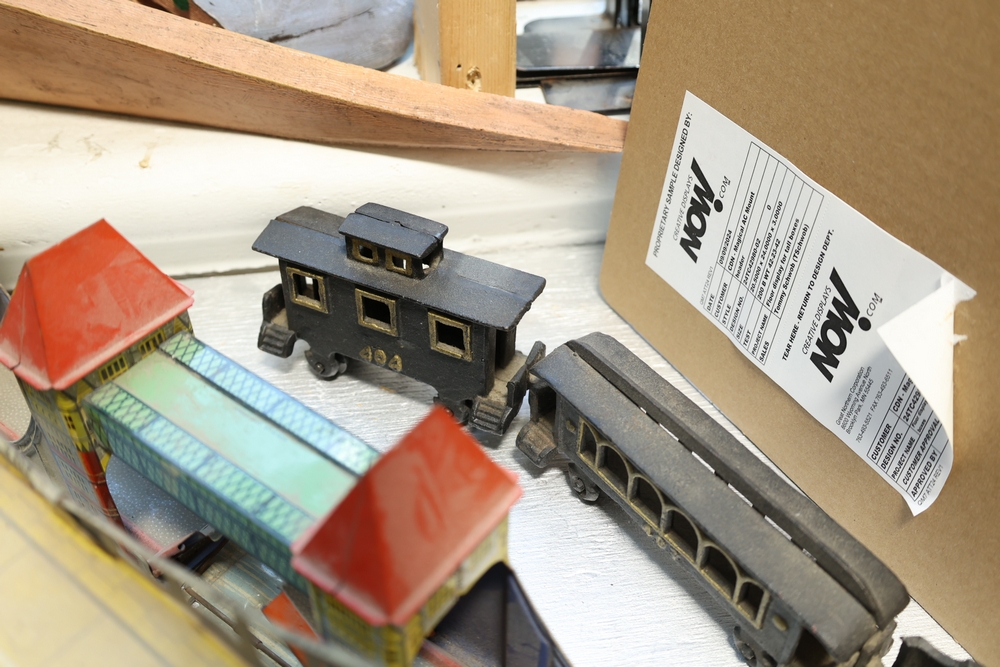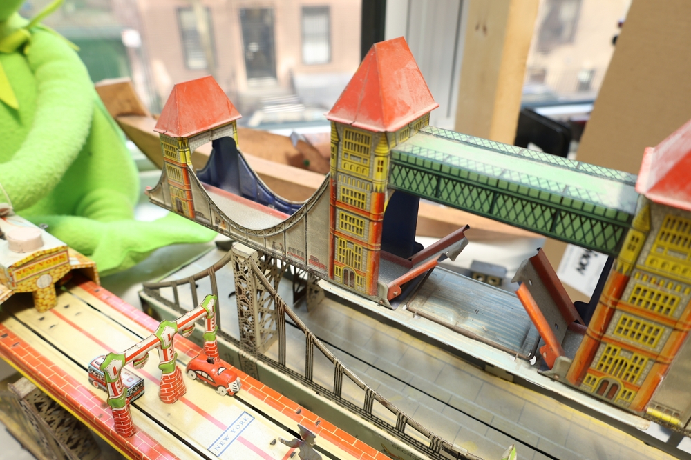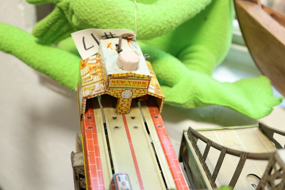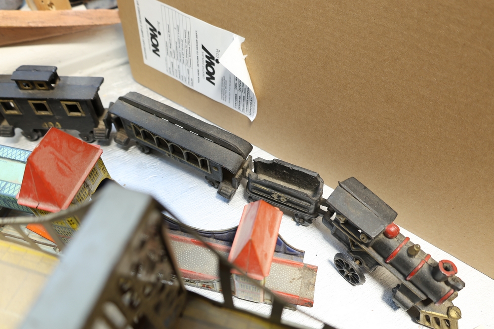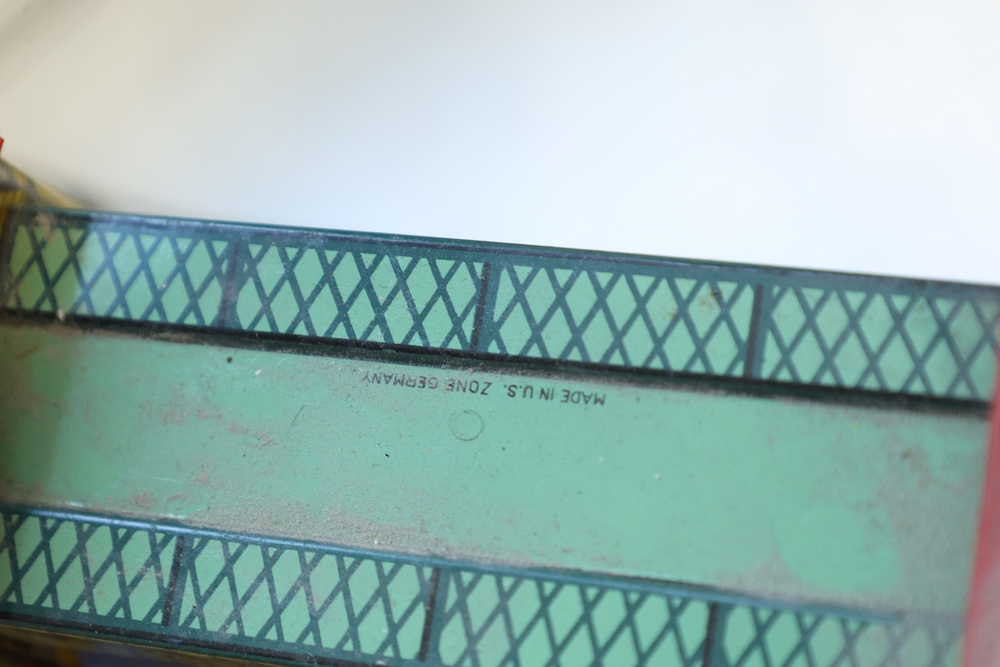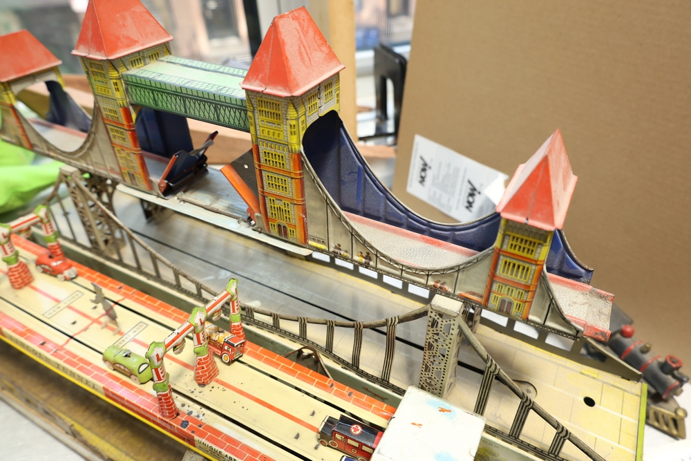 Unique Art Mfg. Co. Lincoln Tunnel tin litho toy roadway with cars, bus, and traffic officer figure, together with tin litho bridge section marked Made in U.S. Zone Germany and small cast metal toy train with locomotive, tender, and cars.