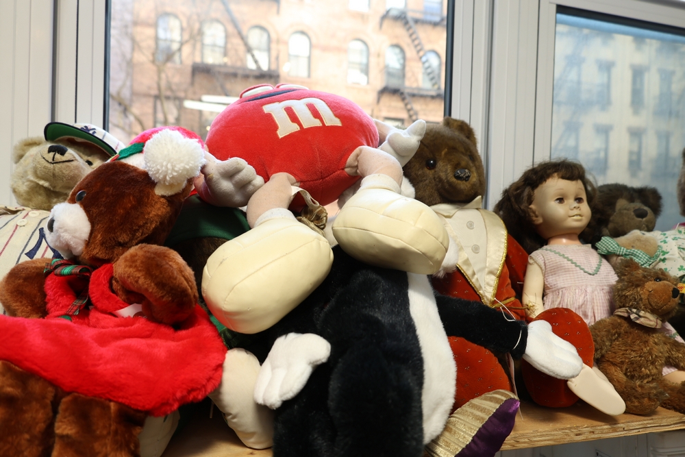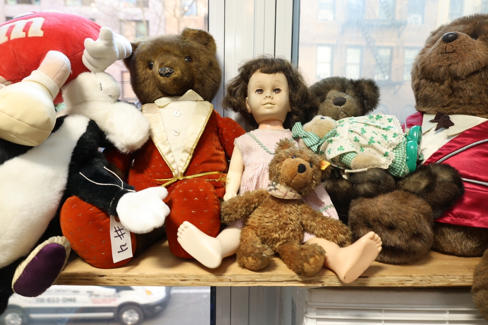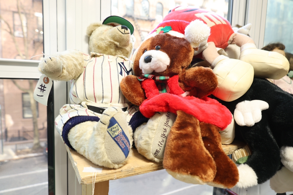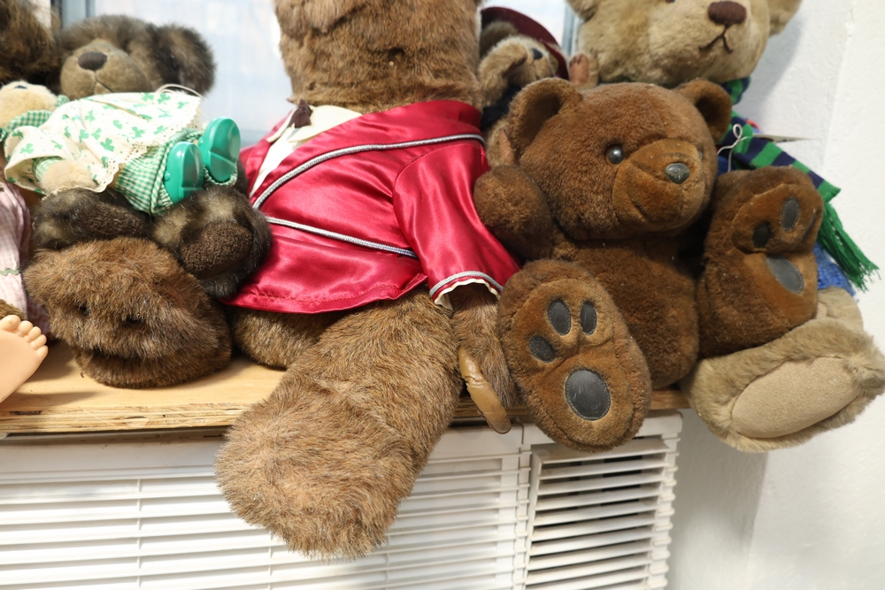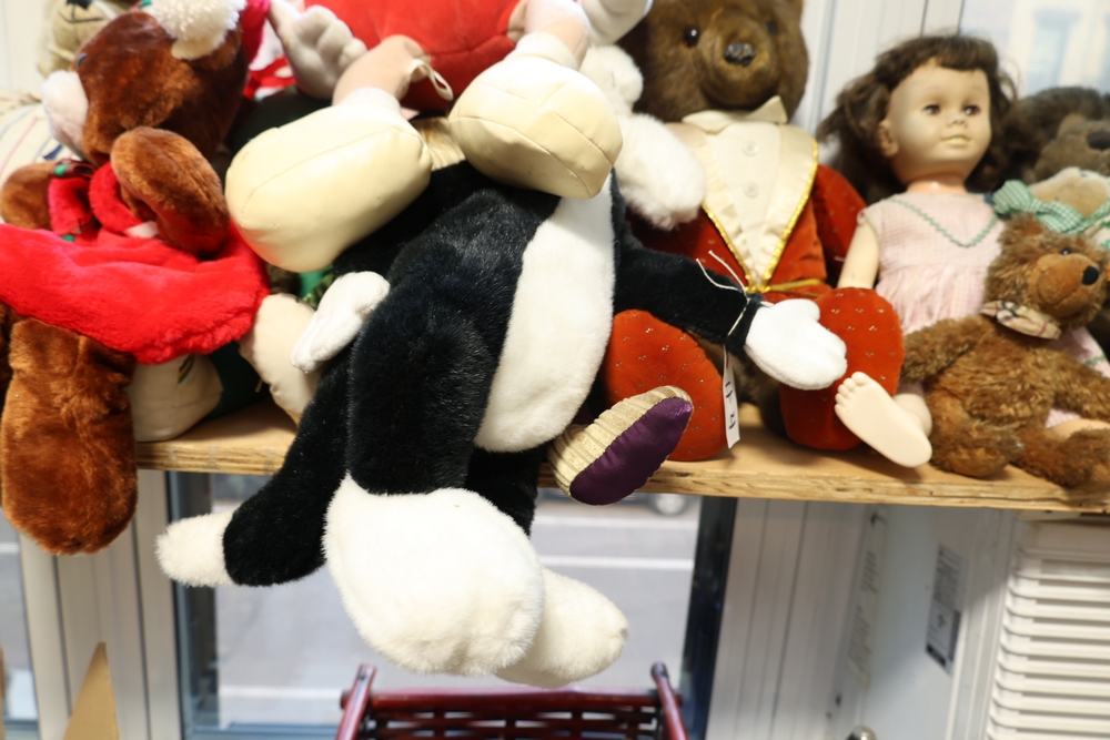 Group of plush toys and dolls including Kermit the Frog plush figure, M&M character plush, Sylvester the Cat plush, multiple teddy bears including examples in clothing, New York Yankees uniform teddy bear, and a small doll in pink dress.