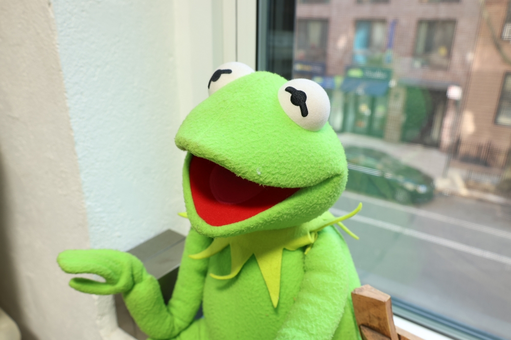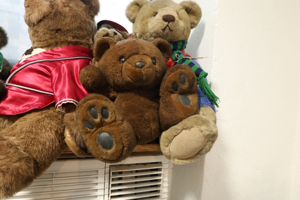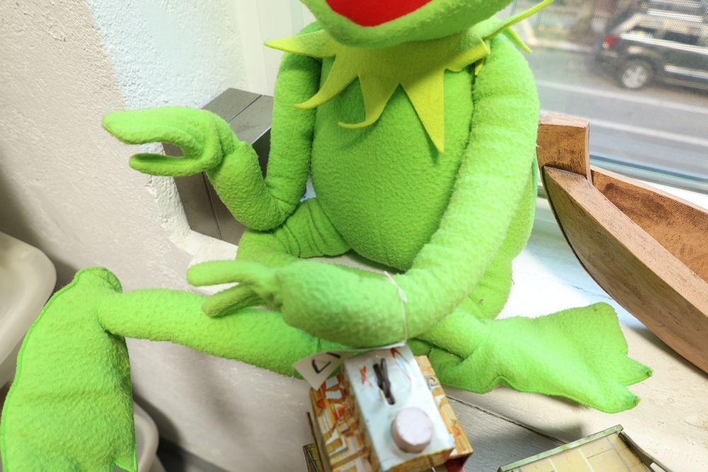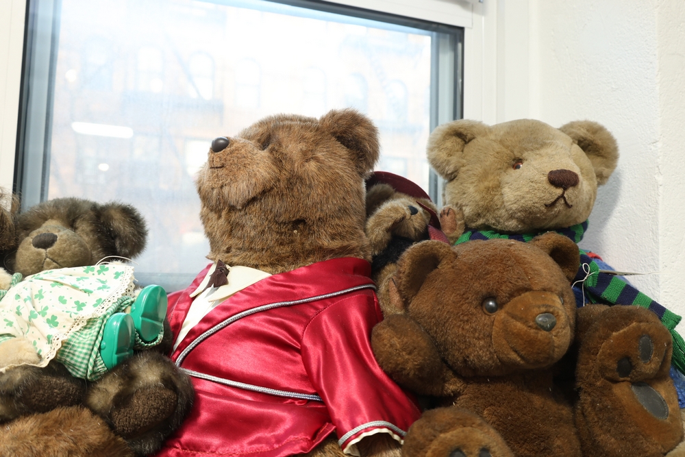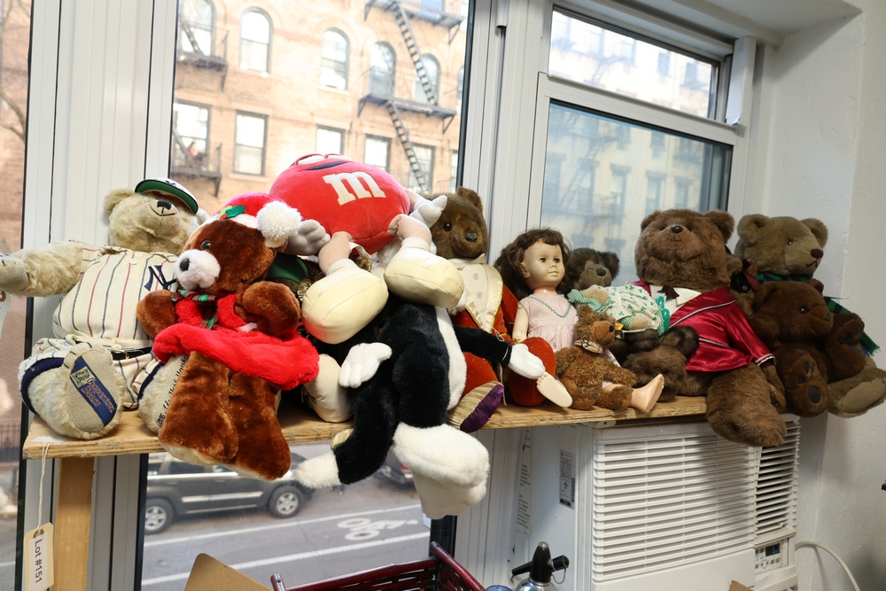 Group of plush toys and dolls including Kermit the Frog plush figure, M&M character plush, Sylvester the Cat plush, multiple teddy bears including examples in clothing, New York Yankees uniform teddy bear, and a small doll in pink dress.