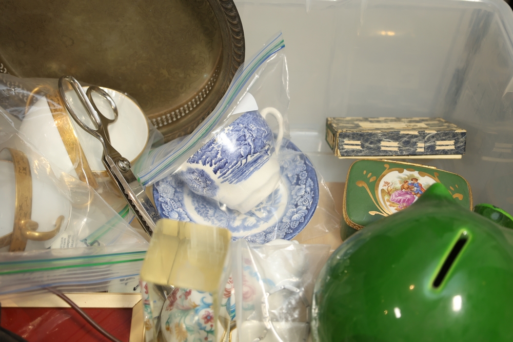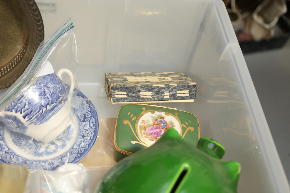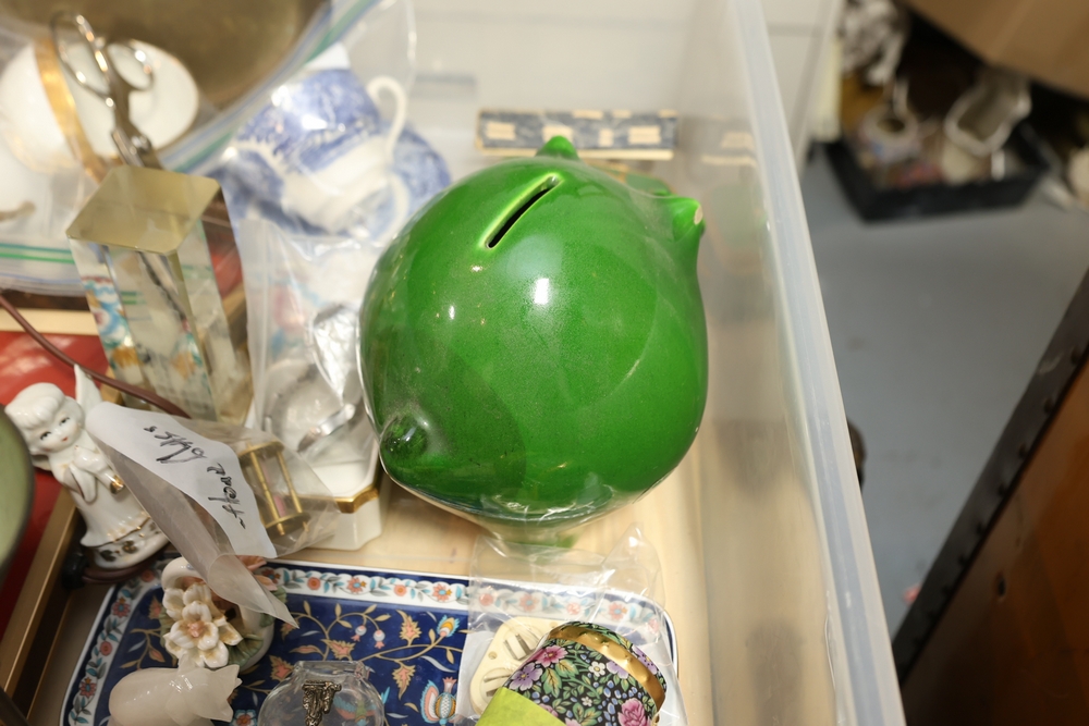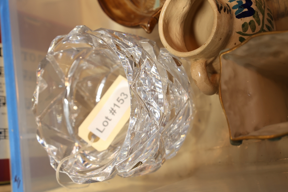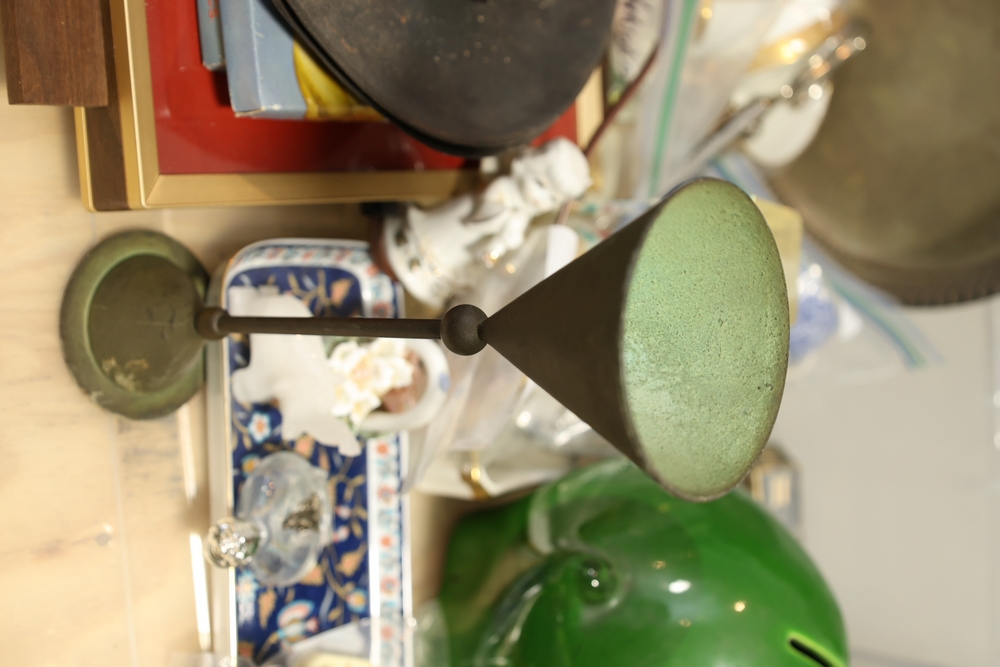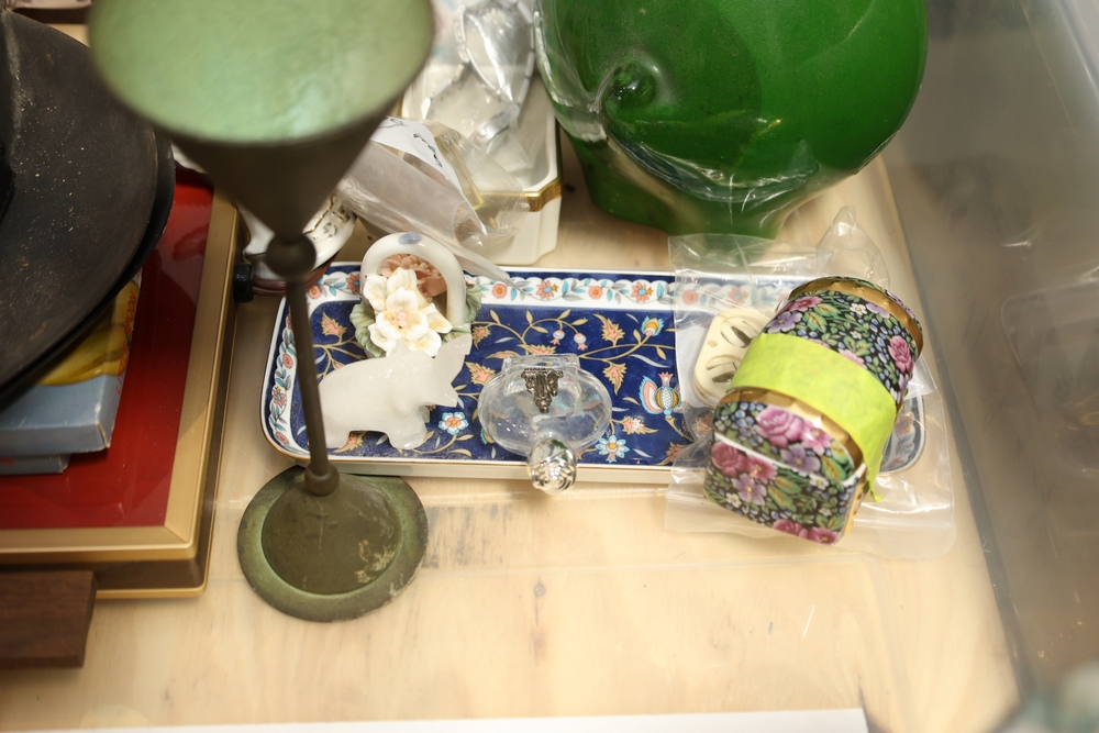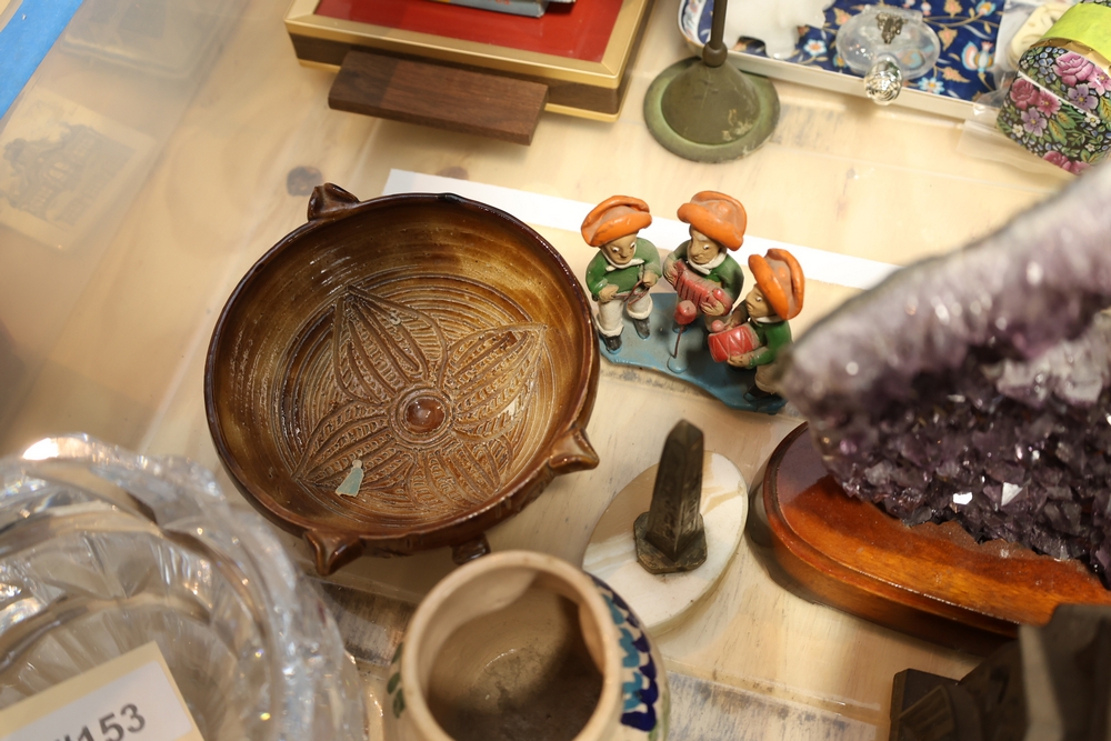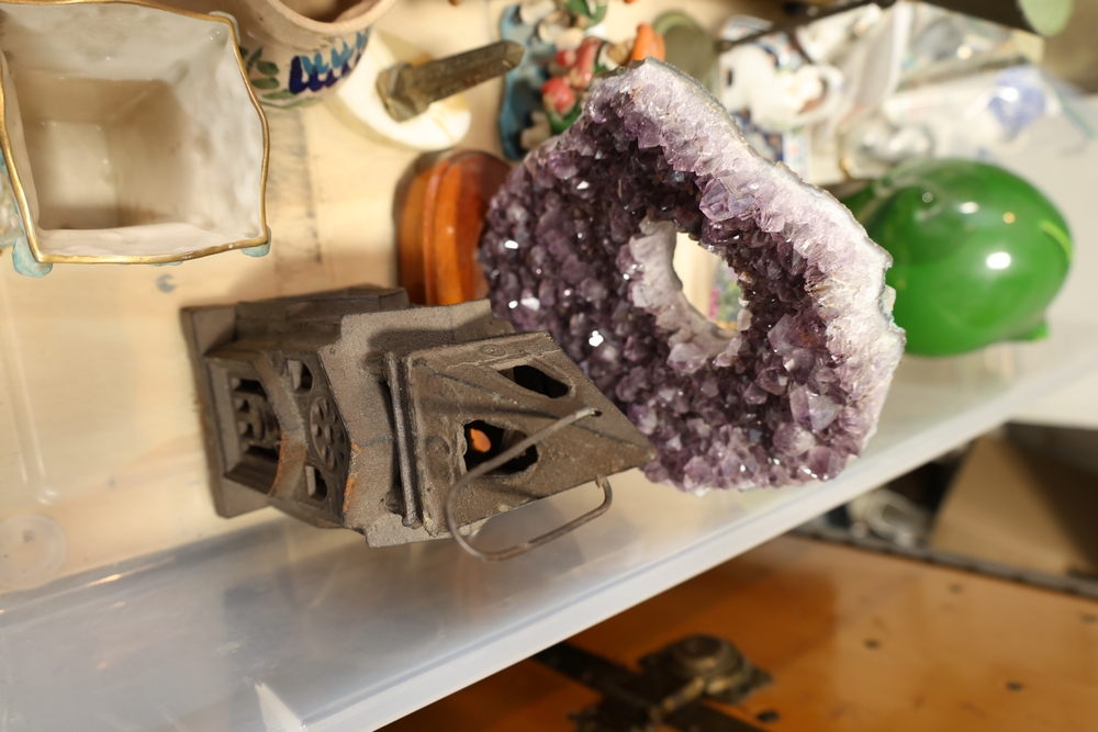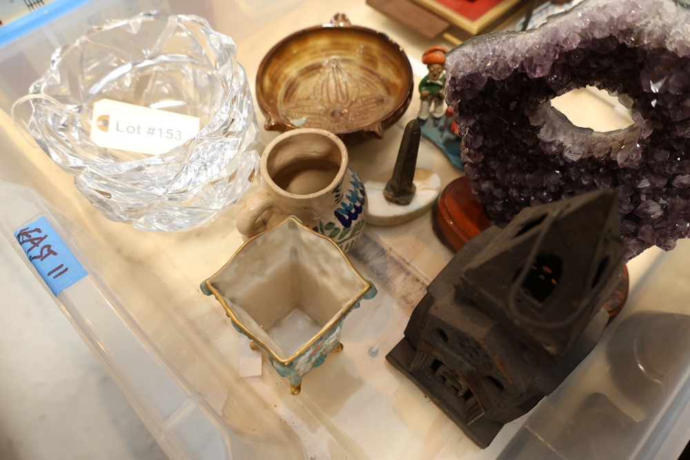 Mixed decorative items including amethyst geode on stand, cut glass bowl, pottery dish, small ceramic pitcher, miniature cast metal house lantern, brass compote stand, small figurines, and assorted ceramics and serving pieces.