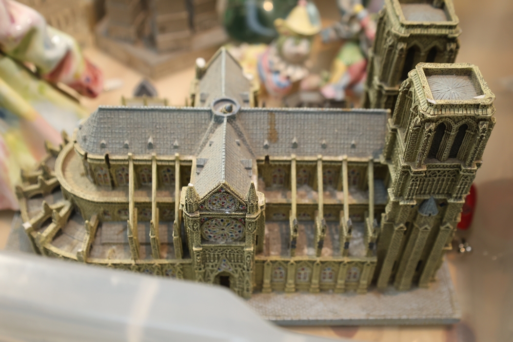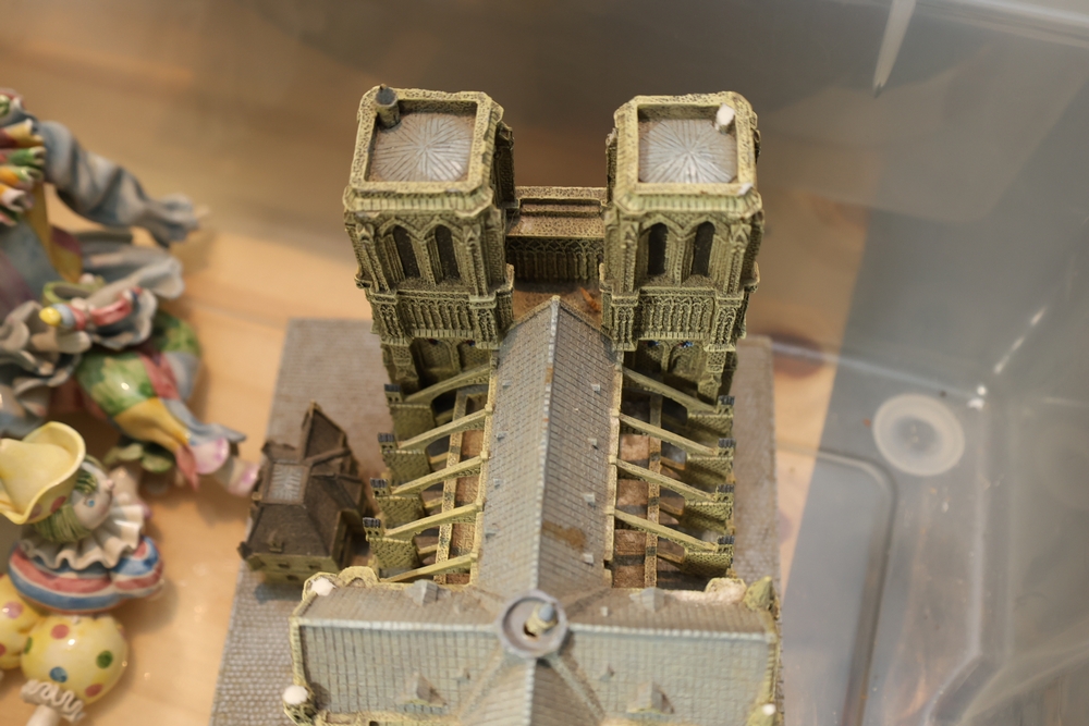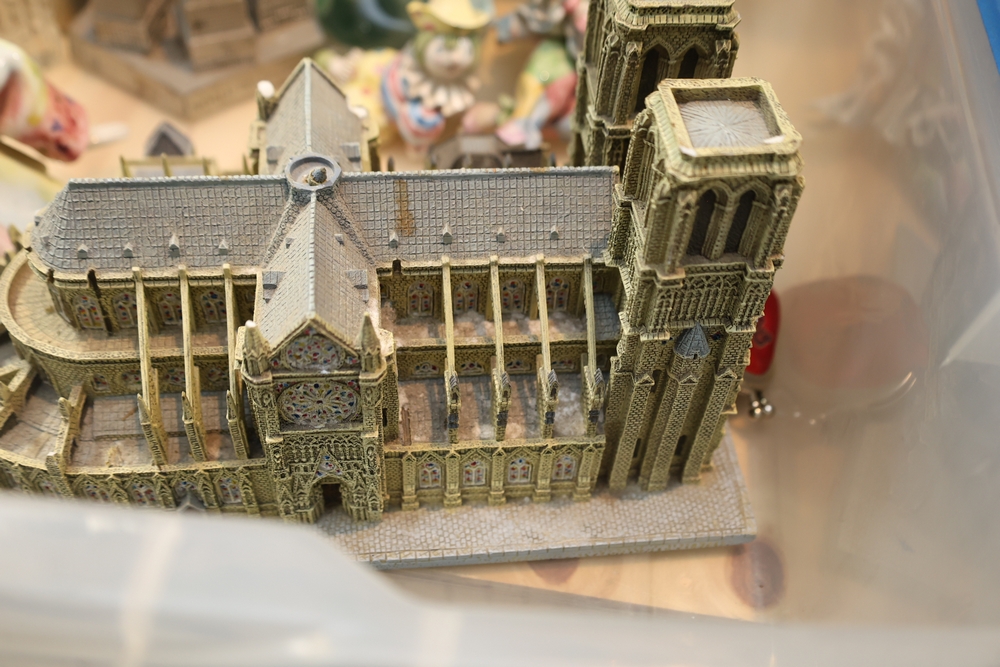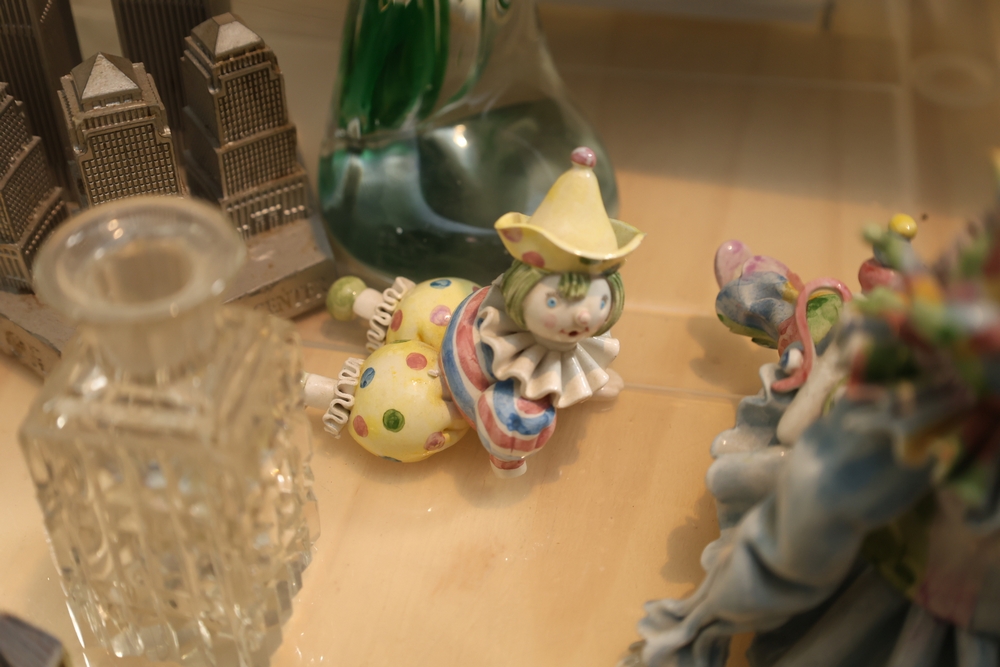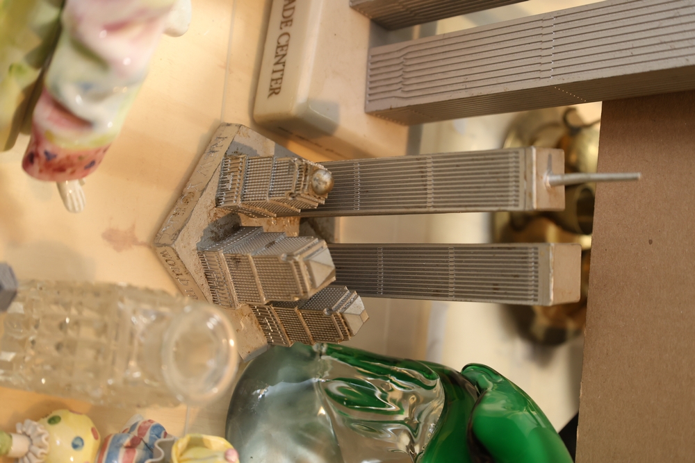 Clown figurines, World Trade Center and New York skyline models, Notre Dame cathedral model, glass bird figure, and glass bottle.