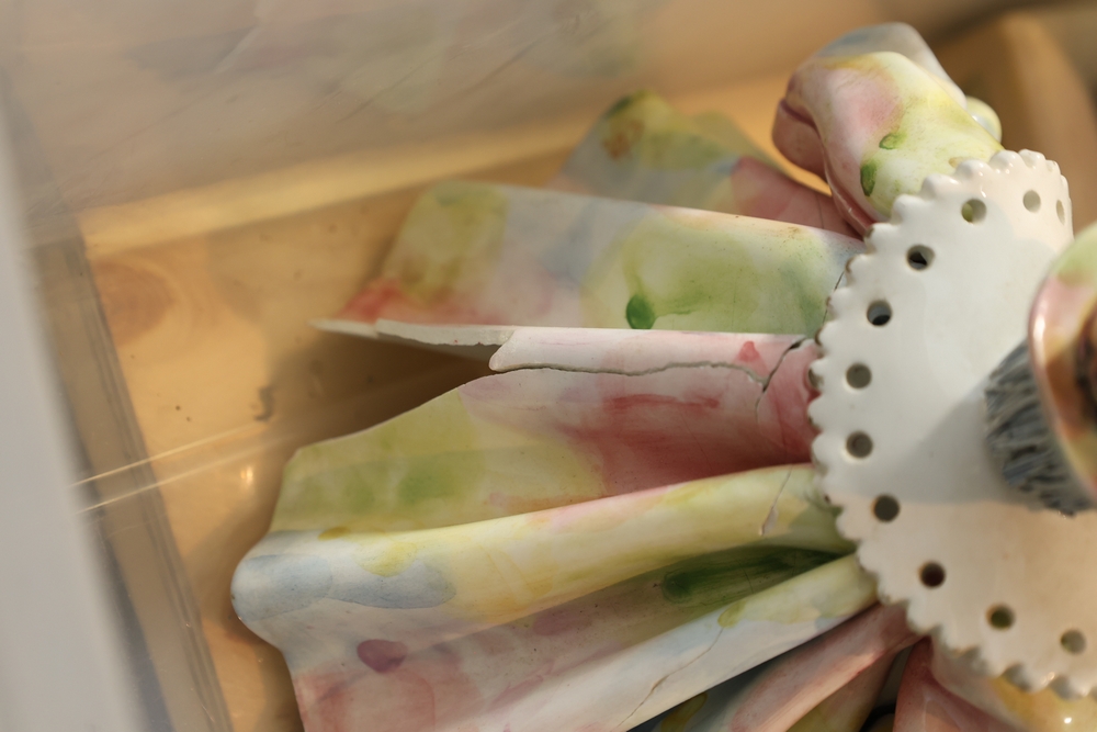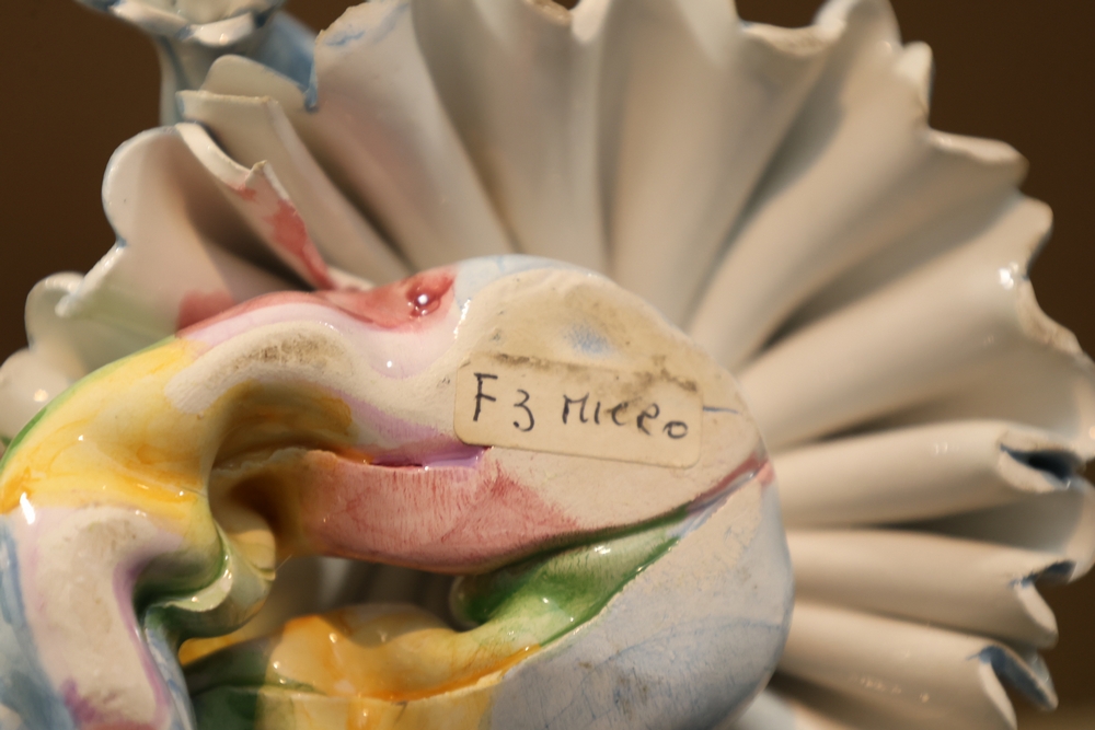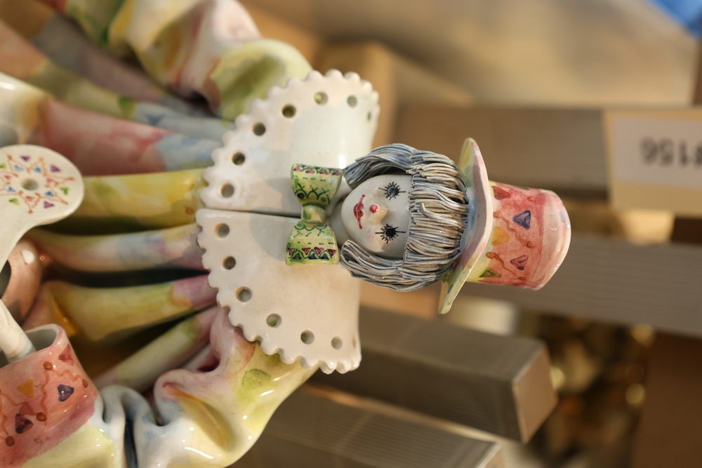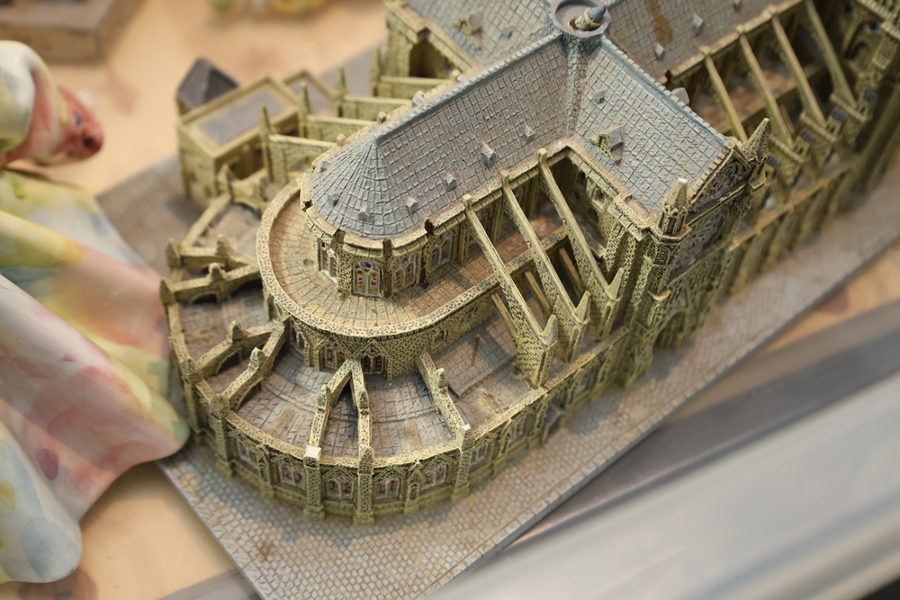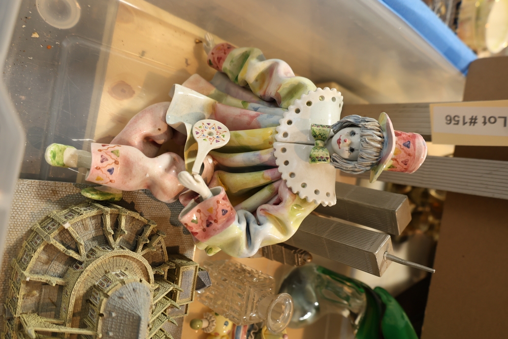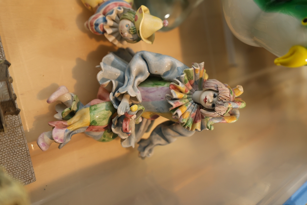 Clown figurines, World Trade Center and New York skyline models, Notre Dame cathedral model, glass bird figure, and glass bottle.