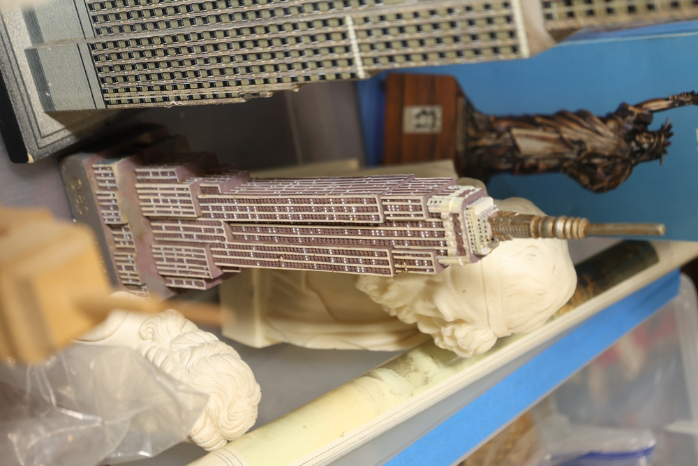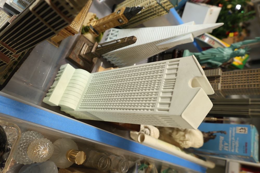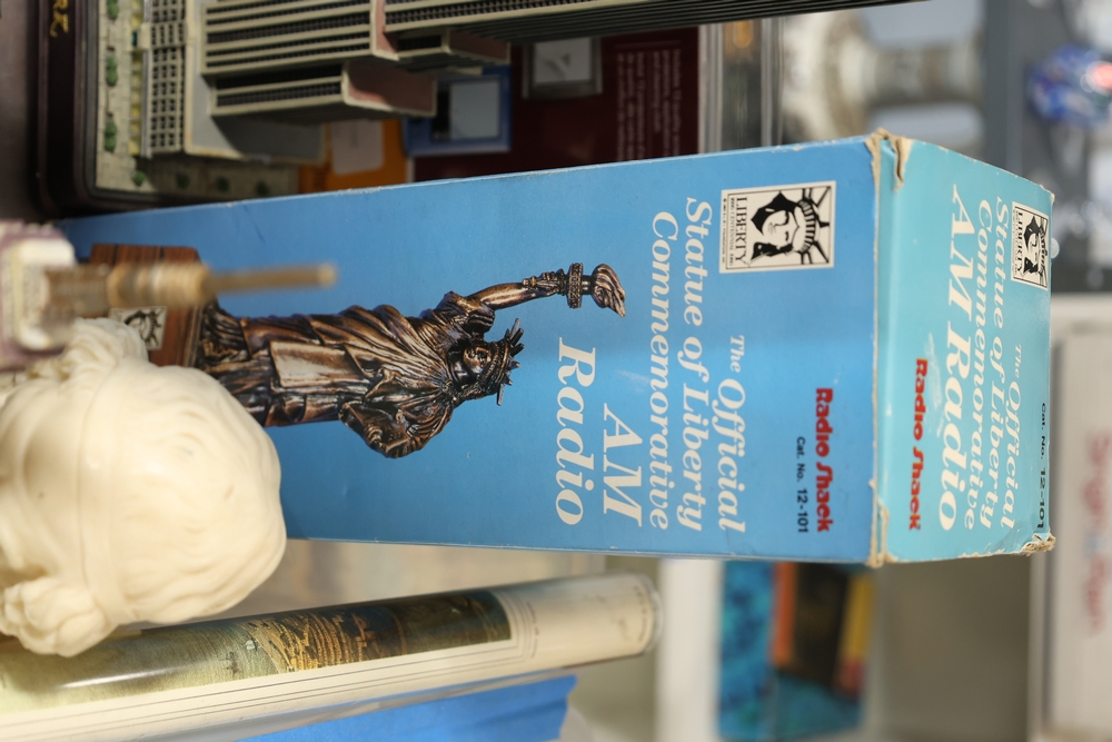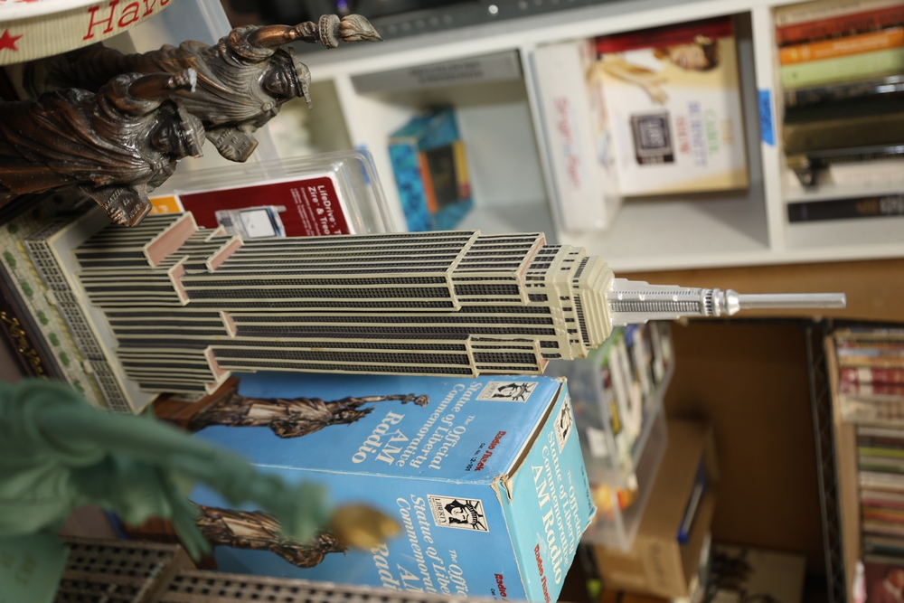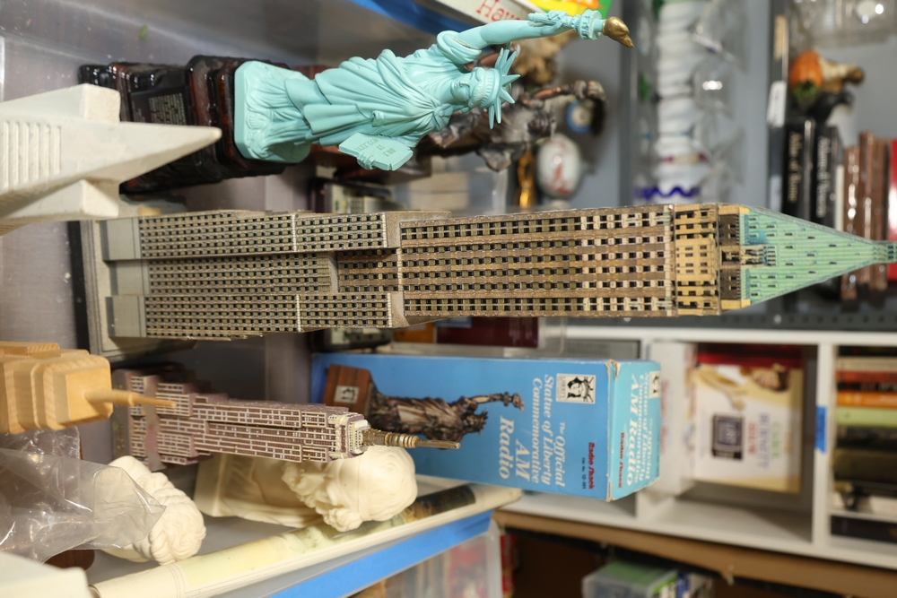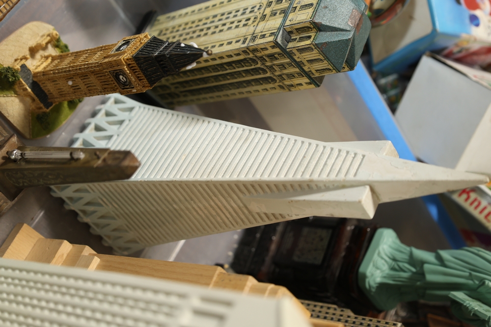 Assorted landmark souvenir models including Empire State Building examples, Chrysler Building, Eiffel Tower, Transamerica Pyramid, Big Ben clock tower, and Statue of Liberty figures, together with a Radio Shack Statue of Liberty Commemorative AM Radio in box.