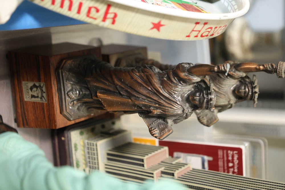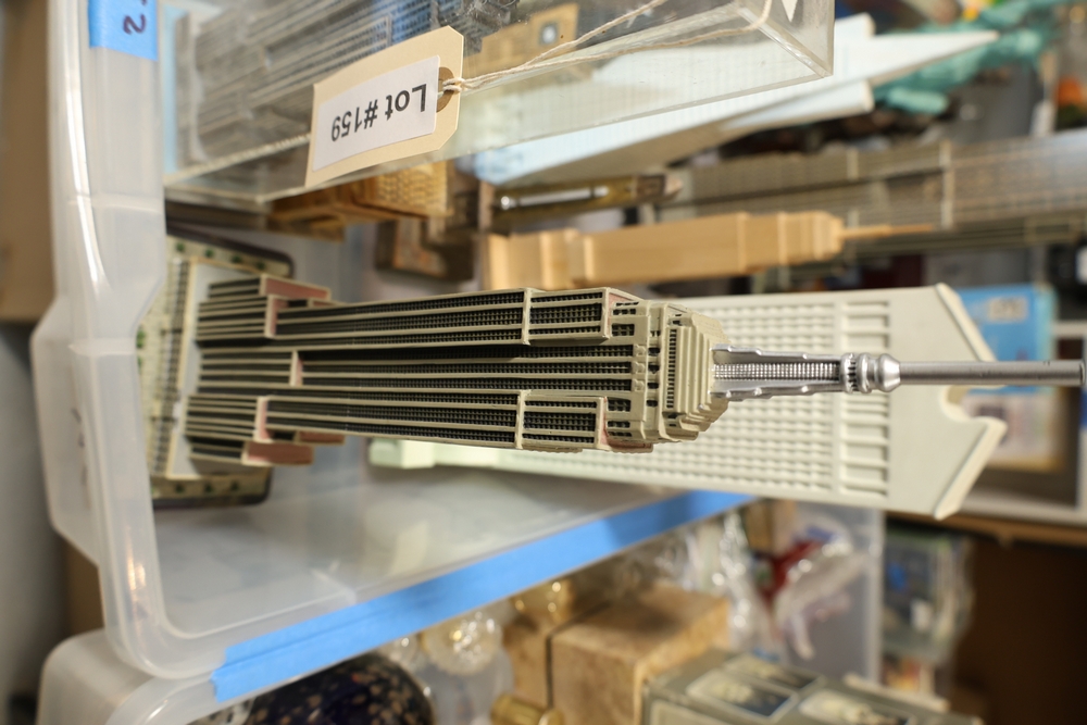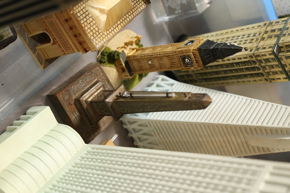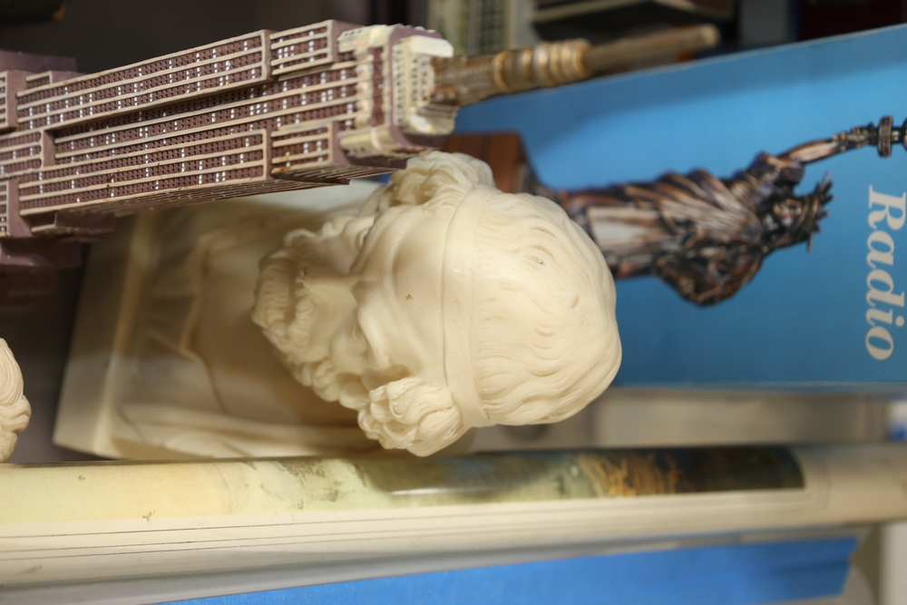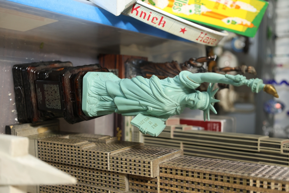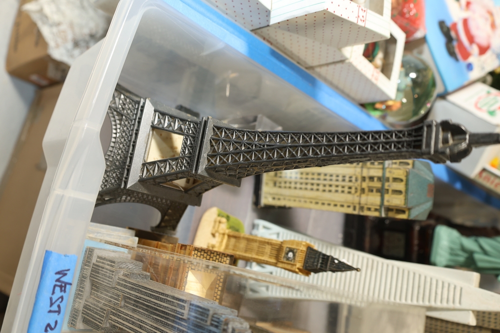 Assorted landmark souvenir models including Empire State Building examples, Chrysler Building, Eiffel Tower, Transamerica Pyramid, Big Ben clock tower, and Statue of Liberty figures, together with a Radio Shack Statue of Liberty Commemorative AM Radio in box.
