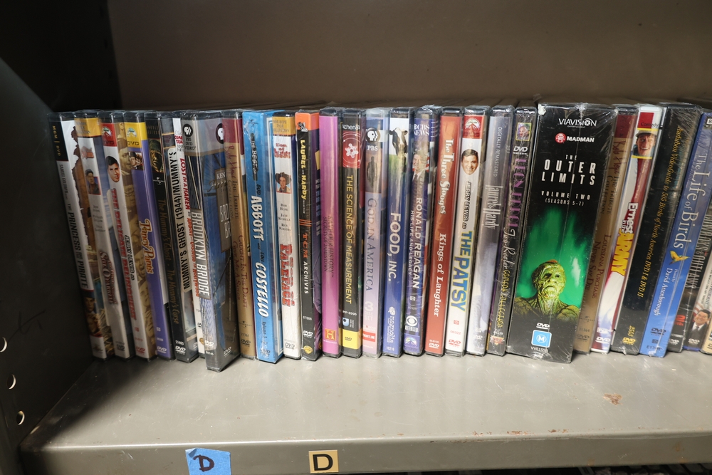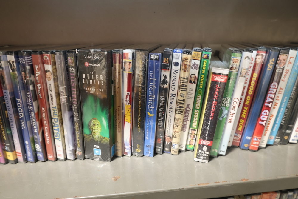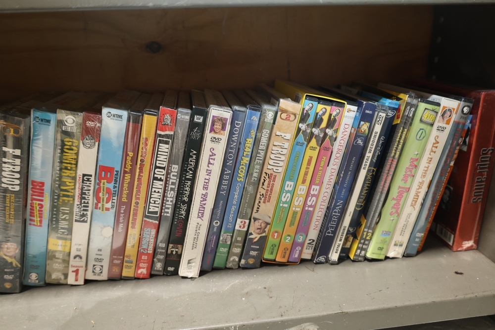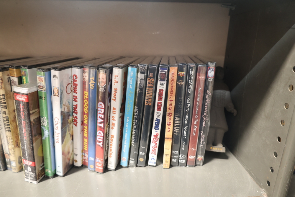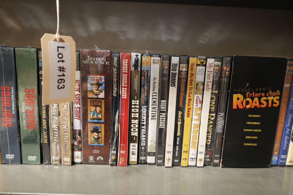 Approx 373 assorted DVD movies, television series, documentary titles, and boxed set collections including Doctor Who, The Sopranos seasons, Kung Fu Collection, Alfred Hitchcock titles, John Wayne westerns, Charlie Chaplin collections, The Three Stooges, Laurel and Hardy, PBS and History Channel documentaries, animated titles, and additional film and television DVD sets.