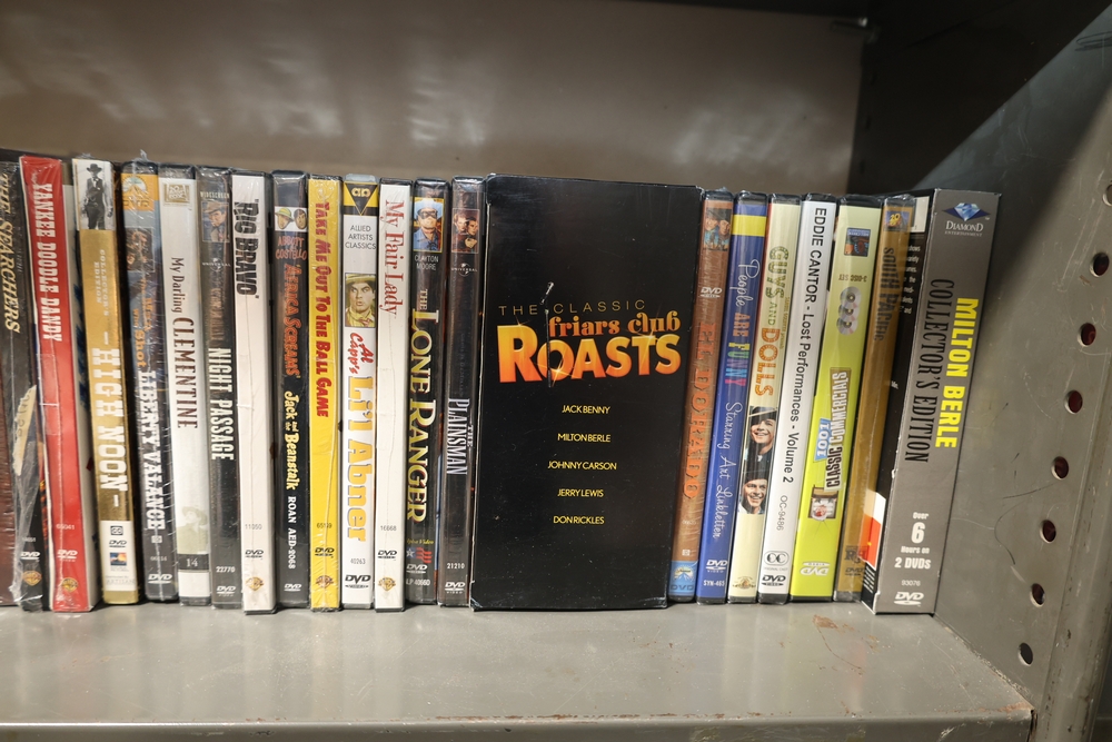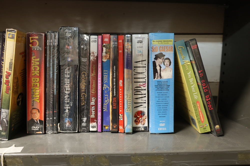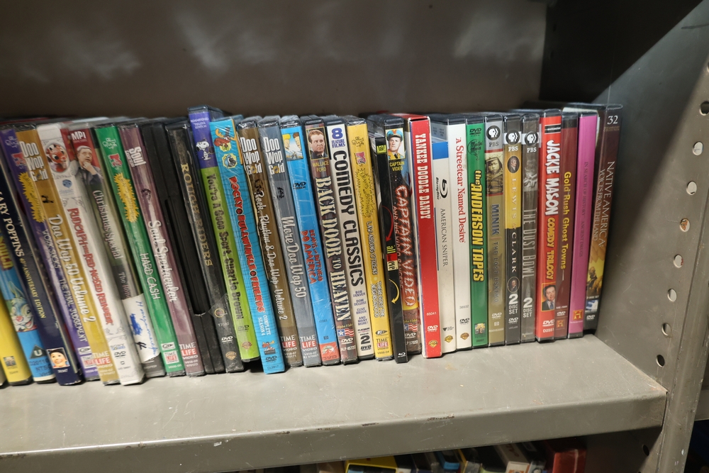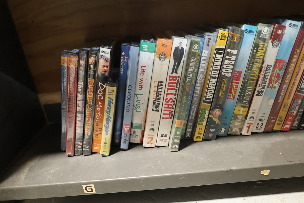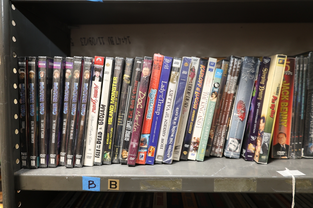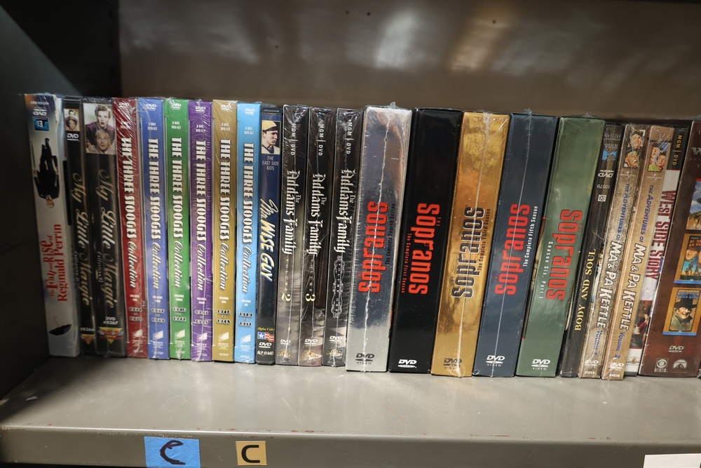 Approx 373 assorted DVD movies, television series, documentary titles, and boxed set collections including Doctor Who, The Sopranos seasons, Kung Fu Collection, Alfred Hitchcock titles, John Wayne westerns, Charlie Chaplin collections, The Three Stooges, Laurel and Hardy, PBS and History Channel documentaries, animated titles, and additional film and television DVD sets.