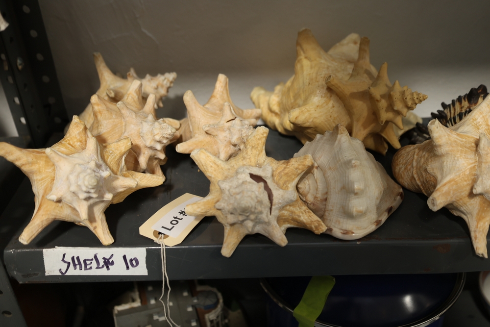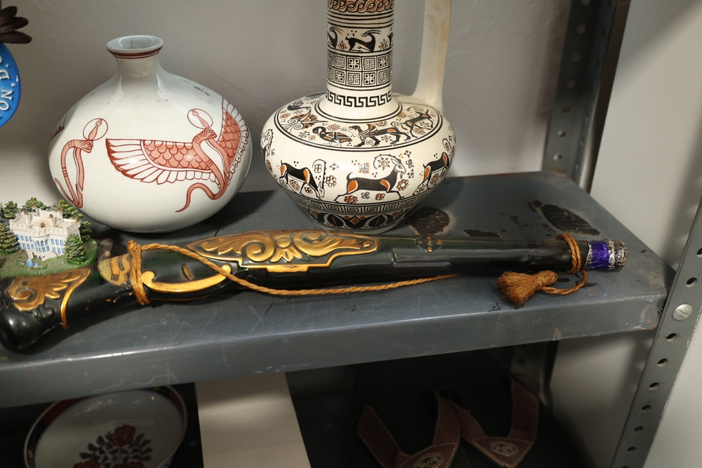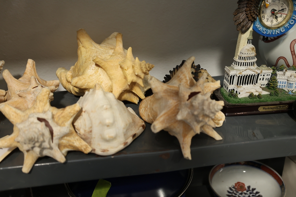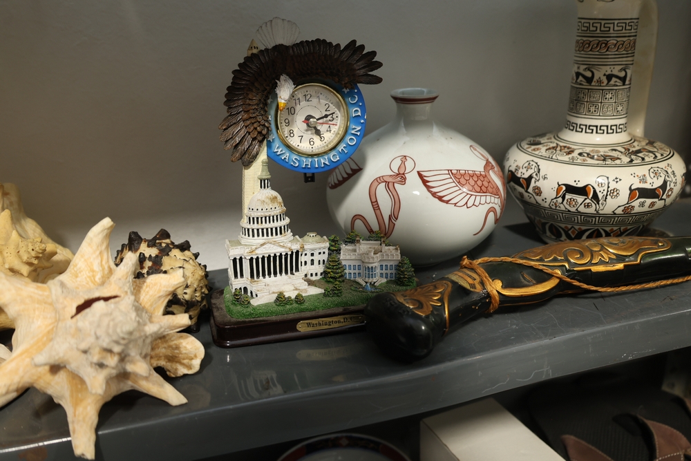Group of assorted large seashell specimens, Washington D.C. souvenir clock with U.S. Capitol and White House base, decorative round vase with bird motif, handled decorative pitcher with geometric and animal pattern, and long decorative bottle shaped object with gold colored scroll design and cord with tassel.