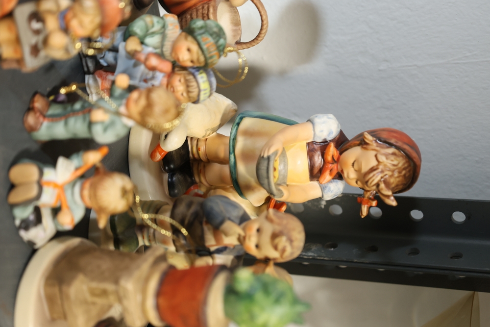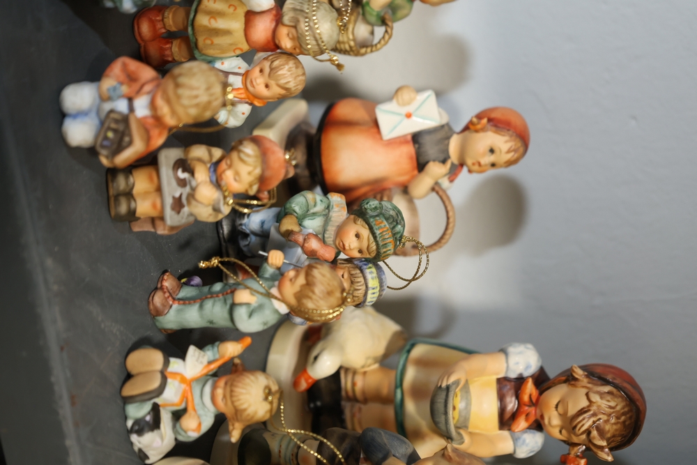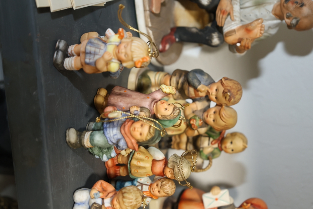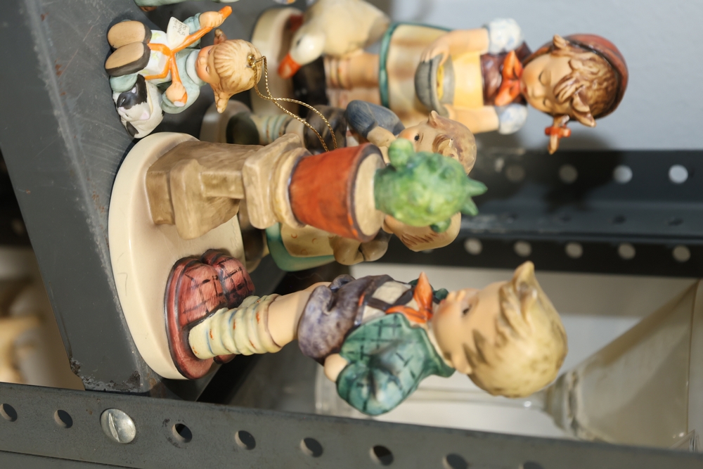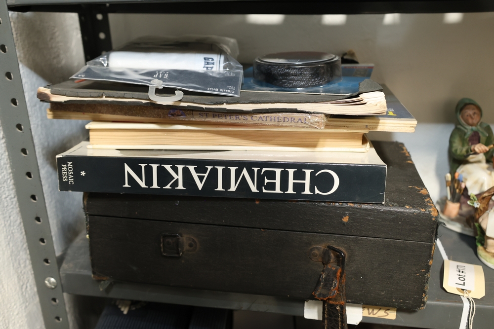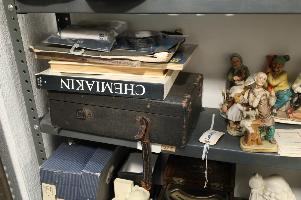 Shelf lot including assorted Hummel style figurines depicting children and adults, including examples of children holding letters, baskets, musical instruments, books, and animals, group of small figurines with gold hanging cords, larger figurines including girl holding bowl with goose, boy standing beside pedestal with potted plant, seated figures on base including man holding bandaged foot and man with horn, figure of woman painting with palette and brushes, and figure of man at sewing machine with child, together with stack of books including title Chemiakin, book titled St Peter's Cathedral, additional books and papers, and Society for Visual Education miniature projector Model AK 120 volts 300 watts with label, and black wooden case.