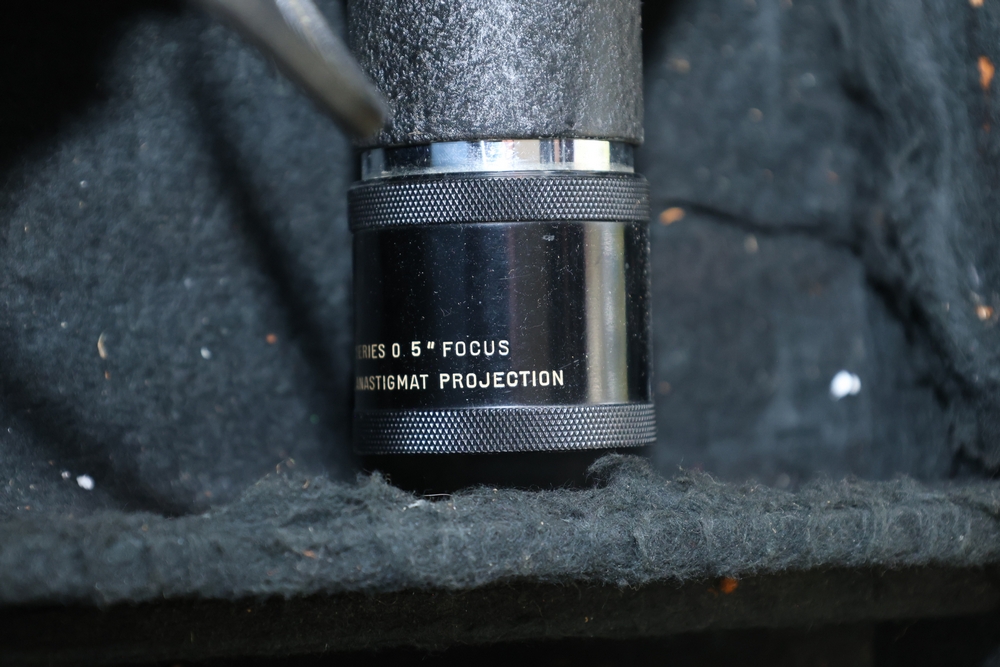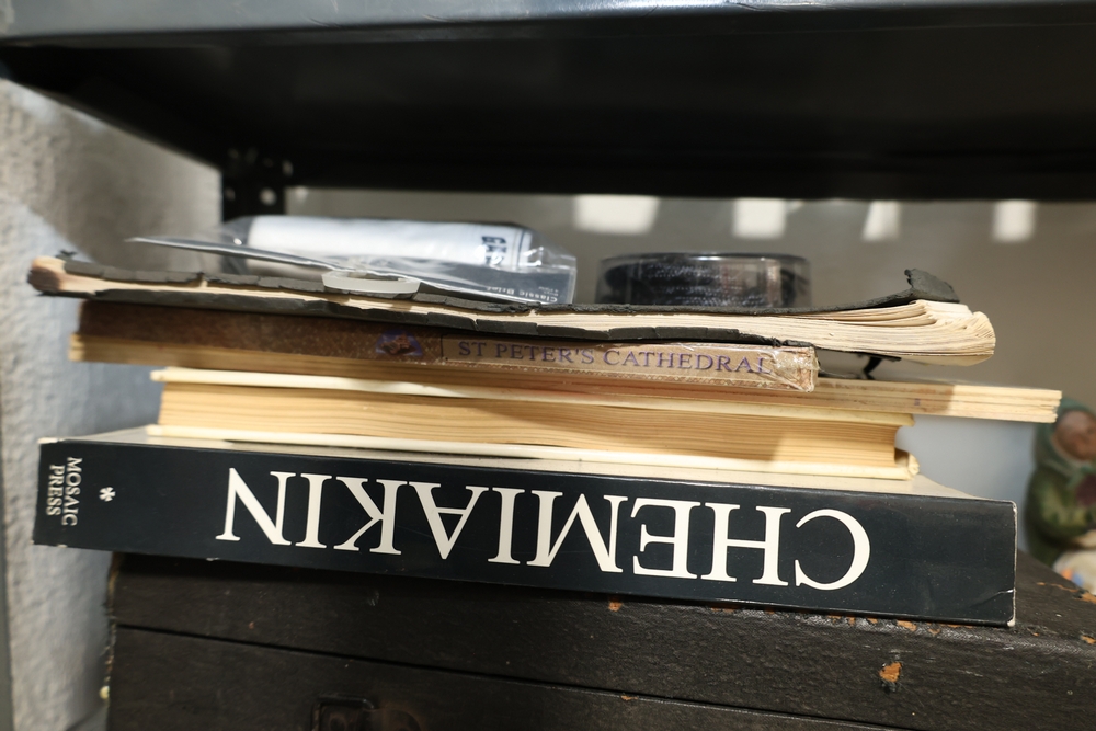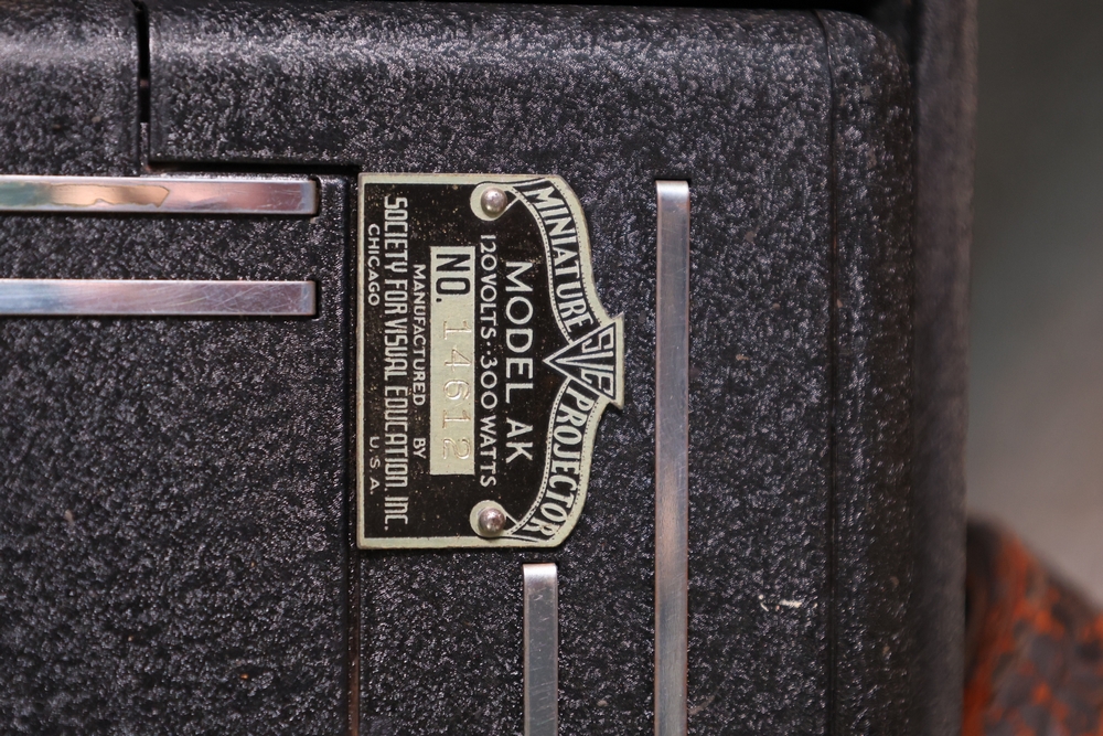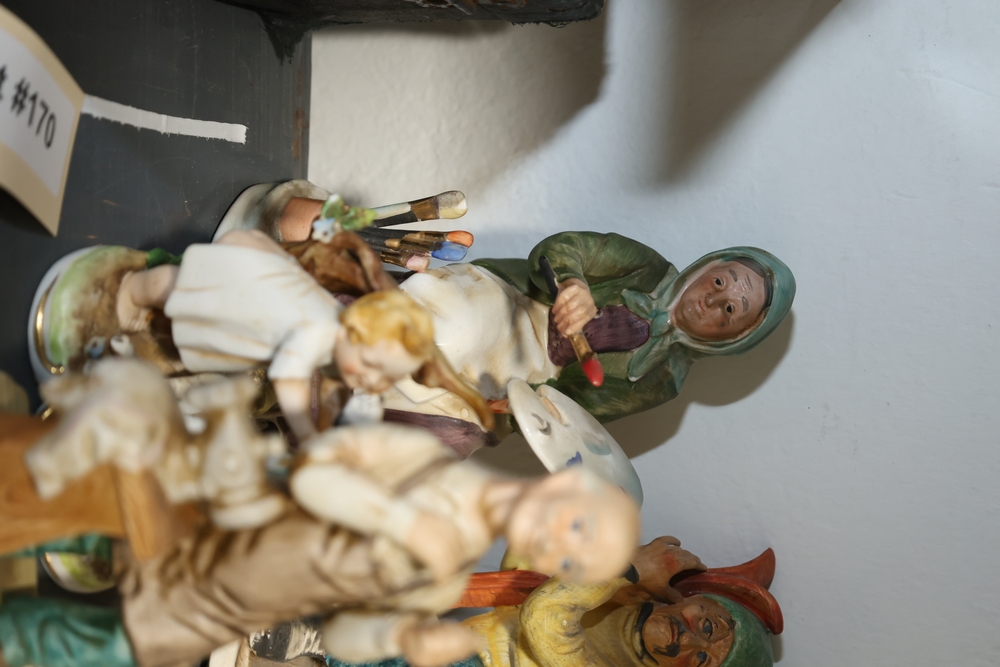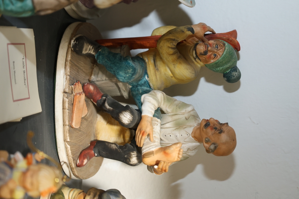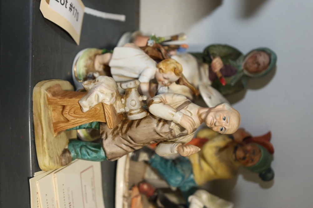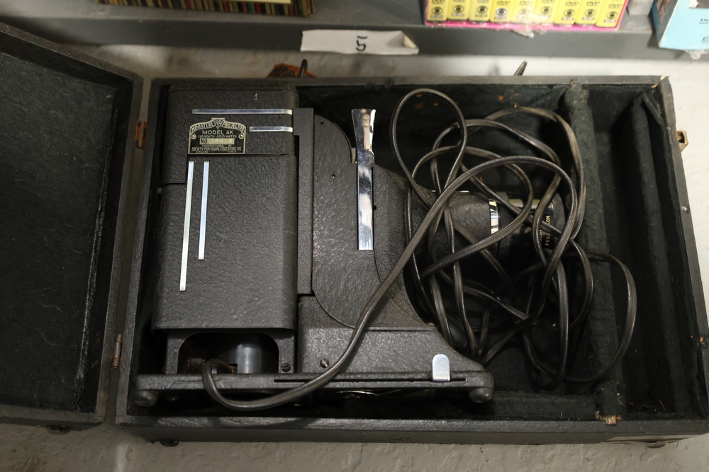Shelf lot including assorted Hummel style figurines depicting children and adults, including examples of children holding letters, baskets, musical instruments, books, and animals, group of small figurines with gold hanging cords, larger figurines including girl holding bowl with goose, boy standing beside pedestal with potted plant, seated figures on base including man holding bandaged foot and man with horn, figure of woman painting with palette and brushes, and figure of man at sewing machine with child, together with stack of books including title Chemiakin, book titled St Peter's Cathedral, additional books and papers, and Society for Visual Education miniature projector Model AK 120 volts 300 watts with label, and black wooden case.