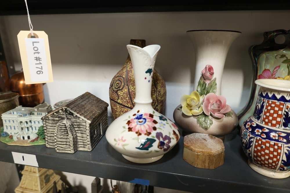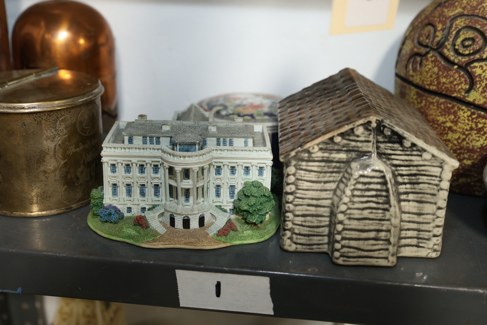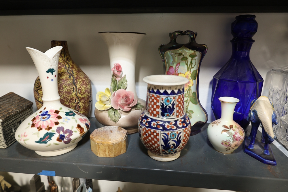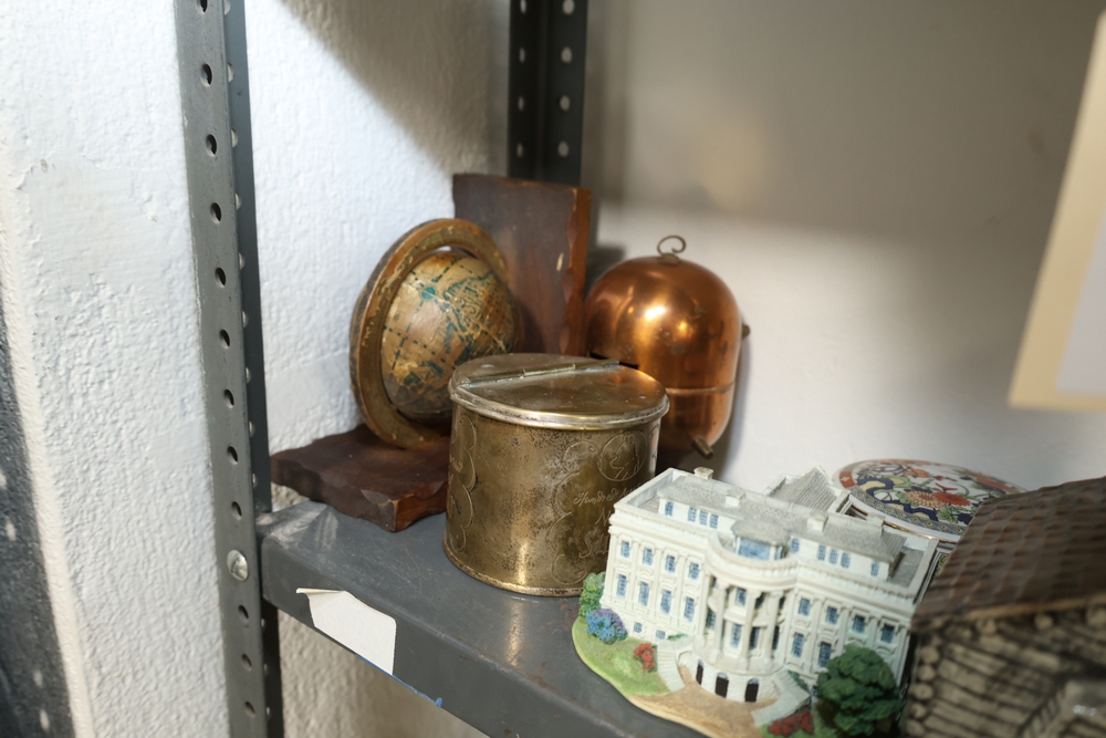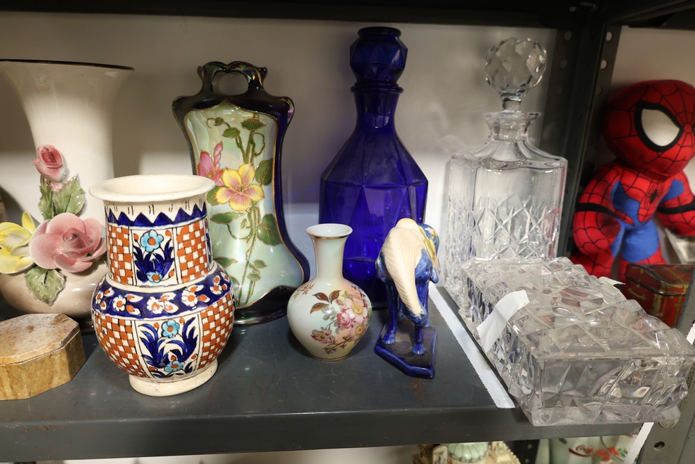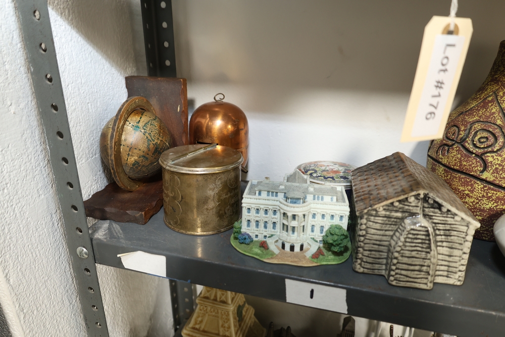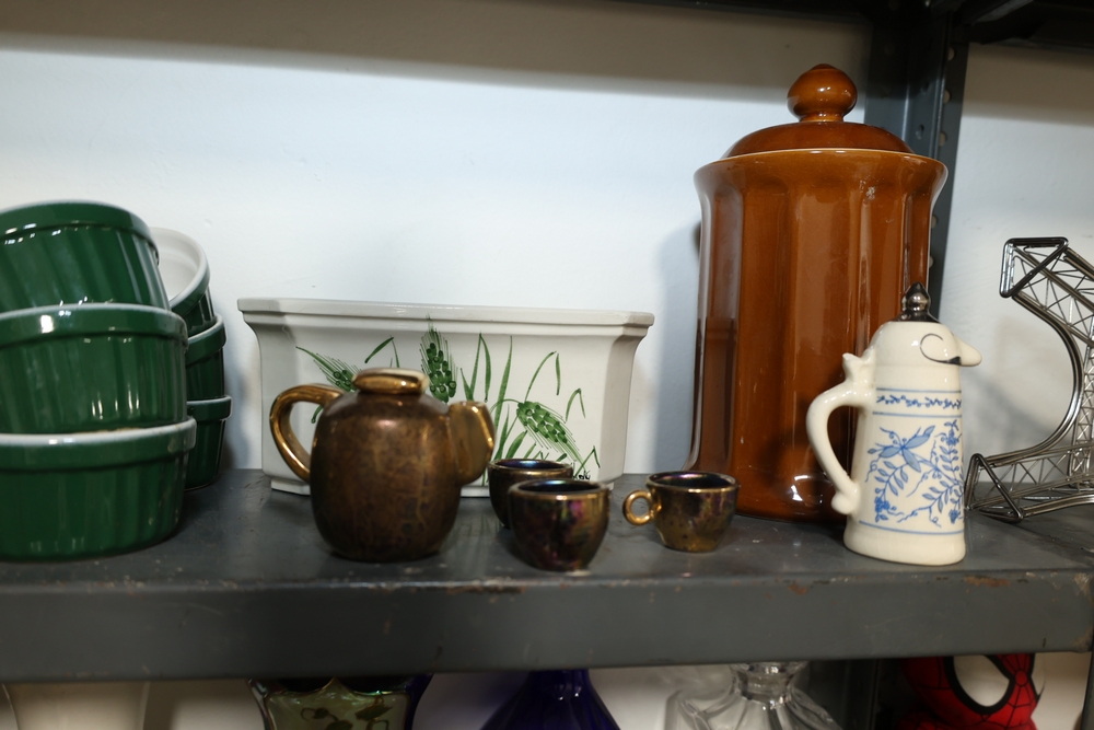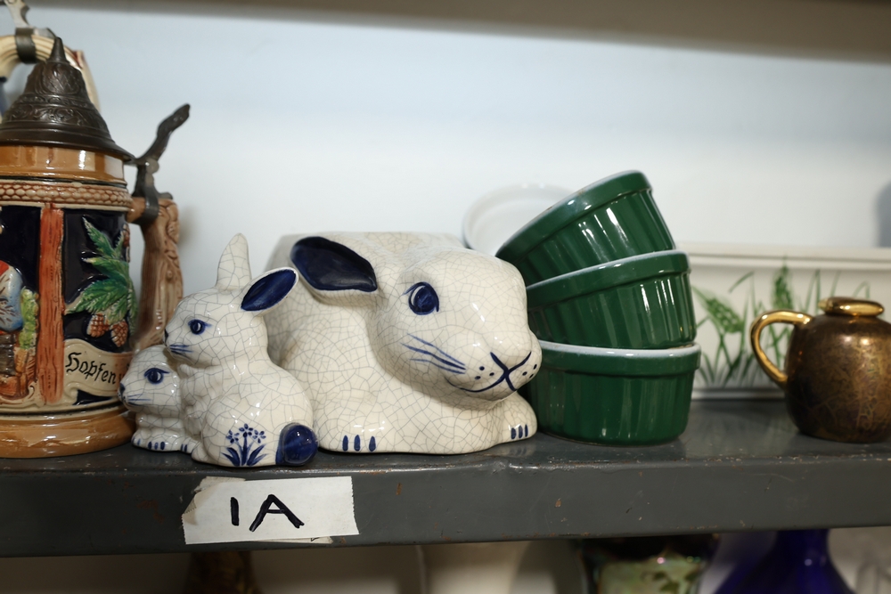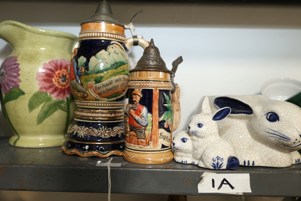 Two shelf lot including green stone mortar and pestle, ceramic pitcher with pink flower decoration, two German style lidded beer steins with figural panels and pewter lids, white ceramic rabbit and two smaller rabbits figure group, four green ceramic ramekins, rectangular ceramic planter with wheat design, small copper tone teapot, two small metallic cups, tall amber glass jar with lid, blue and white ceramic pitcher, metal Eiffel Tower form sculpture, small globe on wood stand, copper tone apple form container, brass tone lidded tin, White House building model, log cabin form model, assorted decorative vases including floral decorated porcelain and pottery examples, cobalt blue glass decanter, cut glass decanter, cut glass lidded dish, small porcelain floral vase, blue horse figure, and plush Spider Man figure.