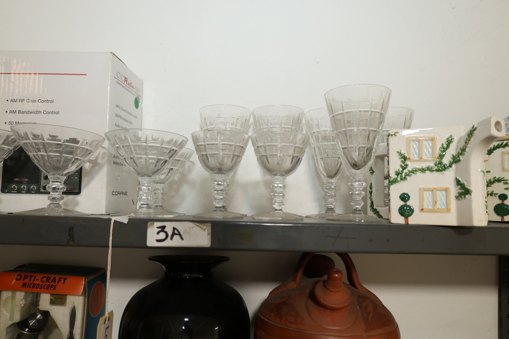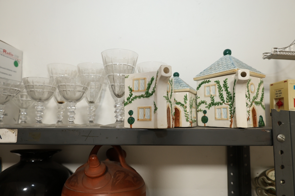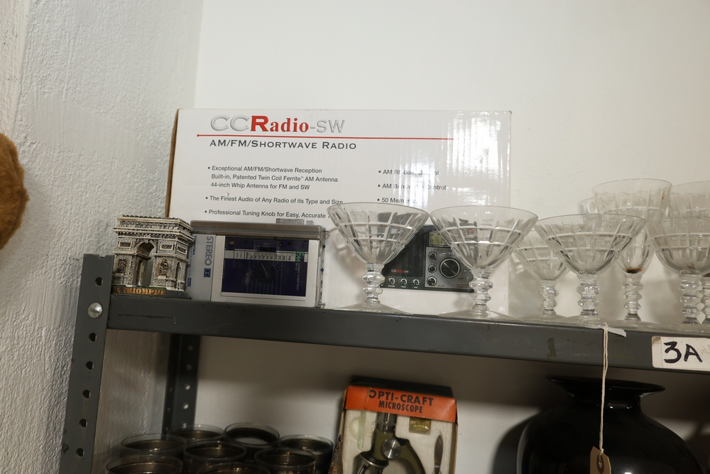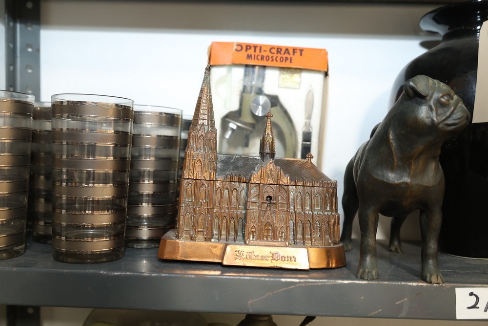 Clear stemmed glass coupe style glasses, set of smoky glass tumblers with horizontal band decoration, Kolner Dom cathedral form metal souvenir bank, Opti Craft microscope in box, small bulldog figure, black glass vase, large red ceramic jug with handle, two ceramic house form wall hangings with blue roofs and vine decoration, Arc de Triomphe architectural model, stereo cassette tapes in plastic cases, and CC Radio SW AM FM Shortwave Radio in box.