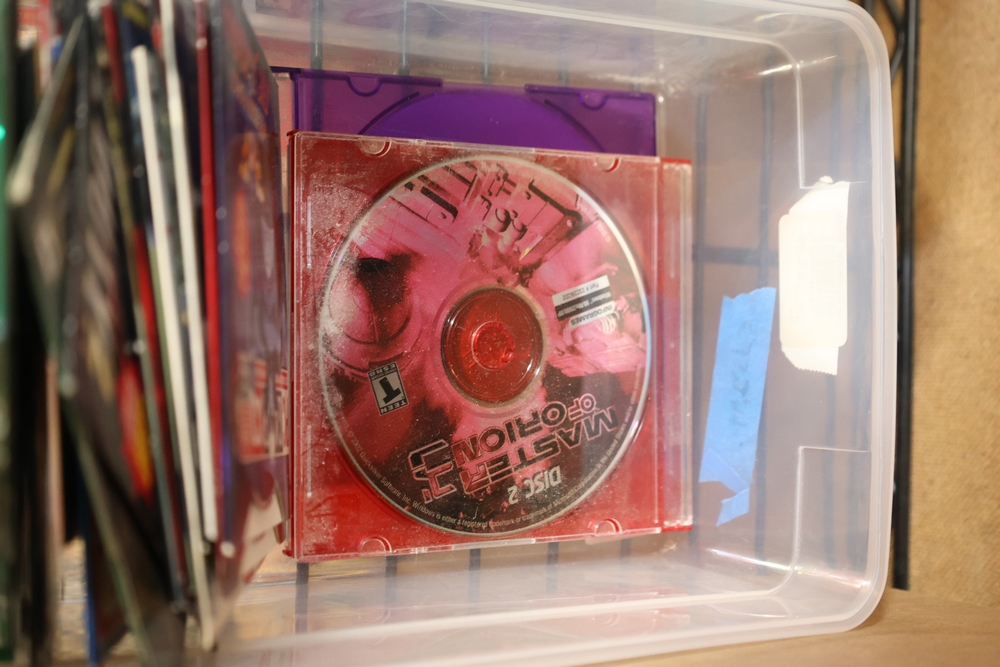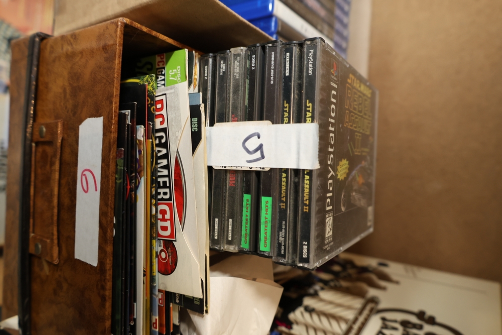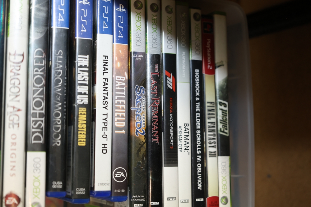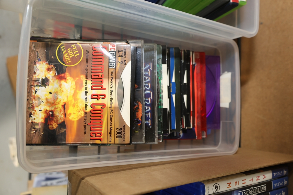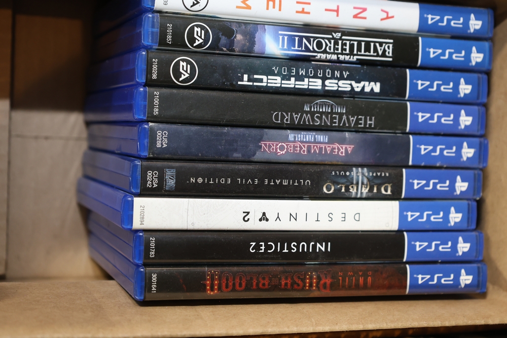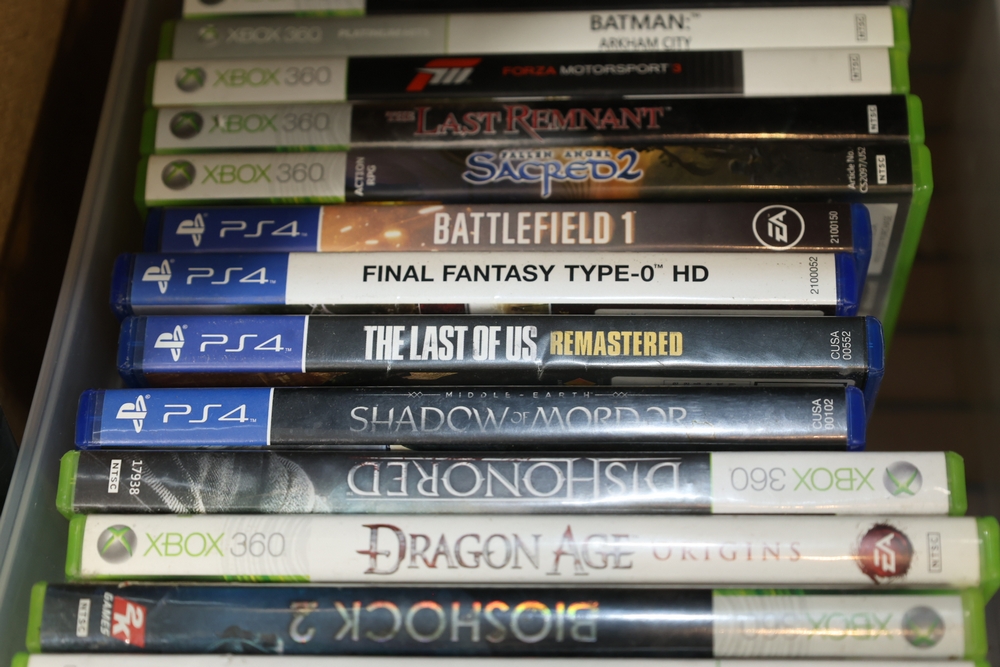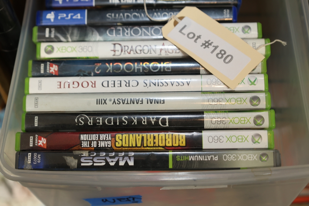 Group of video games and computer game media including Xbox 360 titles Mass Effect, Borderlands Game of the Year Edition, DarkSiders, Final Fantasy XIII, Assassin's Creed Rogue, BioShock 2, Dragon Age Origins, Dishonored, Batman Arkham City, Forza Motorsport 3, The Last Remnant, and Sacred 2 Fallen Angel, PlayStation 4 titles Battlefield 1, Final Fantasy Type-0 HD, The Last of Us Remastered, Middle Earth Shadow of Mordor, Star Wars Battlefront II, Mass Effect Andromeda, Heavy Rain and Beyond Two Souls Collection, A Realm Reborn Final Fantasy XIV, Diablo III Reaper of Souls Ultimate Evil Edition, Destiny 2, Injustice 2, and Until Dawn Rush of Blood, together with plastic bins of PC Gamer and Computer Gaming World magazine CD-ROM game discs including Command and Conquer November 2000 issue, City of Villains, Max Payne, and Return to Castle Wolfenstein Enemy Territory, and additional loose computer game discs in sleeves and jewel cases.