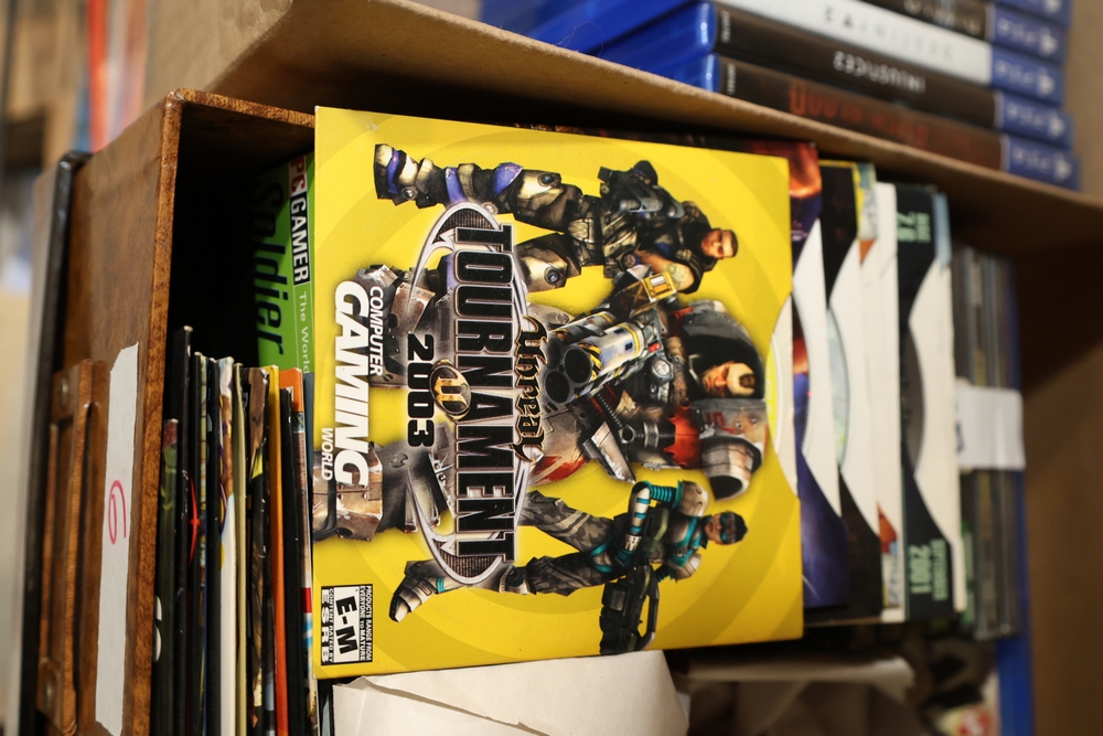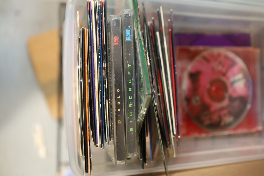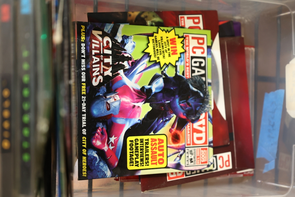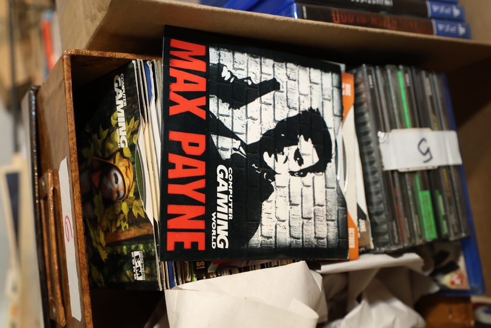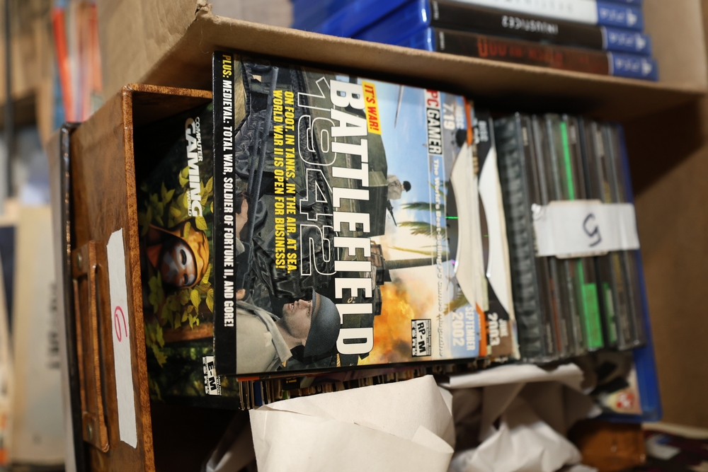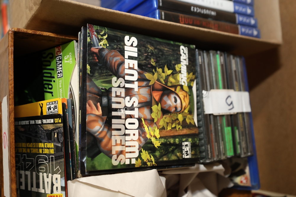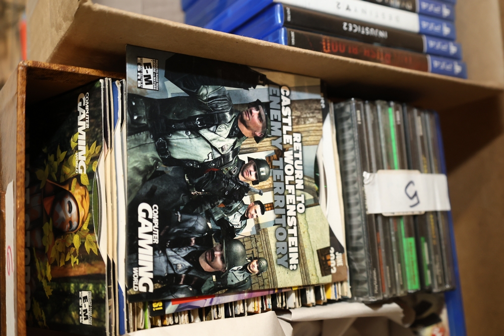 Group of video games and computer game media including Xbox 360 titles Mass Effect, Borderlands Game of the Year Edition, DarkSiders, Final Fantasy XIII, Assassin's Creed Rogue, BioShock 2, Dragon Age Origins, Dishonored, Batman Arkham City, Forza Motorsport 3, The Last Remnant, and Sacred 2 Fallen Angel, PlayStation 4 titles Battlefield 1, Final Fantasy Type-0 HD, The Last of Us Remastered, Middle Earth Shadow of Mordor, Star Wars Battlefront II, Mass Effect Andromeda, Heavy Rain and Beyond Two Souls Collection, A Realm Reborn Final Fantasy XIV, Diablo III Reaper of Souls Ultimate Evil Edition, Destiny 2, Injustice 2, and Until Dawn Rush of Blood, together with plastic bins of PC Gamer and Computer Gaming World magazine CD-ROM game discs including Command and Conquer November 2000 issue, City of Villains, Max Payne, and Return to Castle Wolfenstein Enemy Territory, and additional loose computer game discs in sleeves and jewel cases.