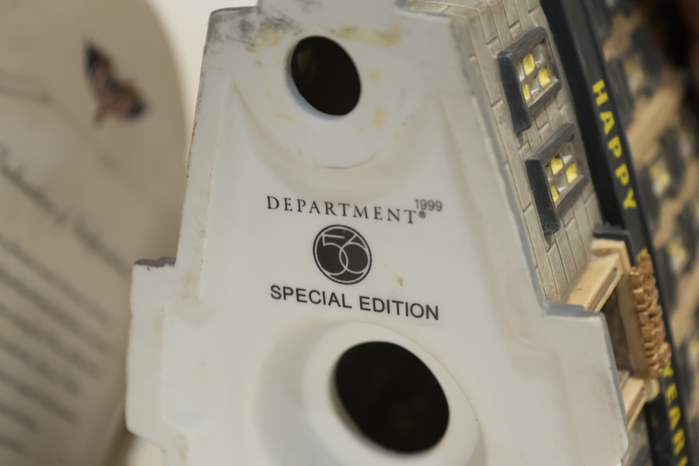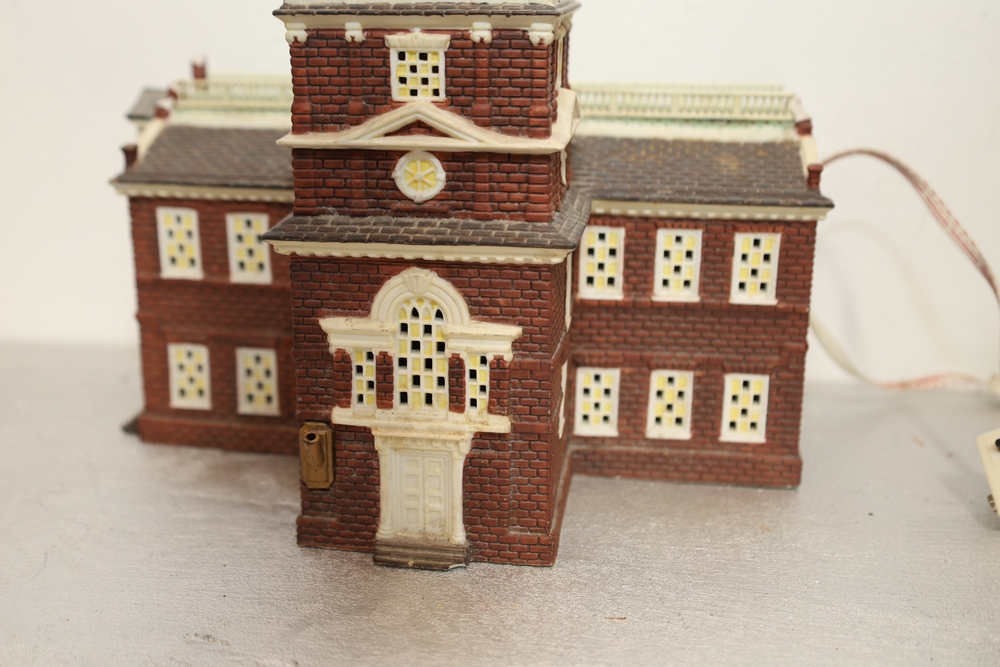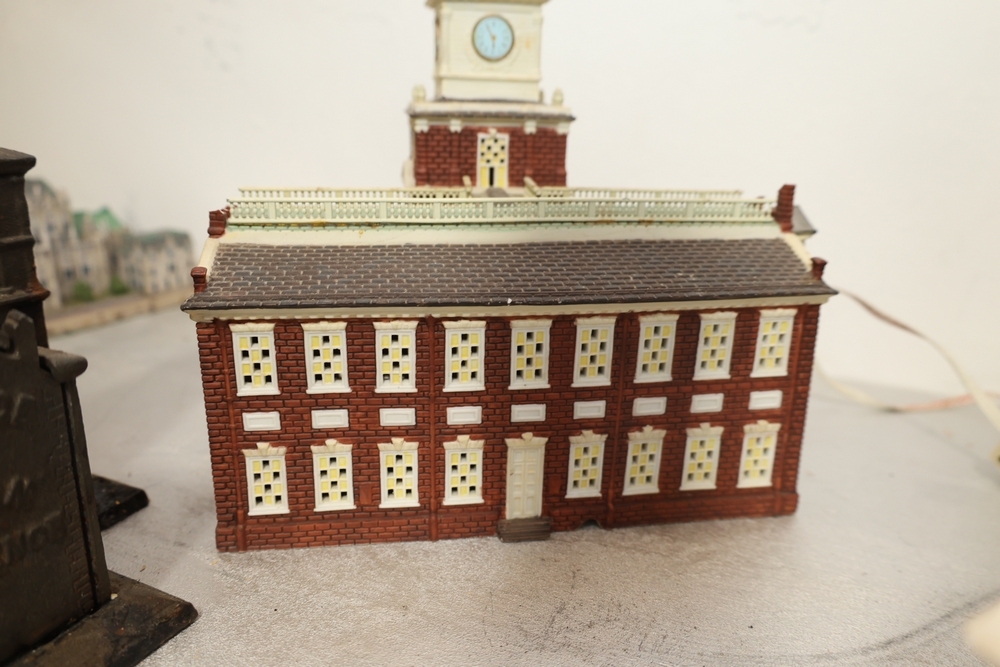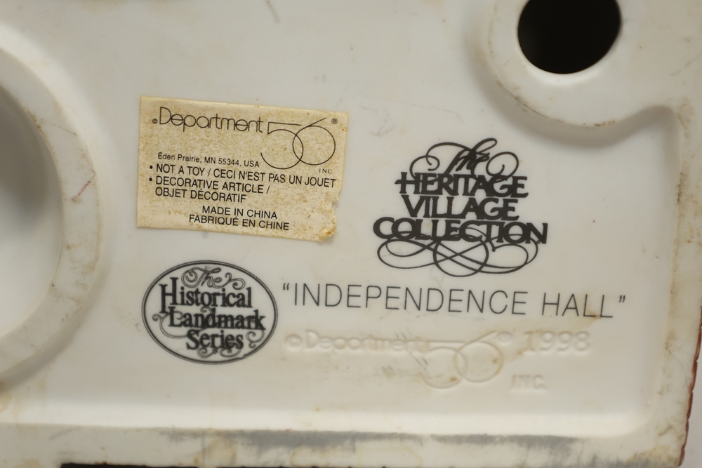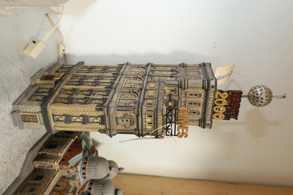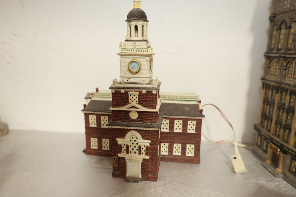 Department 56 lighted building decorations including American Pride Collection “The Jefferson Memorial” Department 2001 with Declaration of Independence panel, Heritage Village Collection Historical Landmark Series “Independence Hall” 1998, and Christmas In The City Series Special Edition “The Times Tower” 1999 with Happy New Year 2000 sign and Times sign, electrical cords present.