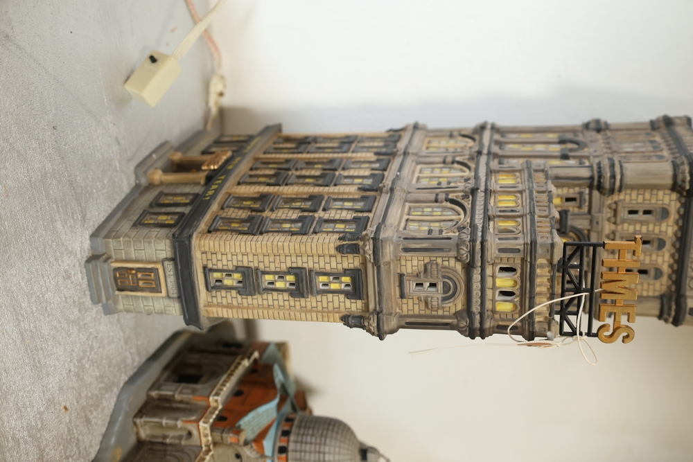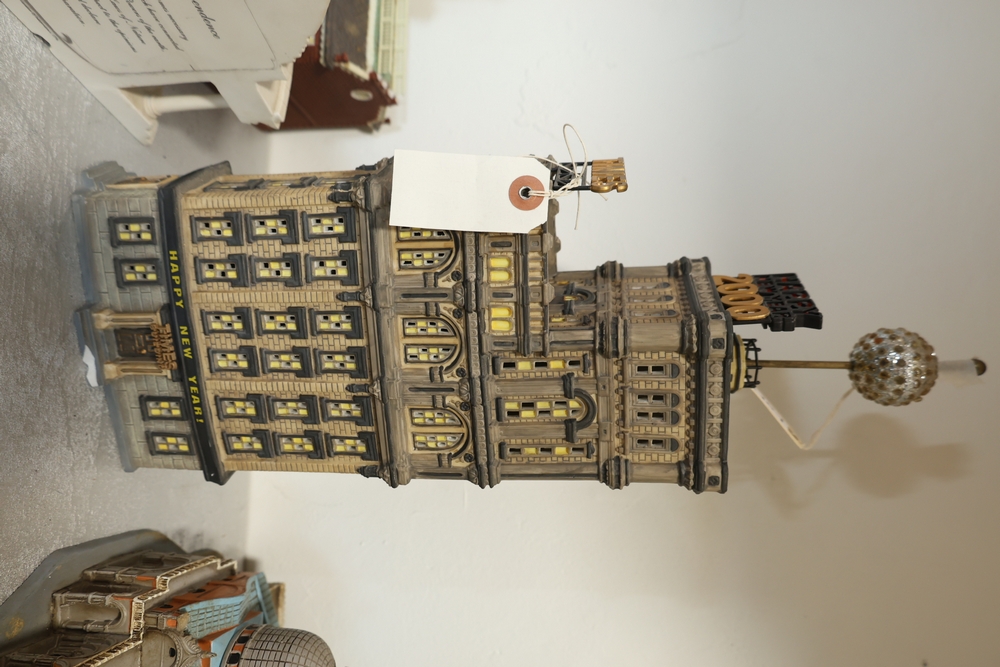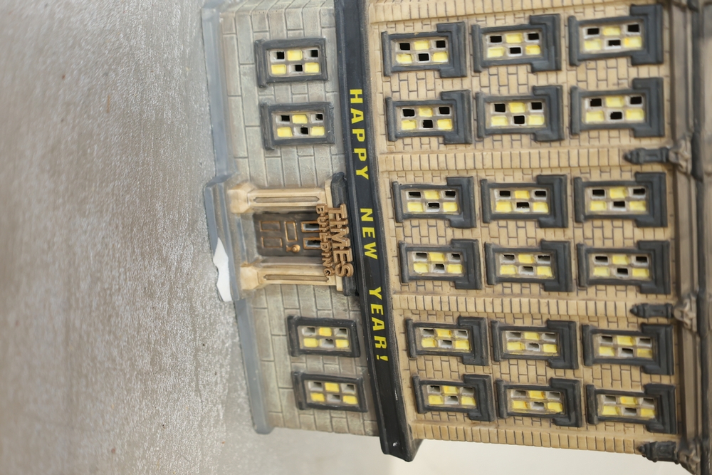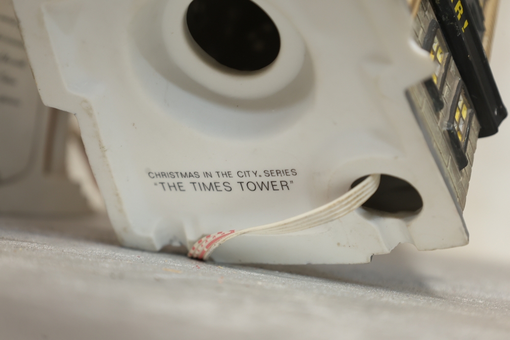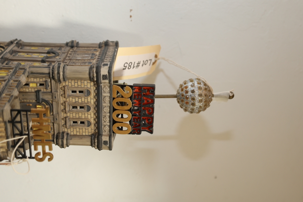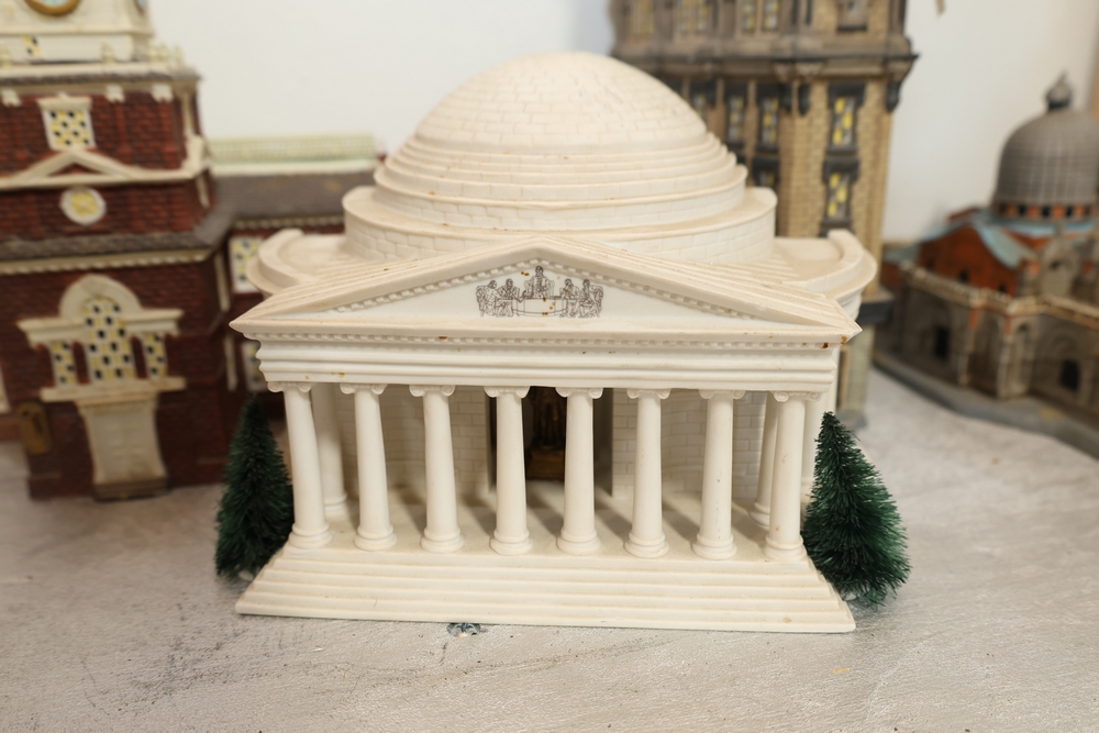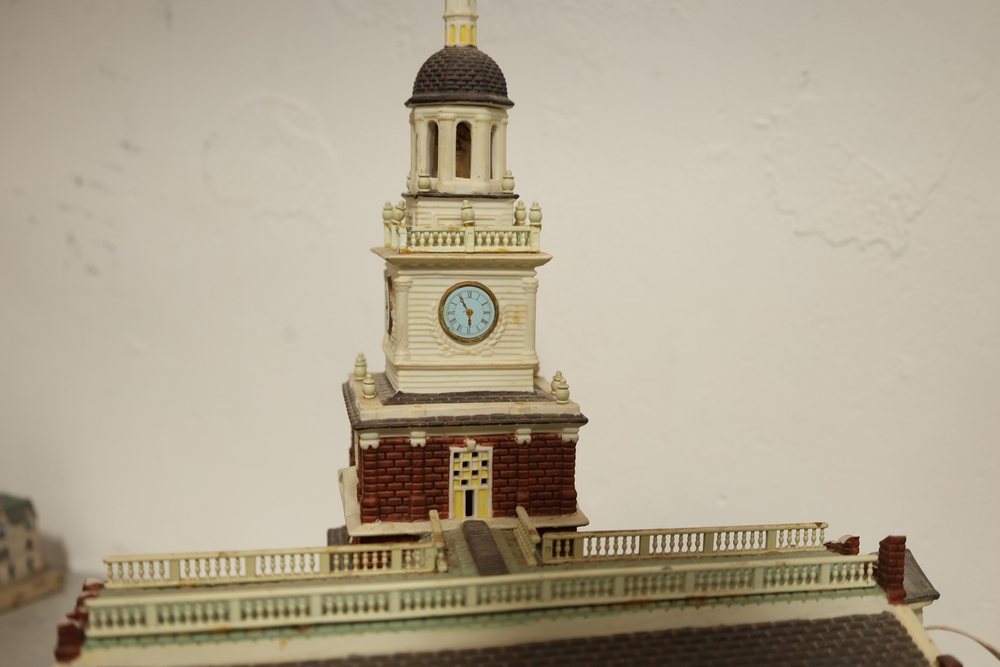 Department 56 lighted building decorations including American Pride Collection “The Jefferson Memorial” Department 2001 with Declaration of Independence panel, Heritage Village Collection Historical Landmark Series “Independence Hall” 1998, and Christmas In The City Series Special Edition “The Times Tower” 1999 with Happy New Year 2000 sign and Times sign, electrical cords present.