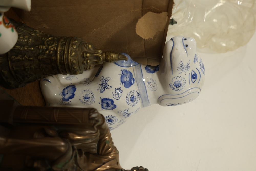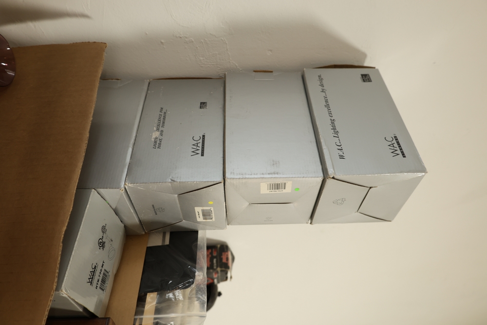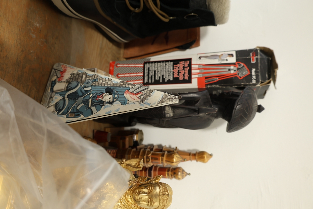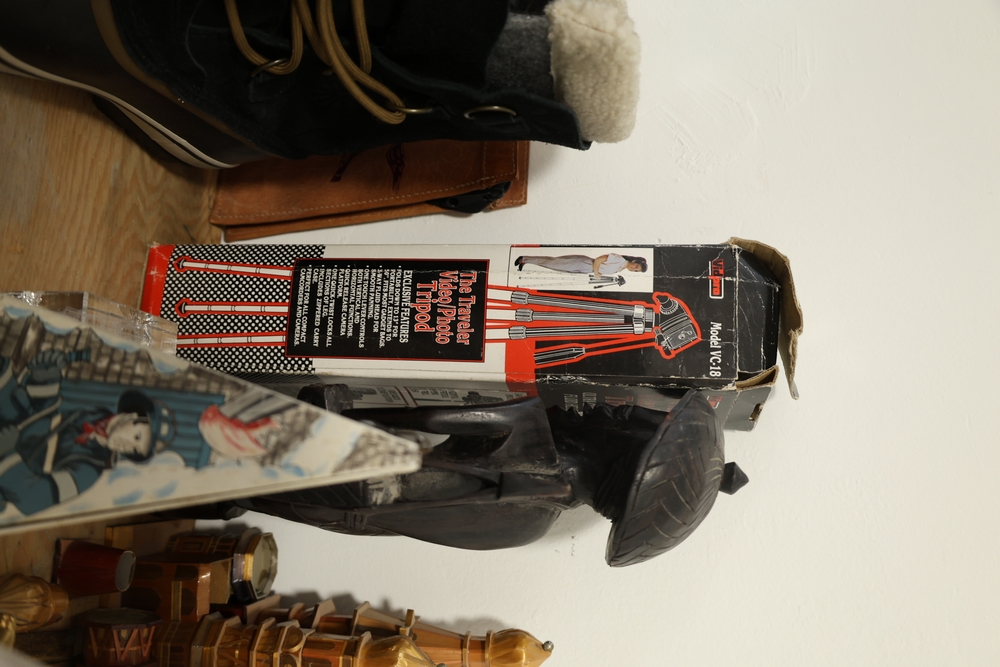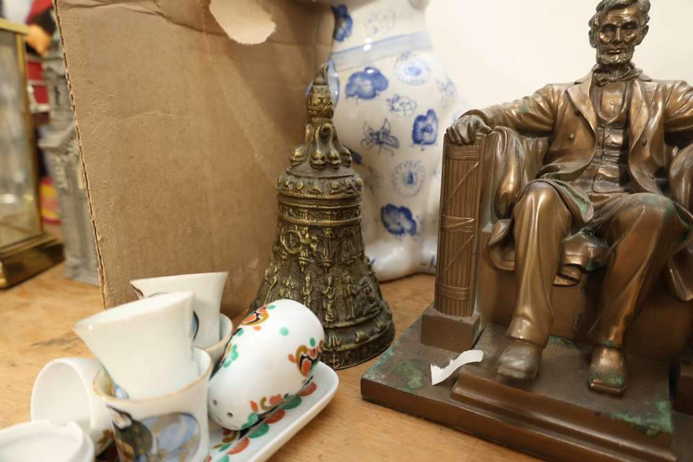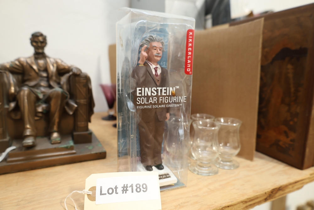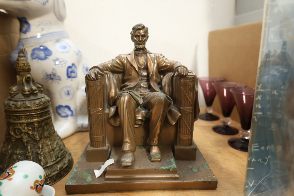 Mixed decorative and household items including ceramic dog figure with blue floral decoration, seated Abraham Lincoln figure, brass tone lidded vessel, small ceramic cups and tray set, Kikkerland Einstein Solar Figurine in package, four small stemmed glasses, wooden box with bird decoration, carved wood figures, several WAC Lighting boxes including model HTK-730-WT, Vidpro Model VC-18 Traveler Video Photo Tripod box, pair of lace up winter boots, and assorted decorative building models.