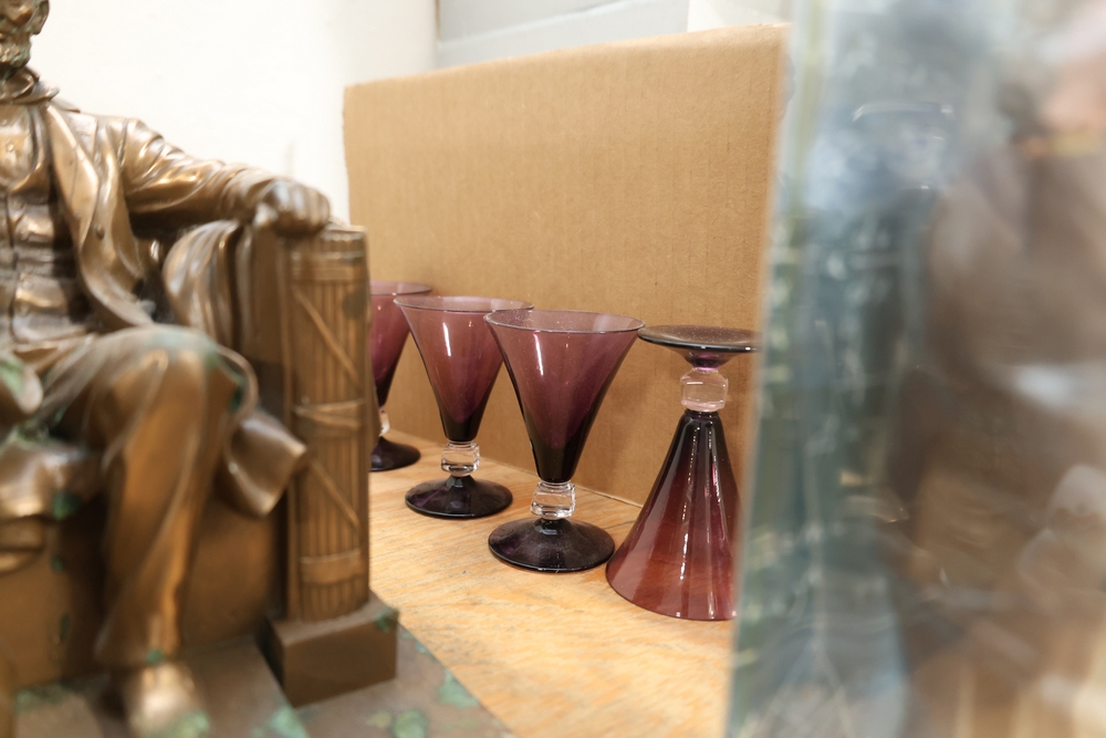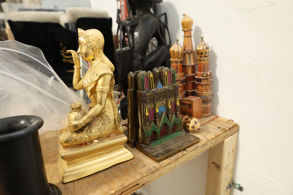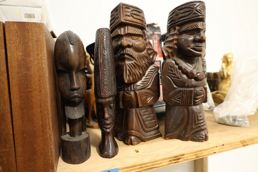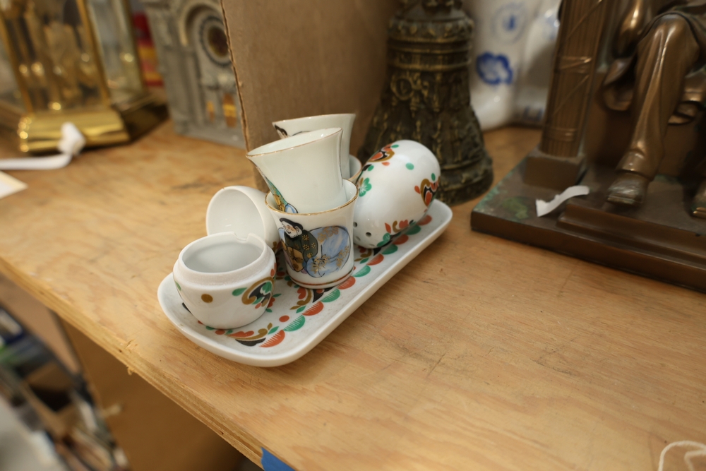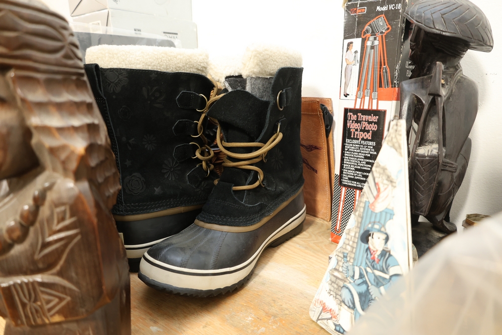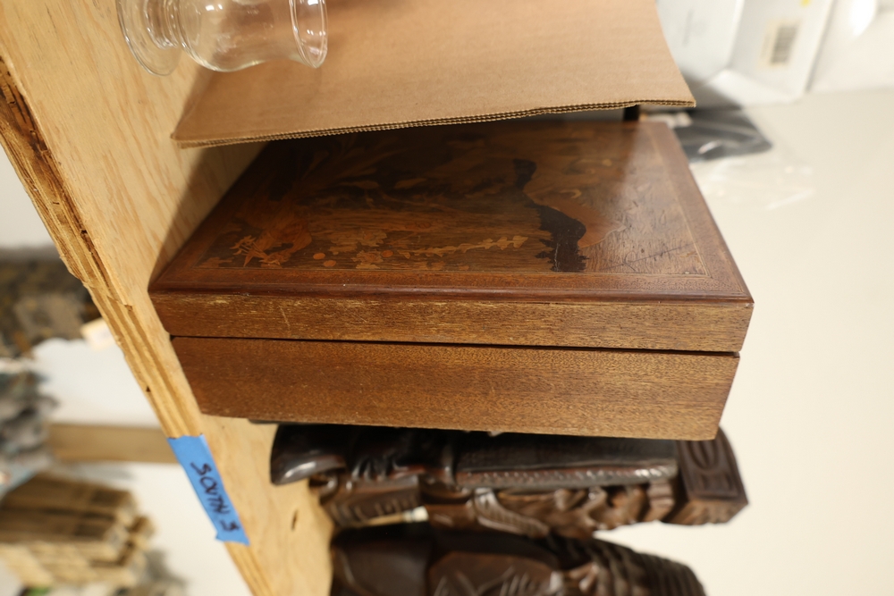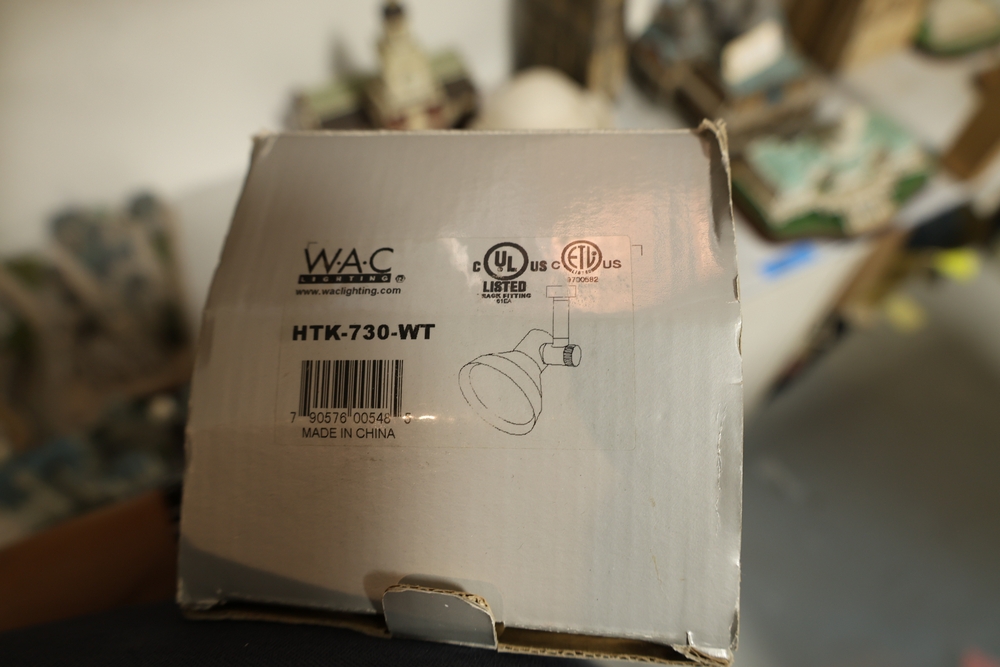 Mixed decorative and household items including ceramic dog figure with blue floral decoration, seated Abraham Lincoln figure, brass tone lidded vessel, small ceramic cups and tray set, Kikkerland Einstein Solar Figurine in package, four small stemmed glasses, wooden box with bird decoration, carved wood figures, several WAC Lighting boxes including model HTK-730-WT, Vidpro Model VC-18 Traveler Video Photo Tripod box, pair of lace up winter boots, and assorted decorative building models.