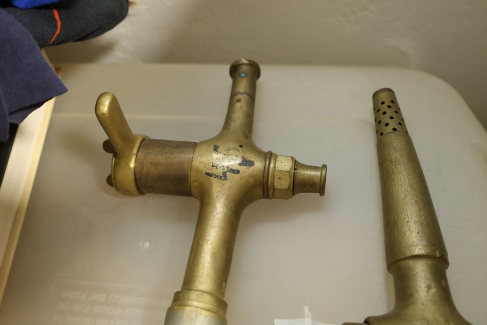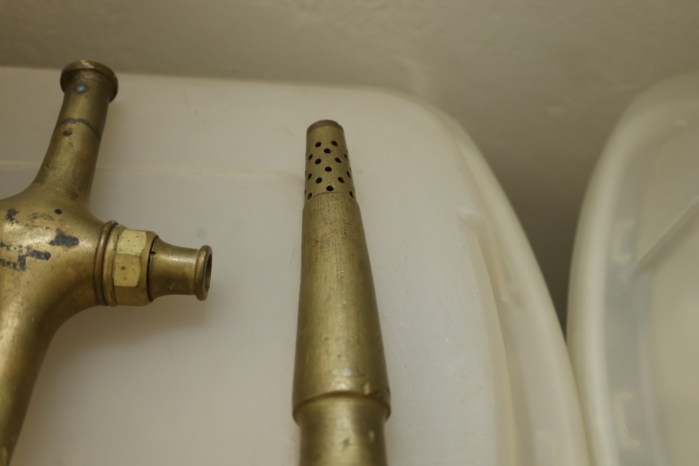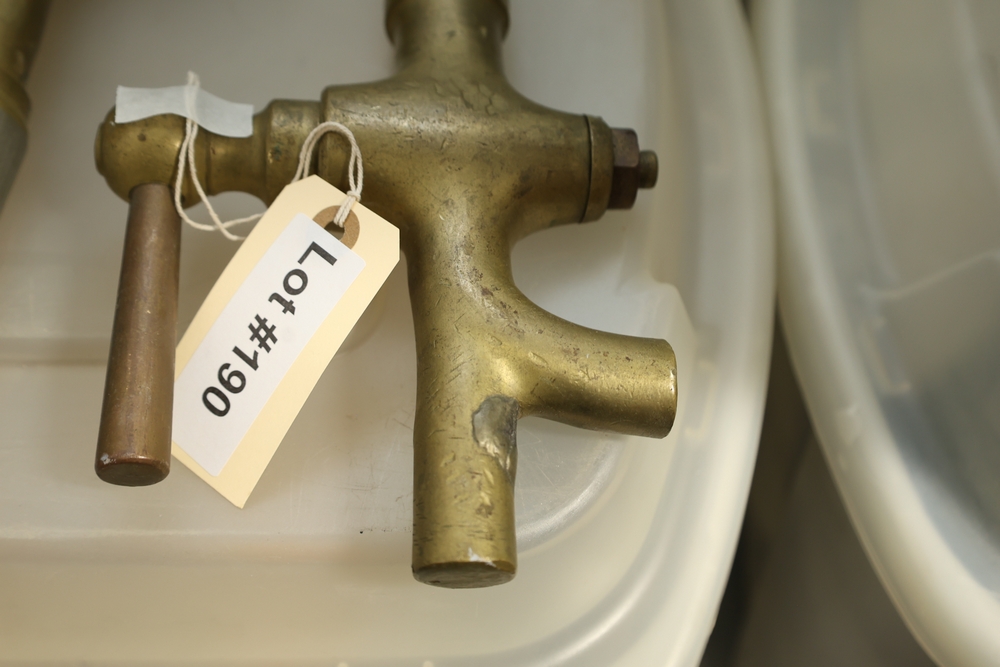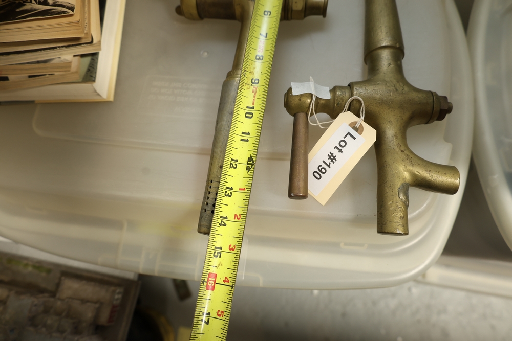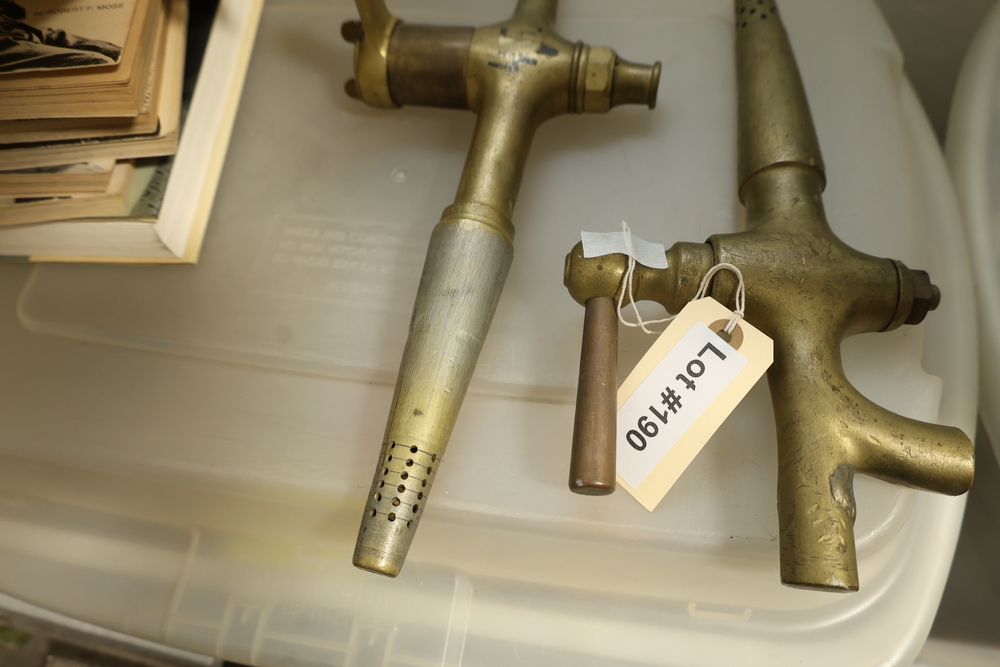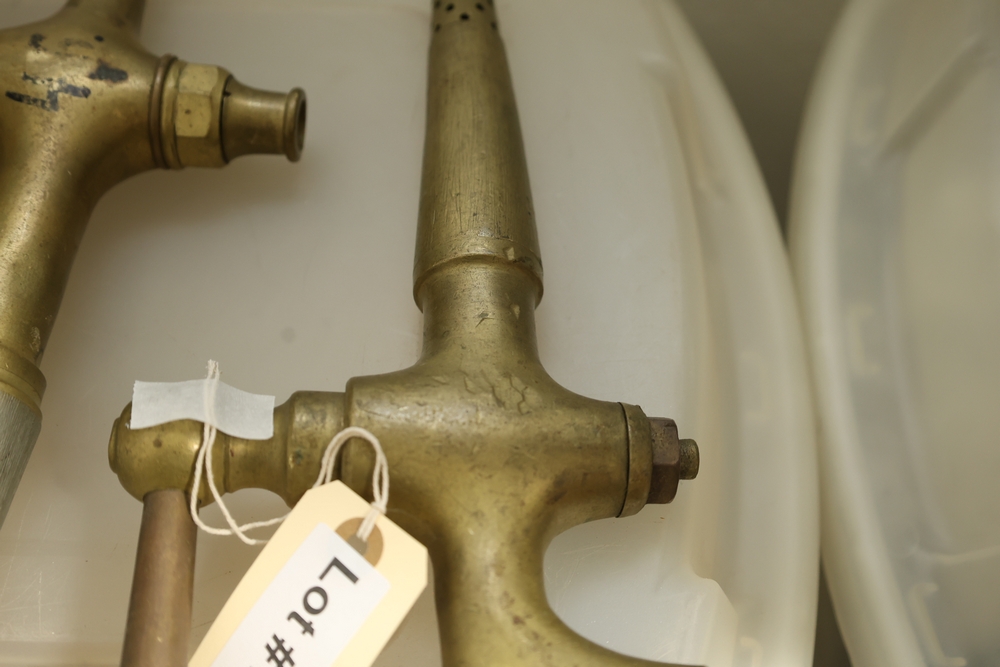 Two brass beverage tap assemblies with perforated spouts and lever handles, one with attached wooden handle and one with separate wooden handle piece, approximately 14 inches long.