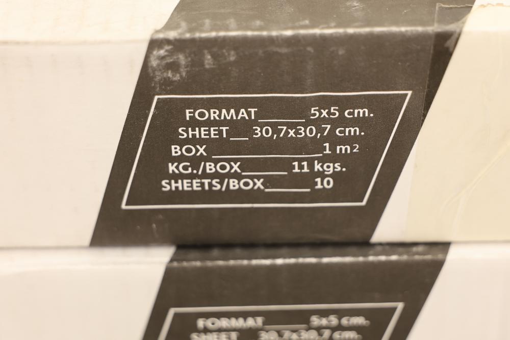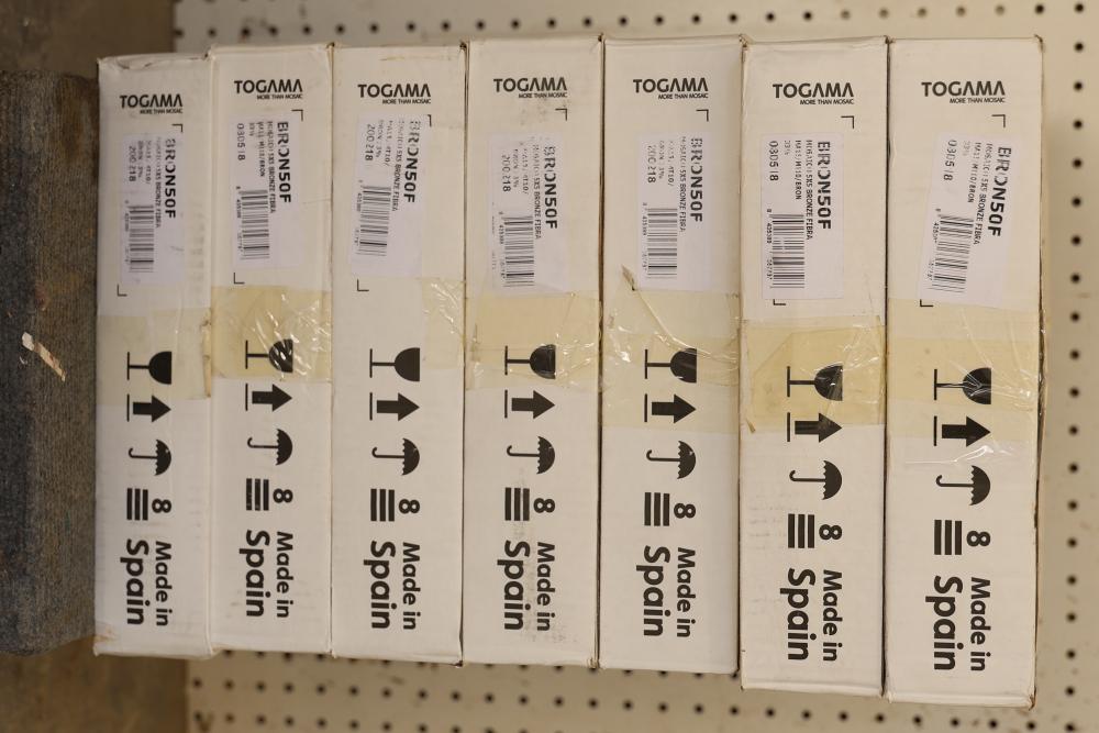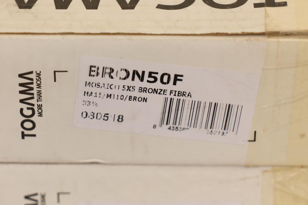 Seven boxes TOGAMA BRON50F mosaic tile labeled MOSAICO 5X5 BRONZE FIBRA, Made in Spain, each box marked 10 sheets per box with sheet size 30.7 x 30.7 cm and format 5 x 5 cm, total 70 sheets, approximately 75.32 sqft total. Sold by: Square Foot. Sold as: Price X Quantity. Sold by: Square Foot. Sold as: Price X Quantity.