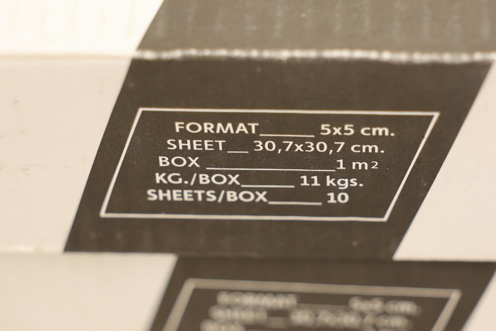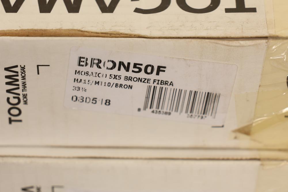 Seven boxes TOGAMA BRON50F mosaic tile labeled MOSAICO 5X5 BRONZE FIBRA, Made in Spain, each box marked 10 sheets per box with sheet size 30.7 x 30.7 cm and format 5 x 5 cm, total 70 sheets, approximately 75.32 sqft total. Sold by: Square Foot. Sold as: Price X Quantity. Sold by: Square Foot. Sold as: Price X Quantity.