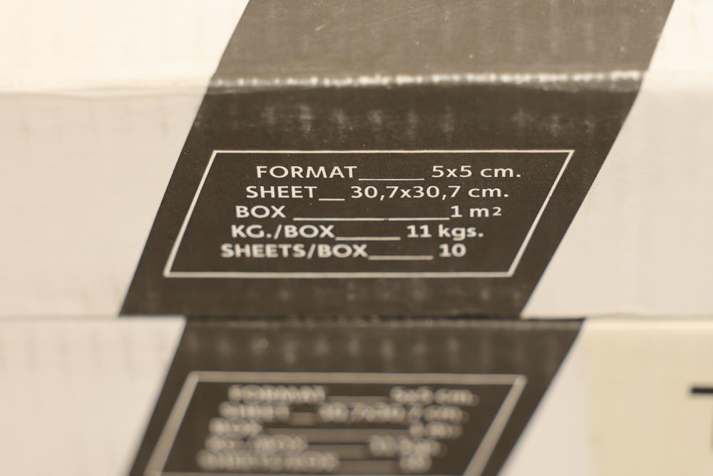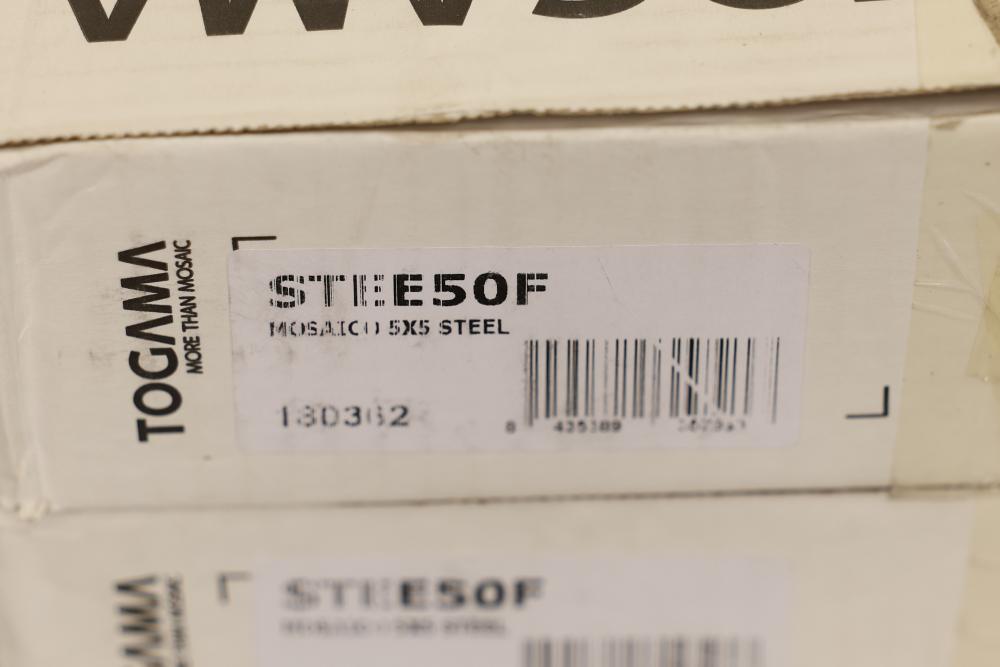 Seven boxes TOGAMA STEE50F mosaic tile labeled MOSAICO 5X5 STEEL, Made in Spain, each box marked 10 sheets per box with sheet size 30.7 x 30.7 cm and format 5 x 5 cm, total 70 sheets, approximately 75.32 sqft total. Sold by: Square Foot. Sold as: Price X Quantity. Sold by: Square Foot. Sold as: Price X Quantity.