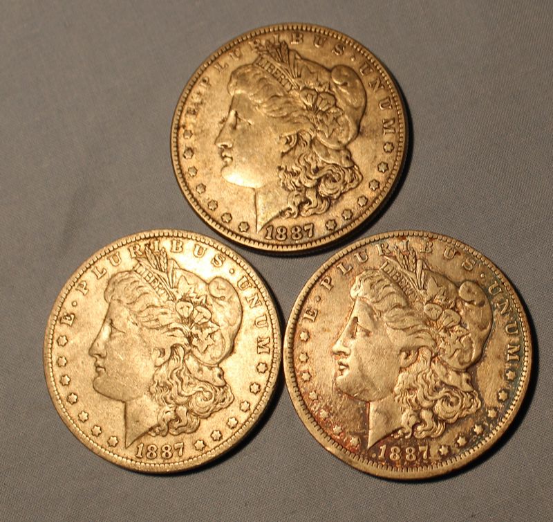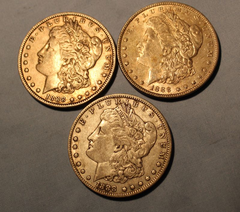 Six Morgan Silver Dollars including three 1887 (two "O") and three 1888 (one "O"). Shipping is available for this item.